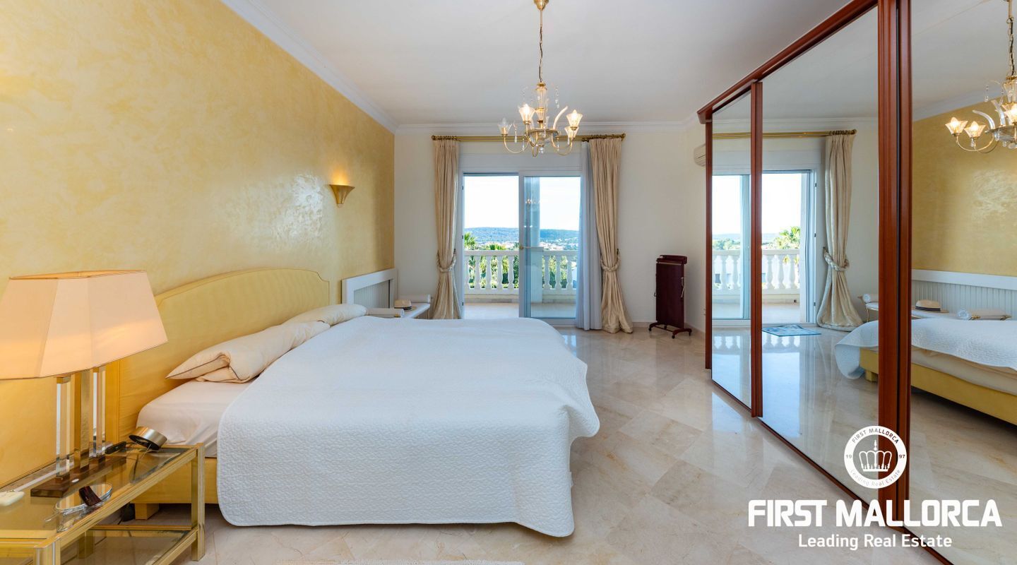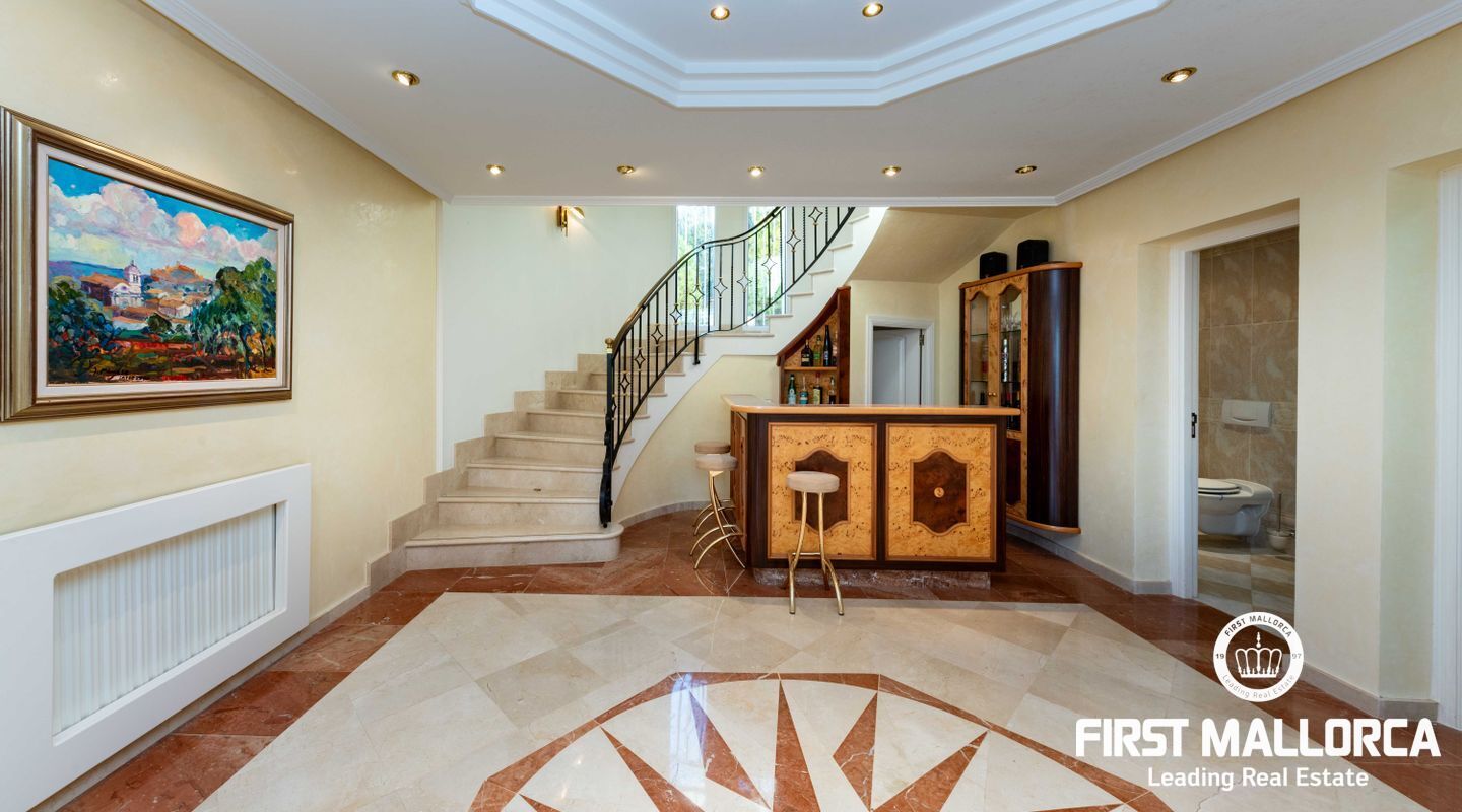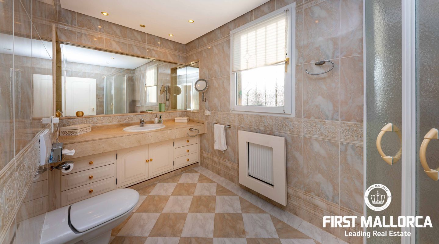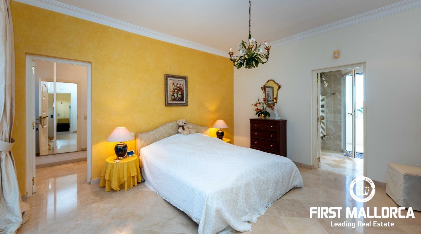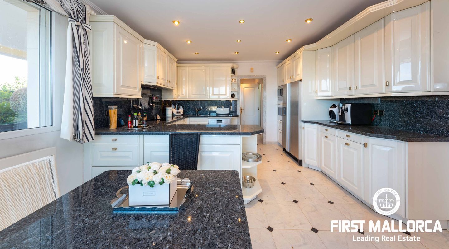 Esta villa con vistas al mar y acceso muy cómodo y llano se encuentra en una tranquila calle residencial en la montaña local de Nova Santa Ponsa y está rodeada de zonas verdes. La superficie construida es de más de 480m2, numerosas terrazas ofrecen espacio para relajarse, tomar el sol o para una acogedora noche de barbacoa junto a la piscina. La villa es muy elegante, con su mármol de color claro y muchas ventanas grandes, así como atractivas alturas de techo. El propietario y sus invitados tienen a su disposición un total de 5 dormitorios, 3 de ellos con baño en suite. Toda la casa dispone de calefacción central de gasoil y aire acondicionado adicional. Desde el garaje doble hay acceso sin barreras a la entrada principal con vestíbulo, desde aquí se llega a los 4 dormitorios, una hermosa escalera de mármol de ancho conduce a la planta principal, con un gran salón / comedor y cocina, también hay un dormitorio en suite aquí. Muchas puertas se abren a la terraza de la piscina y el jardín bellamente ajardinado. Una acción de golf para el Santa Ponsa II también está incluido en el precio, la piscina tiene calefacción.