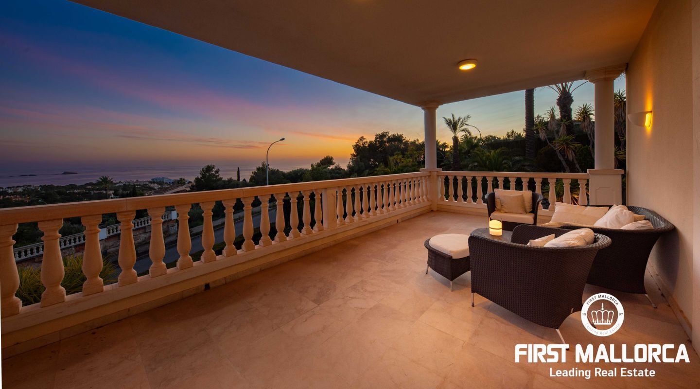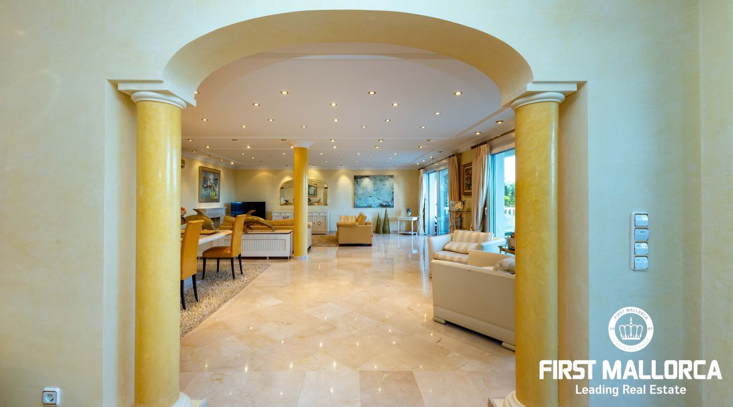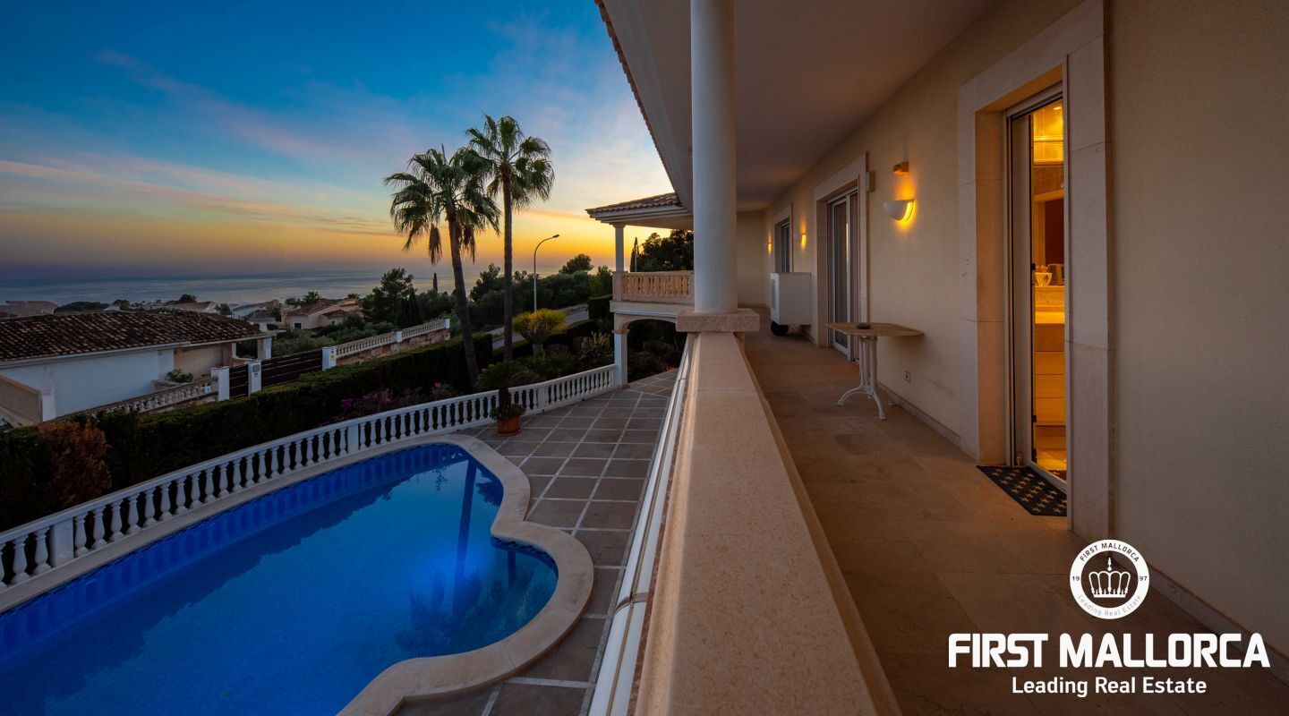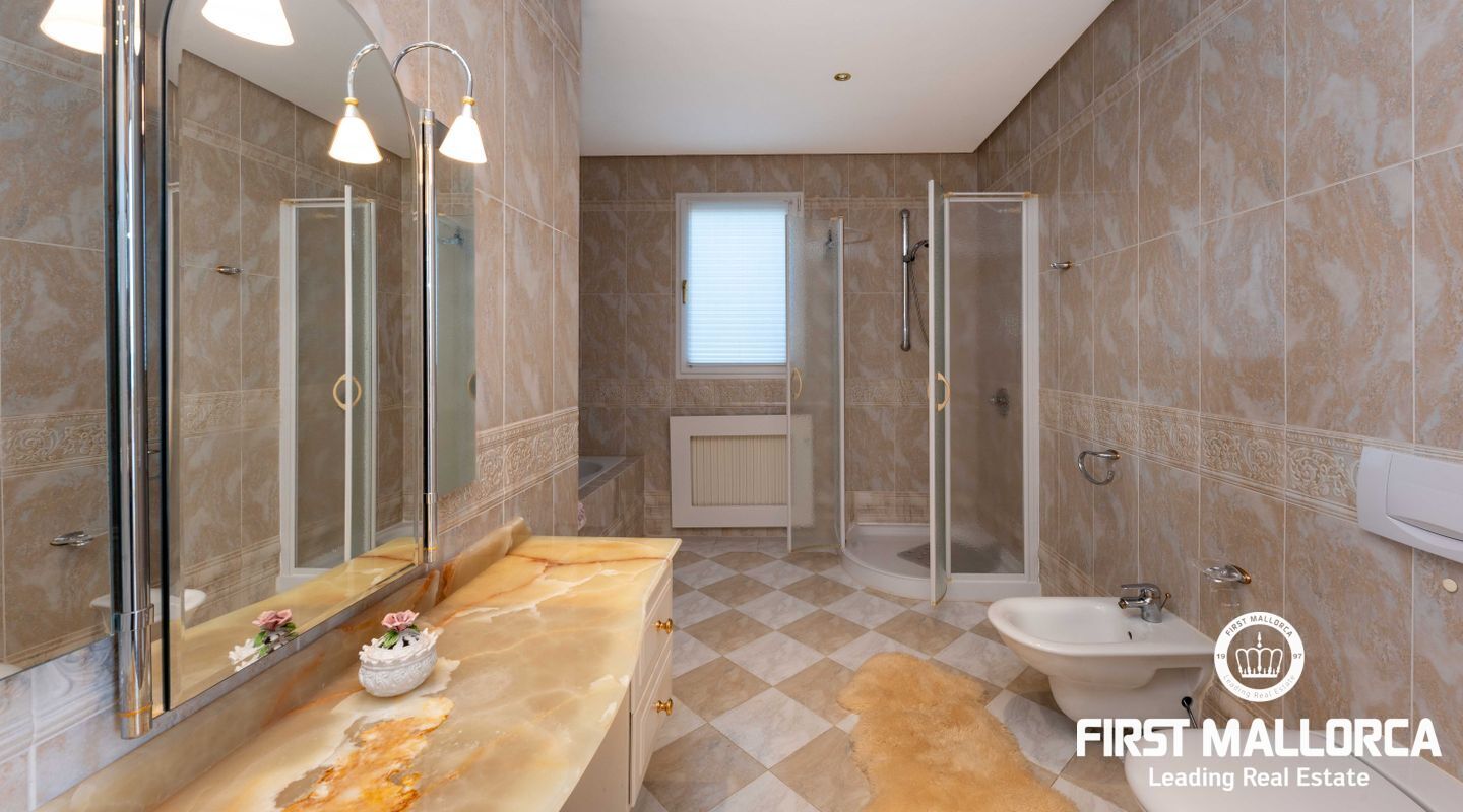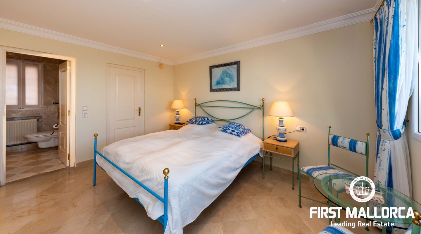 Esta villa con vistas al mar y acceso muy cómodo y llano se encuentra en una tranquila calle residencial en la montaña local de Nova Santa Ponsa y está rodeada de zonas verdes. La superficie construida es de más de 480m2, numerosas terrazas ofrecen espacio para relajarse, tomar el sol o para una acogedora noche de barbacoa junto a la piscina. La villa es muy elegante, con su mármol de color claro y muchas ventanas grandes, así como atractivas alturas de techo. El propietario y sus invitados tienen a su disposición un total de 5 dormitorios, 3 de ellos con baño en suite. Toda la casa dispone de calefacción central de gasoil y aire acondicionado adicional. Desde el garaje doble hay acceso sin barreras a la entrada principal con vestíbulo, desde aquí se llega a los 4 dormitorios, una hermosa escalera de mármol de ancho conduce a la planta principal, con un gran salón / comedor y cocina, también hay un dormitorio en suite aquí. Muchas puertas se abren a la terraza de la piscina y el jardín bellamente ajardinado. Una acción de golf para el Santa Ponsa II también está incluido en el precio, la piscina tiene calefacción.