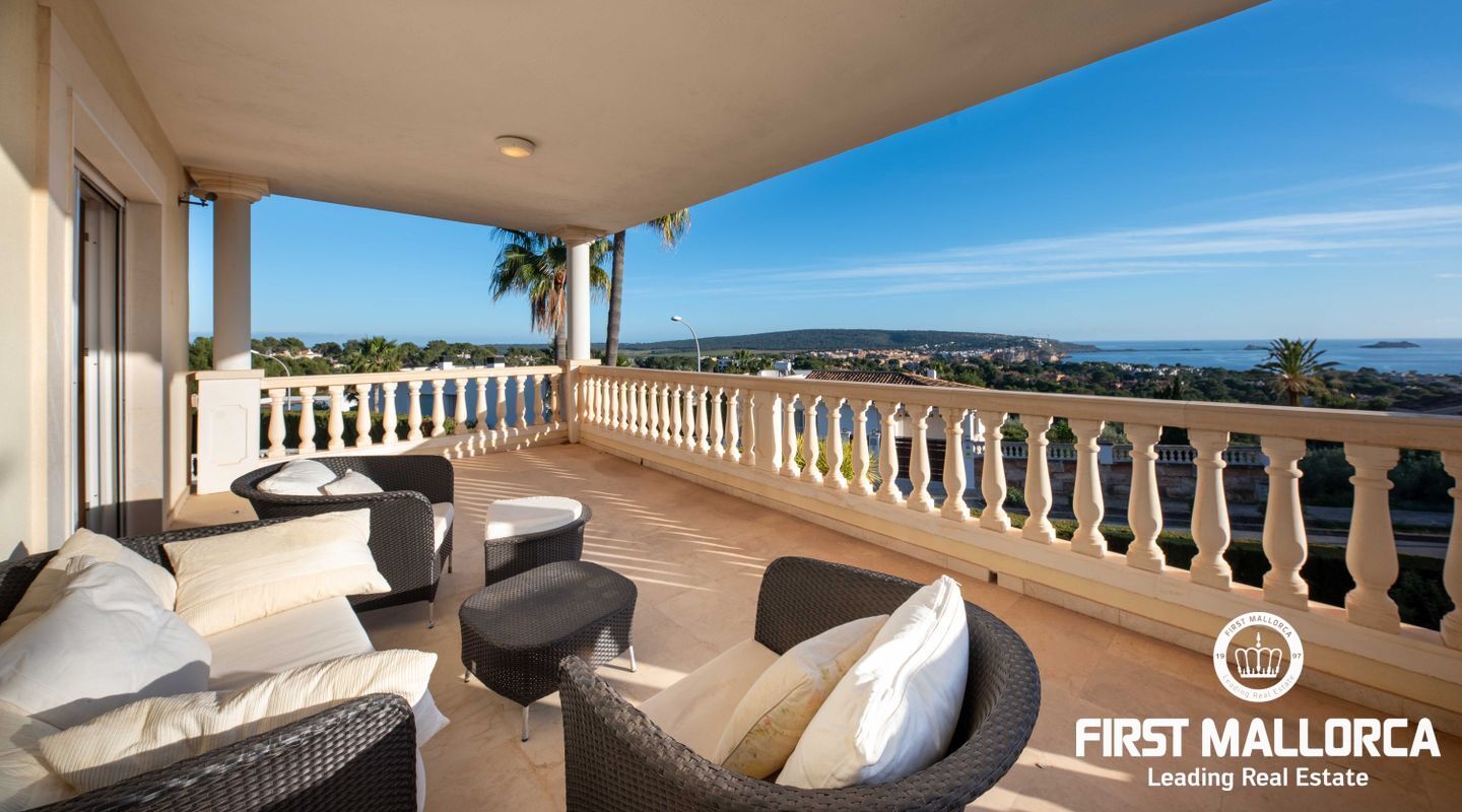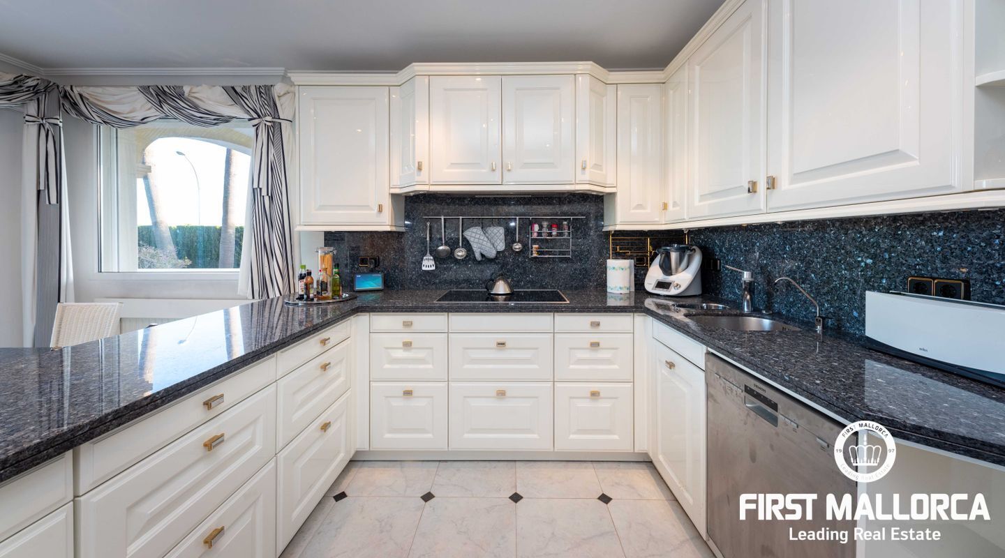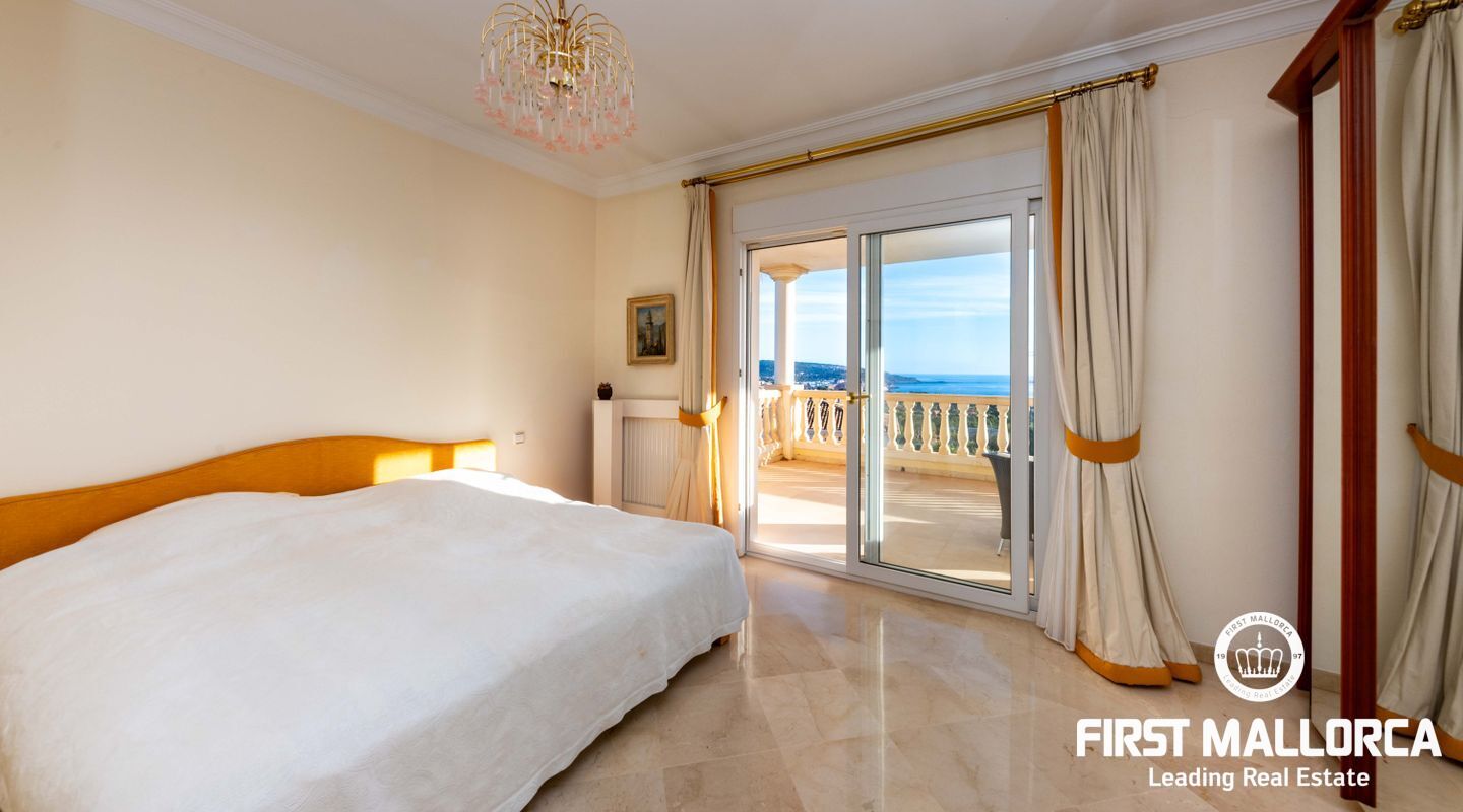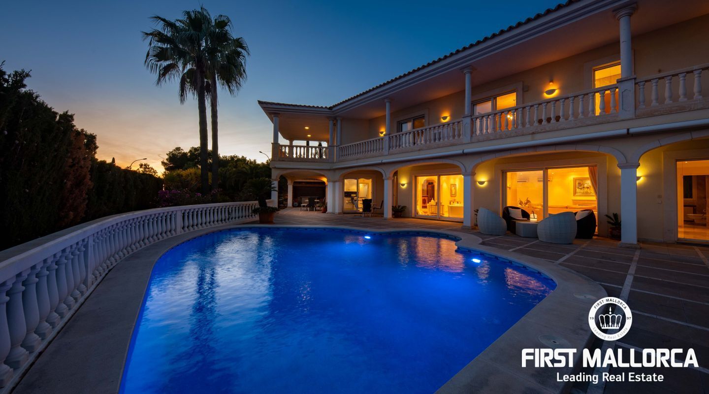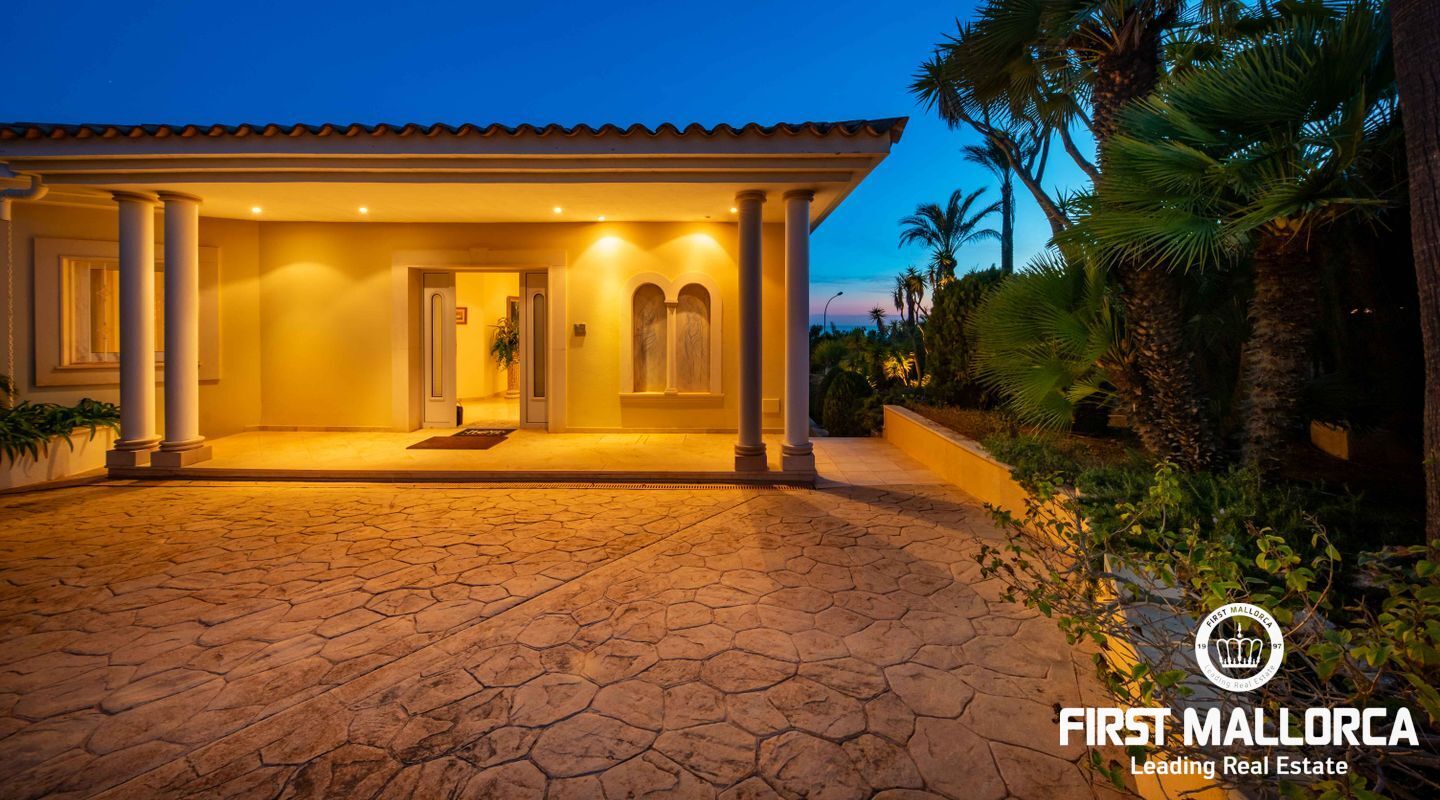 Esta villa con vistas al mar y acceso muy cómodo y llano se encuentra en una tranquila calle residencial en la montaña local de Nova Santa Ponsa y está rodeada de zonas verdes. La superficie construida es de más de 480m2, numerosas terrazas ofrecen espacio para relajarse, tomar el sol o para una acogedora noche de barbacoa junto a la piscina. La villa es muy elegante, con su mármol de color claro y muchas ventanas grandes, así como atractivas alturas de techo. El propietario y sus invitados tienen a su disposición un total de 5 dormitorios, 3 de ellos con baño en suite. Toda la casa dispone de calefacción central de gasoil y aire acondicionado adicional. Desde el garaje doble hay acceso sin barreras a la entrada principal con vestíbulo, desde aquí se llega a los 4 dormitorios, una hermosa escalera de mármol de ancho conduce a la planta principal, con un gran salón / comedor y cocina, también hay un dormitorio en suite aquí. Muchas puertas se abren a la terraza de la piscina y el jardín bellamente ajardinado. Una acción de golf para el Santa Ponsa II también está incluido en el precio, la piscina tiene calefacción.