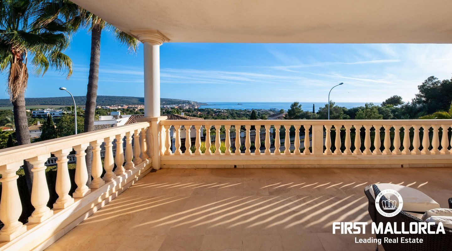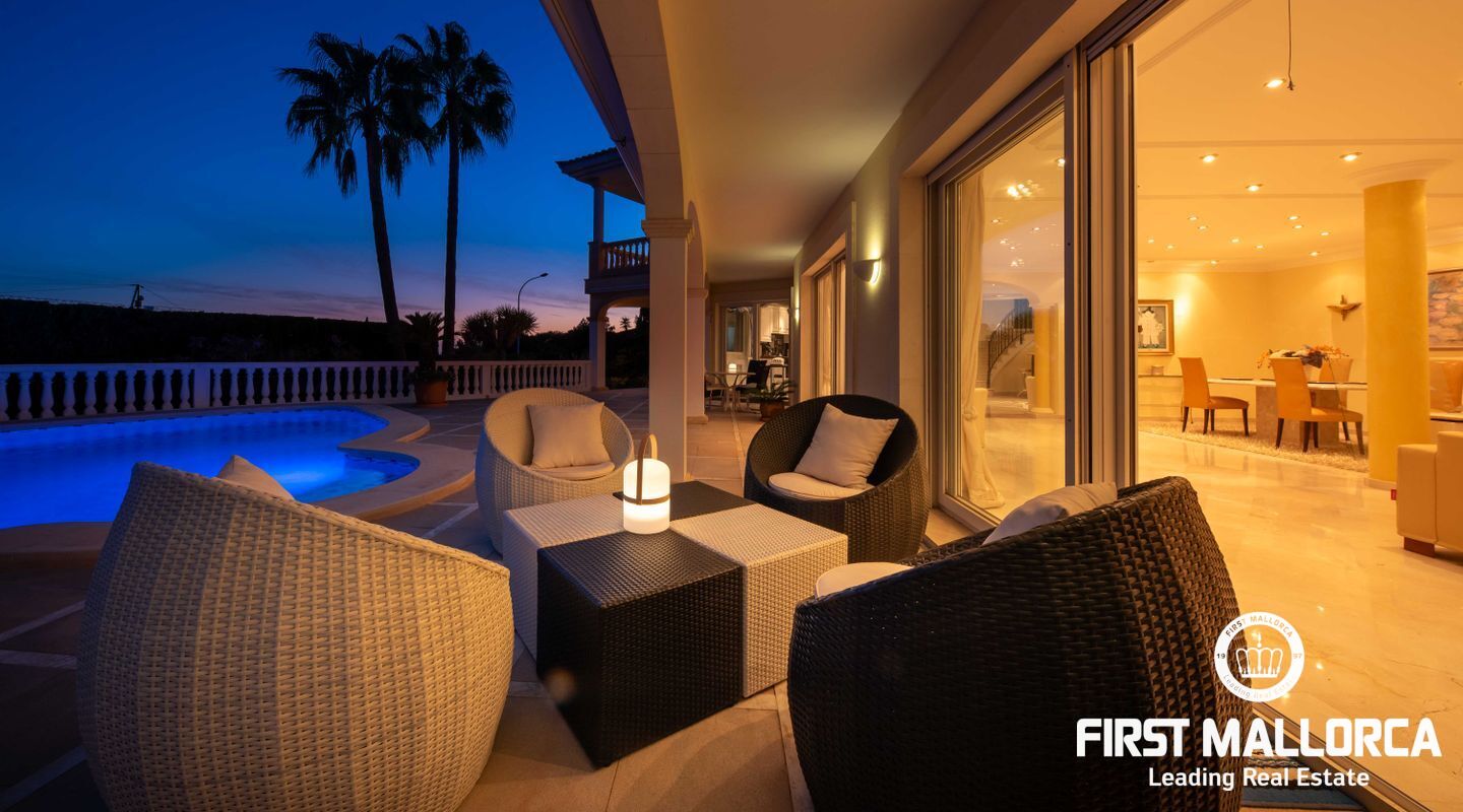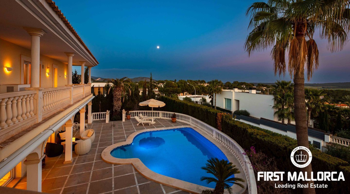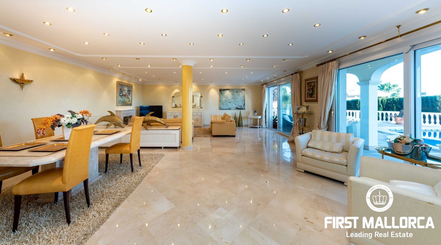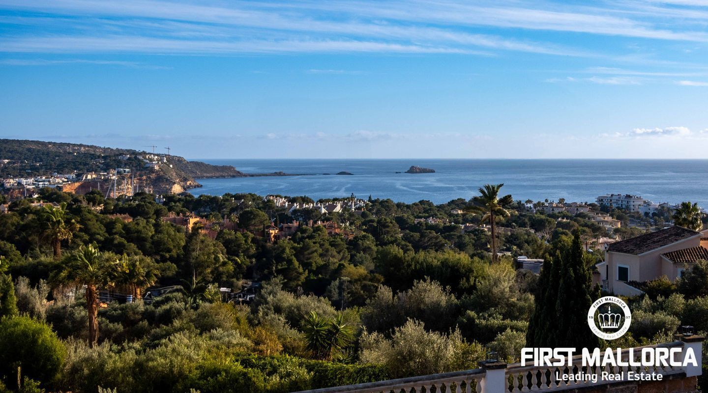 Esta villa con vistas al mar y acceso muy cómodo y llano se encuentra en una tranquila calle residencial en la montaña local de Nova Santa Ponsa y está rodeada de zonas verdes. La superficie construida es de más de 480m2, numerosas terrazas ofrecen espacio para relajarse, tomar el sol o para una acogedora noche de barbacoa junto a la piscina. La villa es muy elegante, con su mármol de color claro y muchas ventanas grandes, así como atractivas alturas de techo. El propietario y sus invitados tienen a su disposición un total de 5 dormitorios, 3 de ellos con baño en suite. Toda la casa dispone de calefacción central de gasoil y aire acondicionado adicional. Desde el garaje doble hay acceso sin barreras a la entrada principal con vestíbulo, desde aquí se llega a los 4 dormitorios, una hermosa escalera de mármol de ancho conduce a la planta principal, con un gran salón / comedor y cocina, también hay un dormitorio en suite aquí. Muchas puertas se abren a la terraza de la piscina y el jardín bellamente ajardinado. Una acción de golf para el Santa Ponsa II también está incluido en el precio, la piscina tiene calefacción.