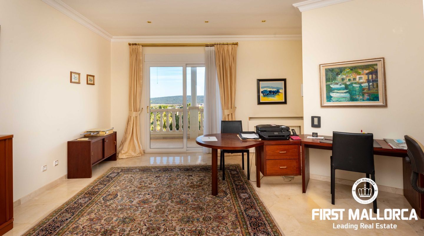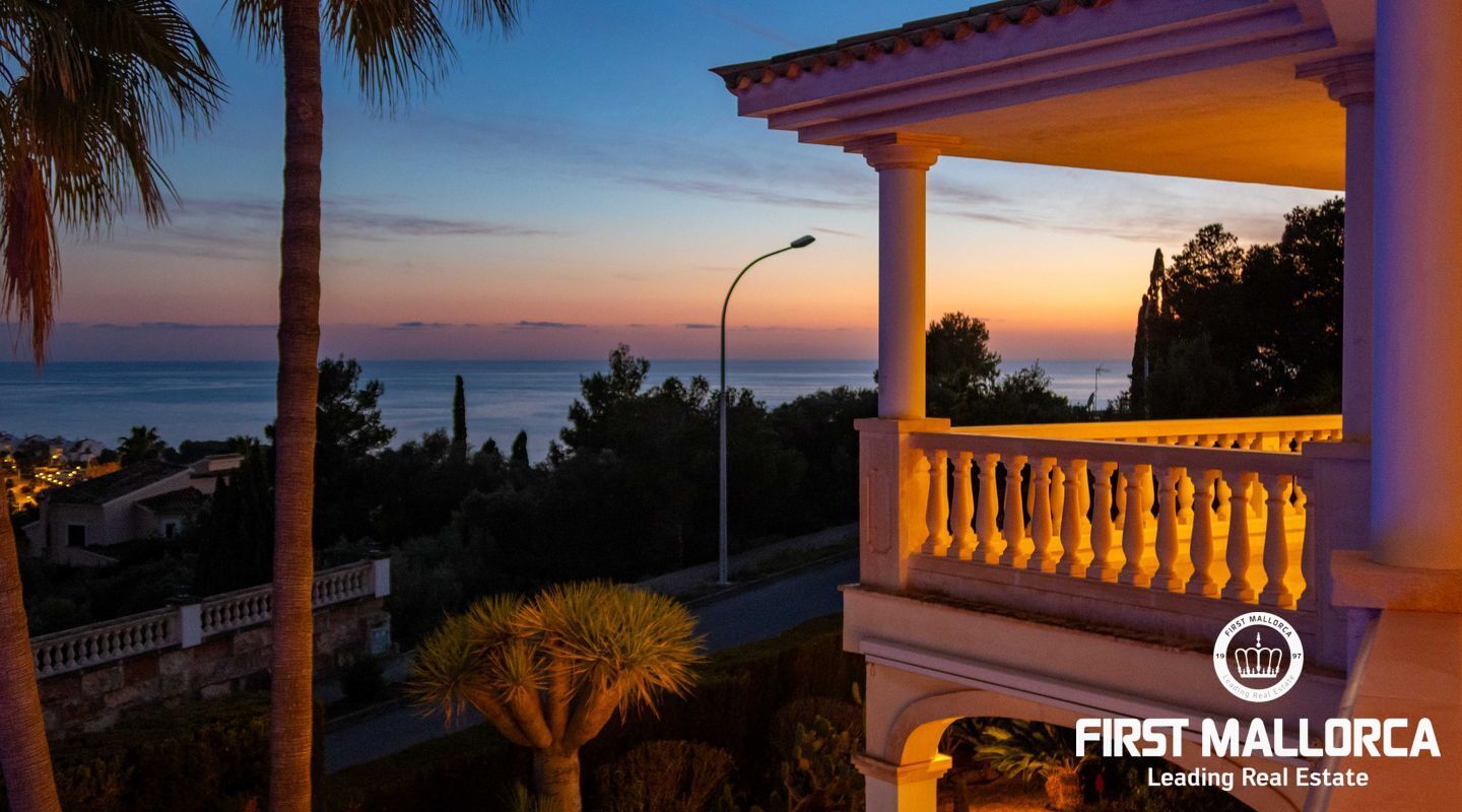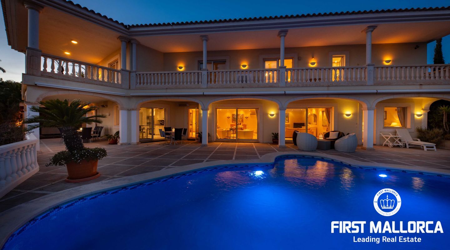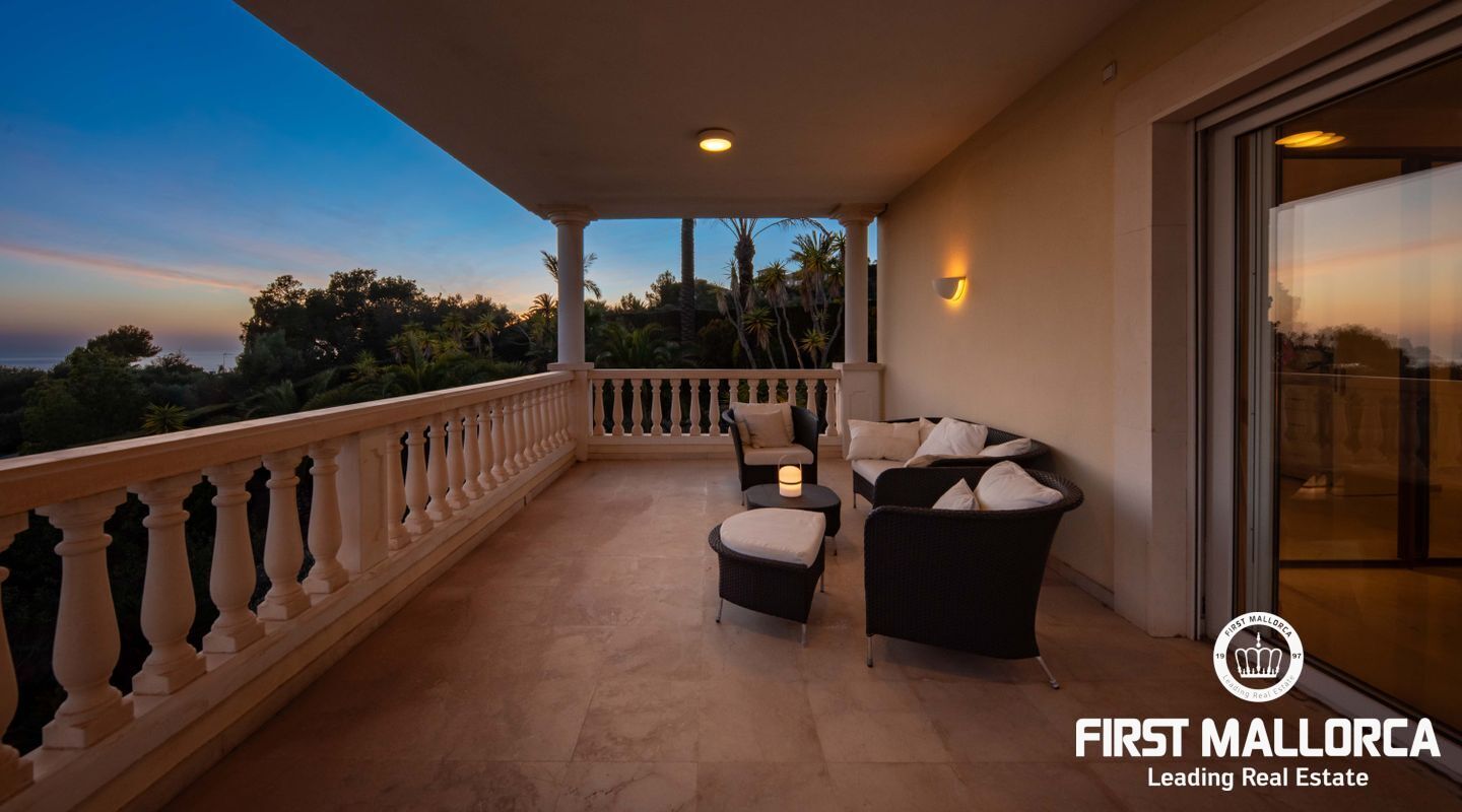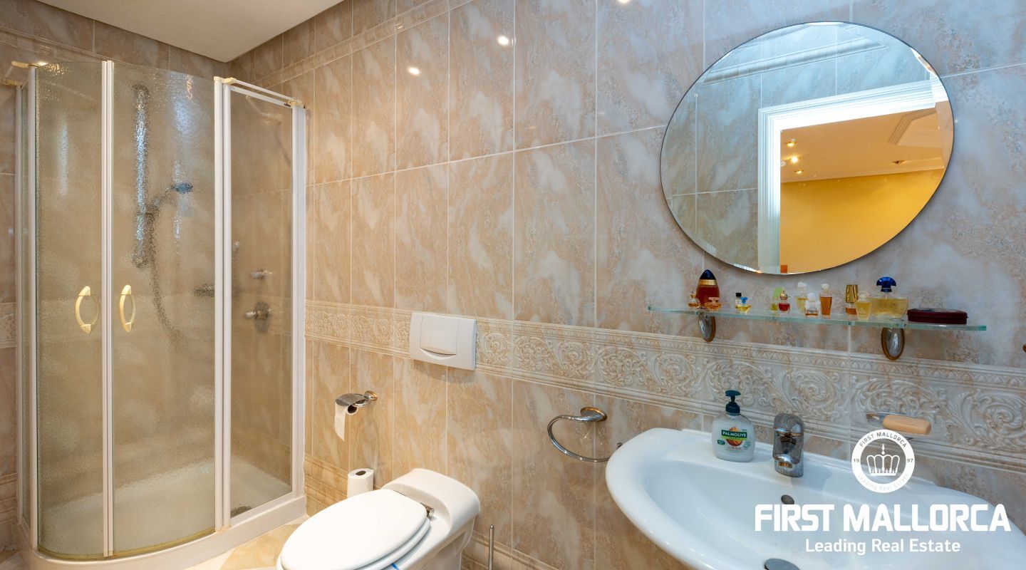 Esta villa con vistas al mar y acceso muy cómodo y llano se encuentra en una tranquila calle residencial en la montaña local de Nova Santa Ponsa y está rodeada de zonas verdes. La superficie construida es de más de 480m2, numerosas terrazas ofrecen espacio para relajarse, tomar el sol o para una acogedora noche de barbacoa junto a la piscina. La villa es muy elegante, con su mármol de color claro y muchas ventanas grandes, así como atractivas alturas de techo. El propietario y sus invitados tienen a su disposición un total de 5 dormitorios, 3 de ellos con baño en suite. Toda la casa dispone de calefacción central de gasoil y aire acondicionado adicional. Desde el garaje doble hay acceso sin barreras a la entrada principal con vestíbulo, desde aquí se llega a los 4 dormitorios, una hermosa escalera de mármol de ancho conduce a la planta principal, con un gran salón / comedor y cocina, también hay un dormitorio en suite aquí. Muchas puertas se abren a la terraza de la piscina y el jardín bellamente ajardinado. Una acción de golf para el Santa Ponsa II también está incluido en el precio, la piscina tiene calefacción.