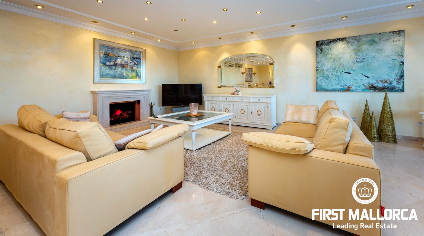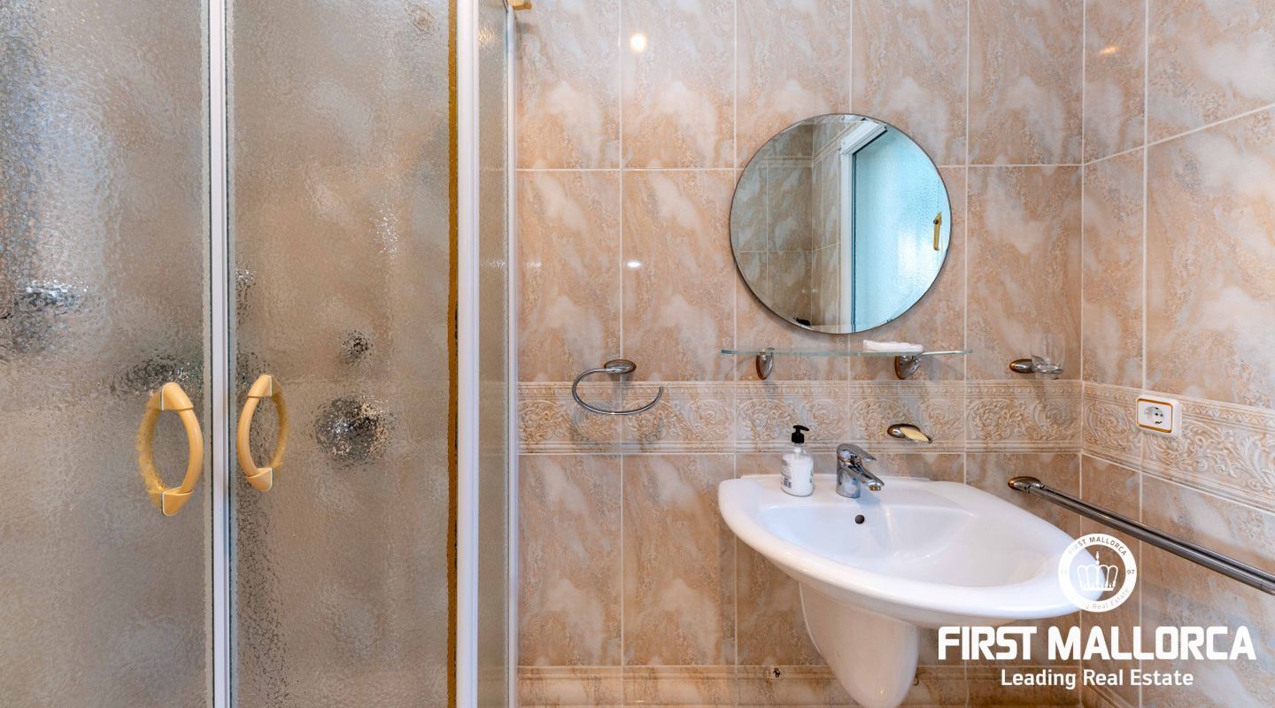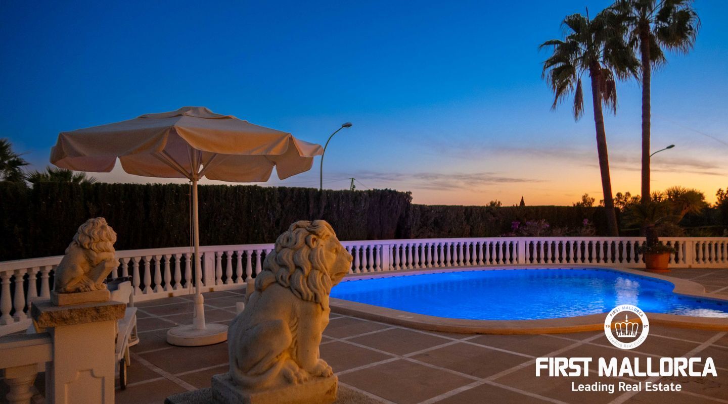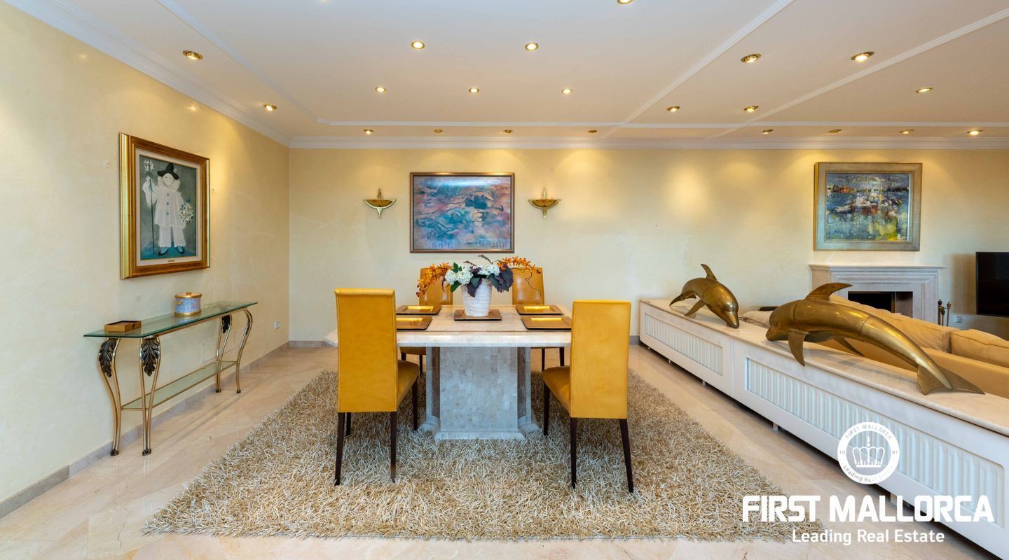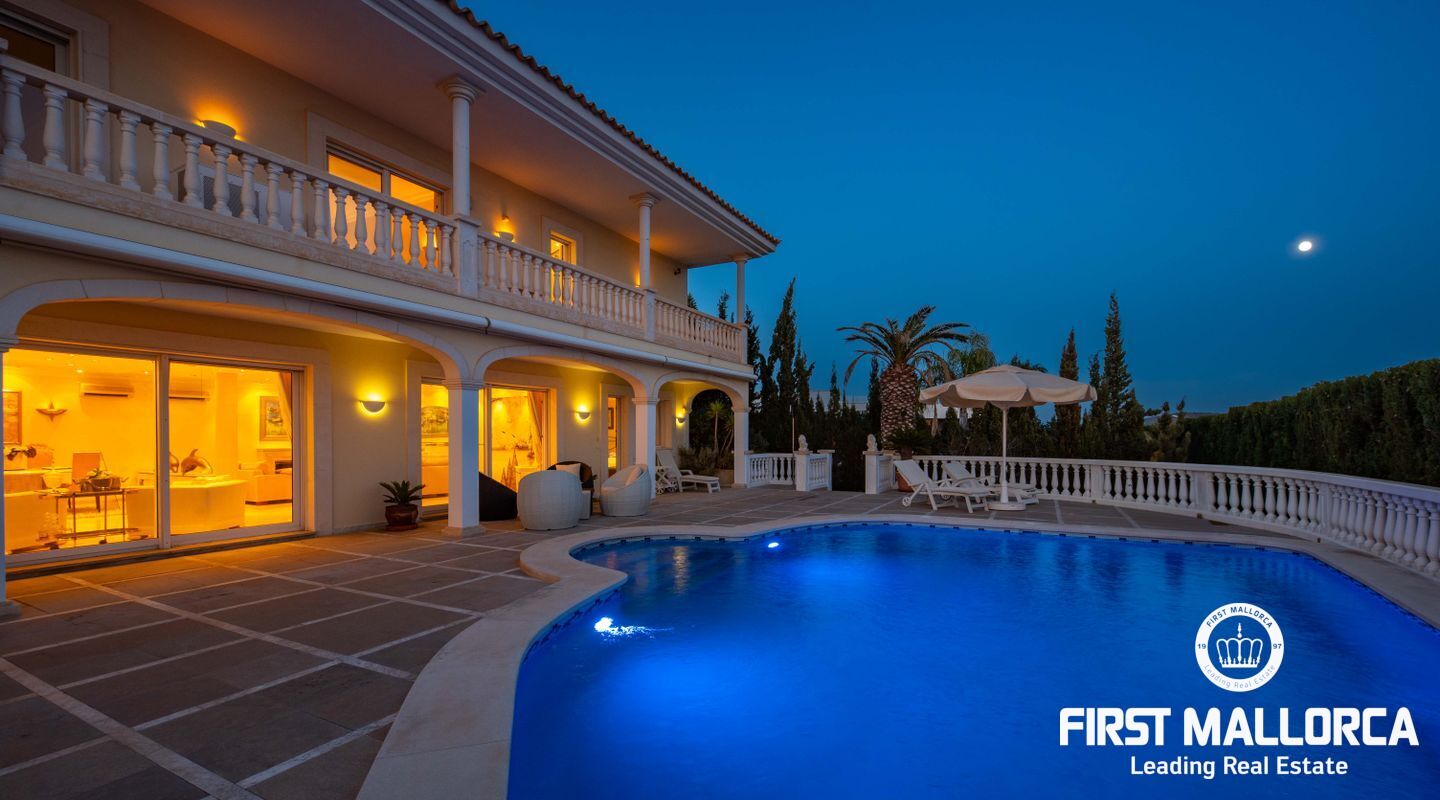 Esta villa con vistas al mar y acceso muy cómodo y llano se encuentra en una tranquila calle residencial en la montaña local de Nova Santa Ponsa y está rodeada de zonas verdes. La superficie construida es de más de 480m2, numerosas terrazas ofrecen espacio para relajarse, tomar el sol o para una acogedora noche de barbacoa junto a la piscina. La villa es muy elegante, con su mármol de color claro y muchas ventanas grandes, así como atractivas alturas de techo. El propietario y sus invitados tienen a su disposición un total de 5 dormitorios, 3 de ellos con baño en suite. Toda la casa dispone de calefacción central de gasoil y aire acondicionado adicional. Desde el garaje doble hay acceso sin barreras a la entrada principal con vestíbulo, desde aquí se llega a los 4 dormitorios, una hermosa escalera de mármol de ancho conduce a la planta principal, con un gran salón / comedor y cocina, también hay un dormitorio en suite aquí. Muchas puertas se abren a la terraza de la piscina y el jardín bellamente ajardinado. Una acción de golf para el Santa Ponsa II también está incluido en el precio, la piscina tiene calefacción.