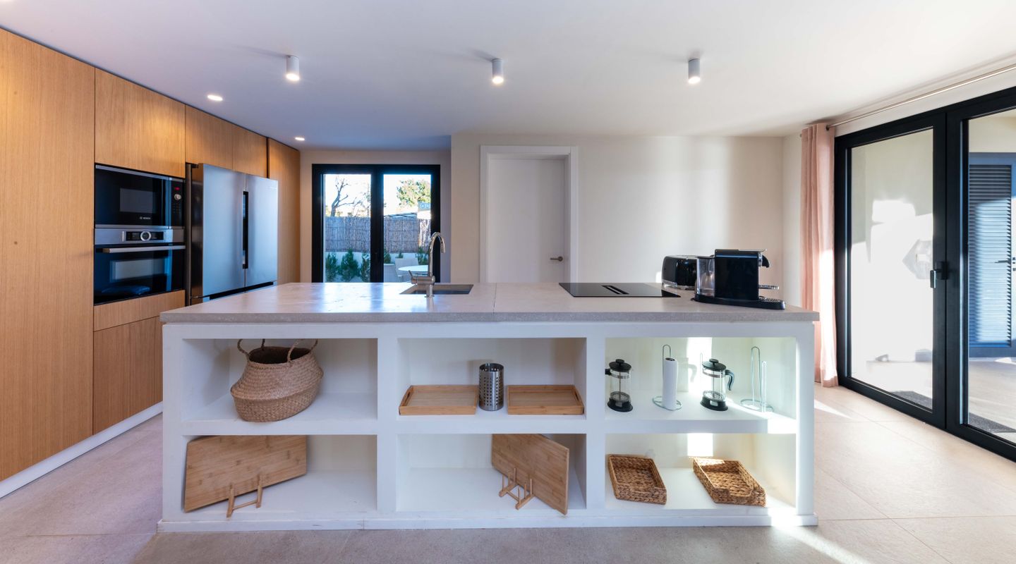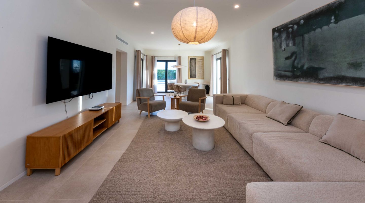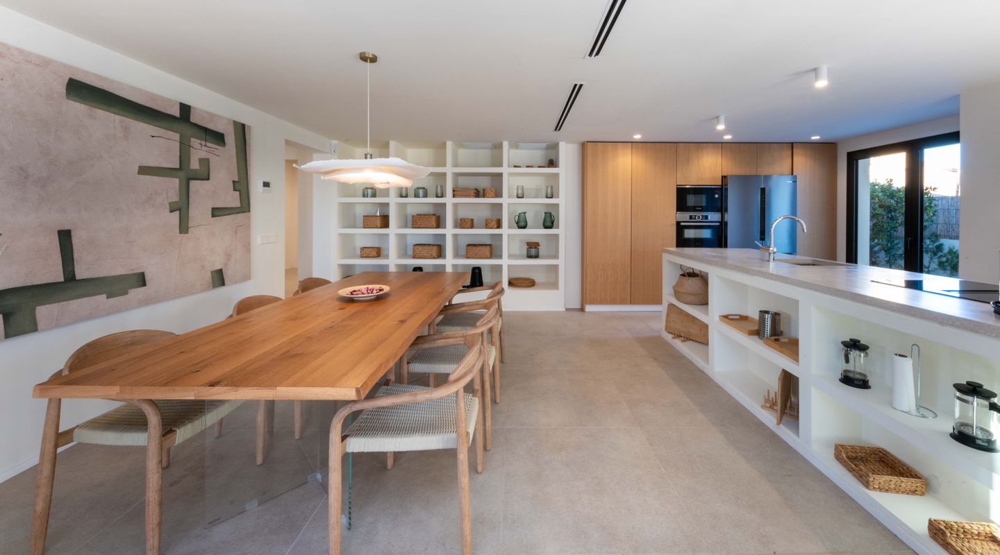 La casa, distribuida principalmente en una sola planta, ha sido diseñada para ofrecer el máximo confort y privacidad. Cuenta con amplios y luminosos espacios, con una elegante sala de estar, comedor independiente y una moderna cocina totalmente equipada con acceso directo a las terrazas exteriores y a la zona de piscina.