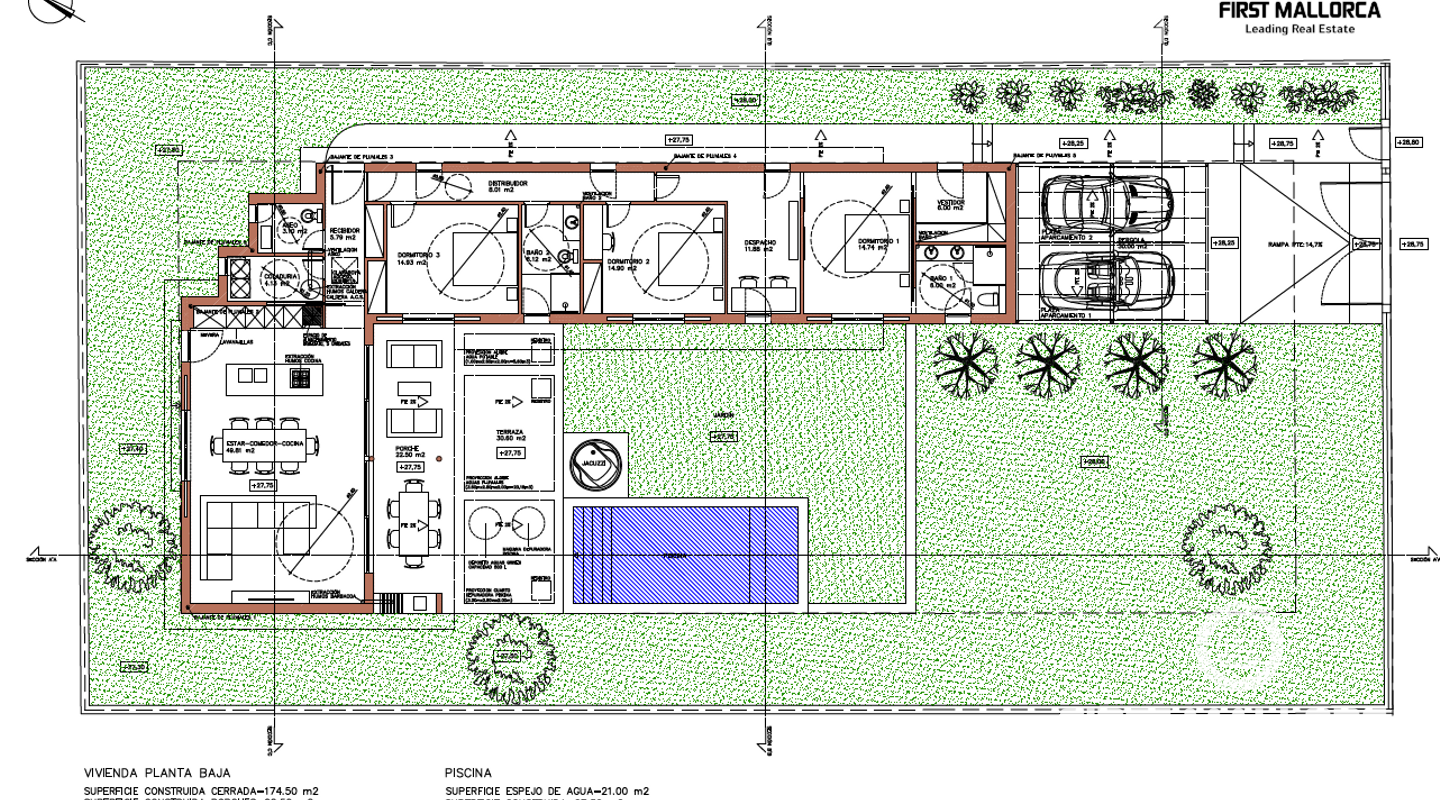 La vivienda diseñada contará con cuatro dormitorios y tres baños, de los cuales dos baños tienen salida directa a la terraza. El salón-comedor con cocina abierta tendrá una amplia superficie de 55 metros cuadrados, proporcionando un espacio abierto y luminoso. La habitación principal, de 20 metros cuadrados, contará con baño en suite y vestidor, ofreciendo una zona privada y exclusiva.