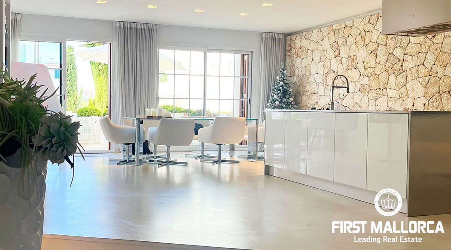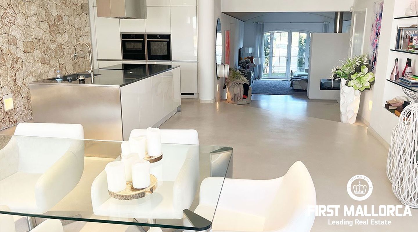 El salón de planta abierta impresiona por su arquitectura moderna, techos altos y exclusivos suelos de piedra natural. La zona de estar con una moderna chimenea invita a relajarse, mientras que la cocina de alta calidad con isla y el elegante comedor son perfectos para las veladas sociales.
