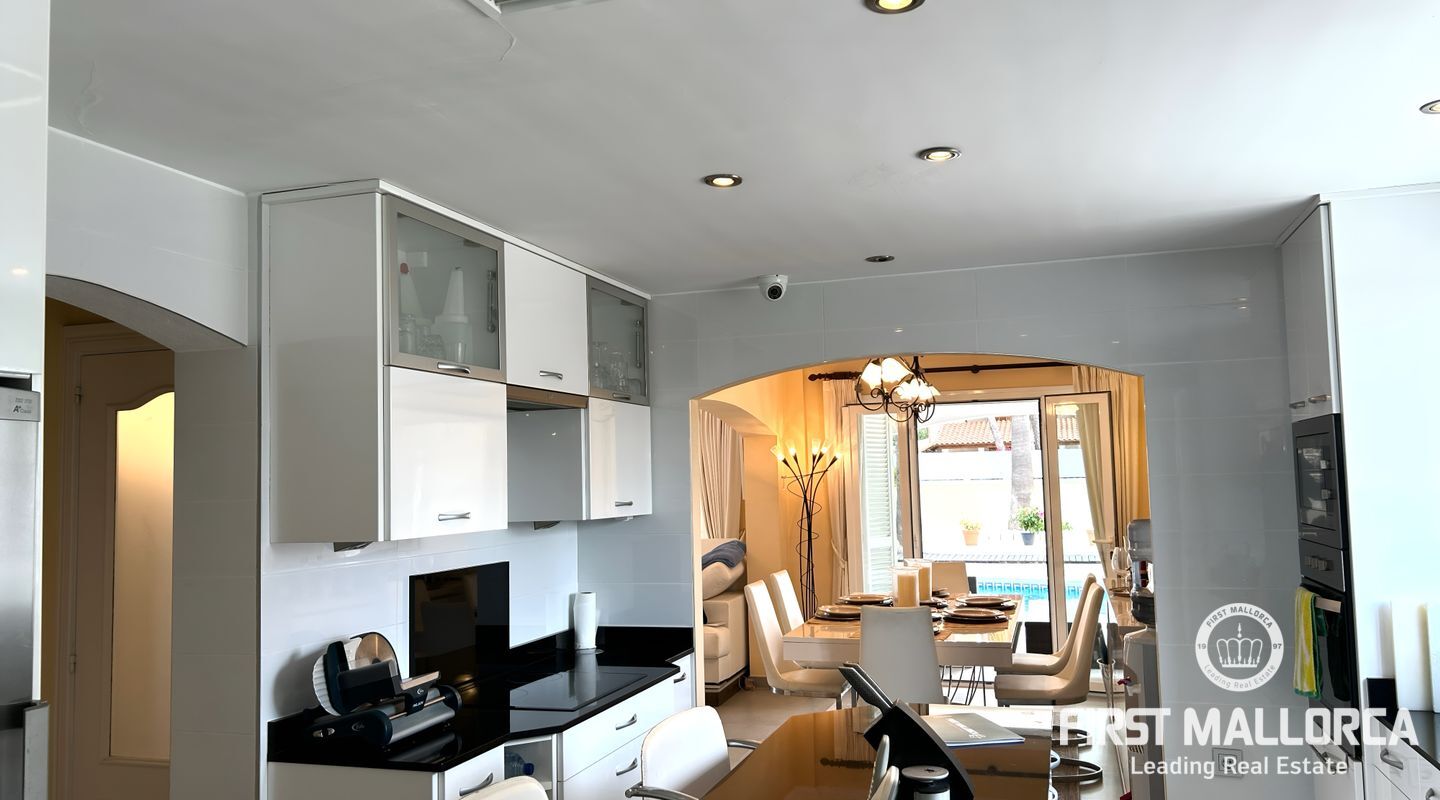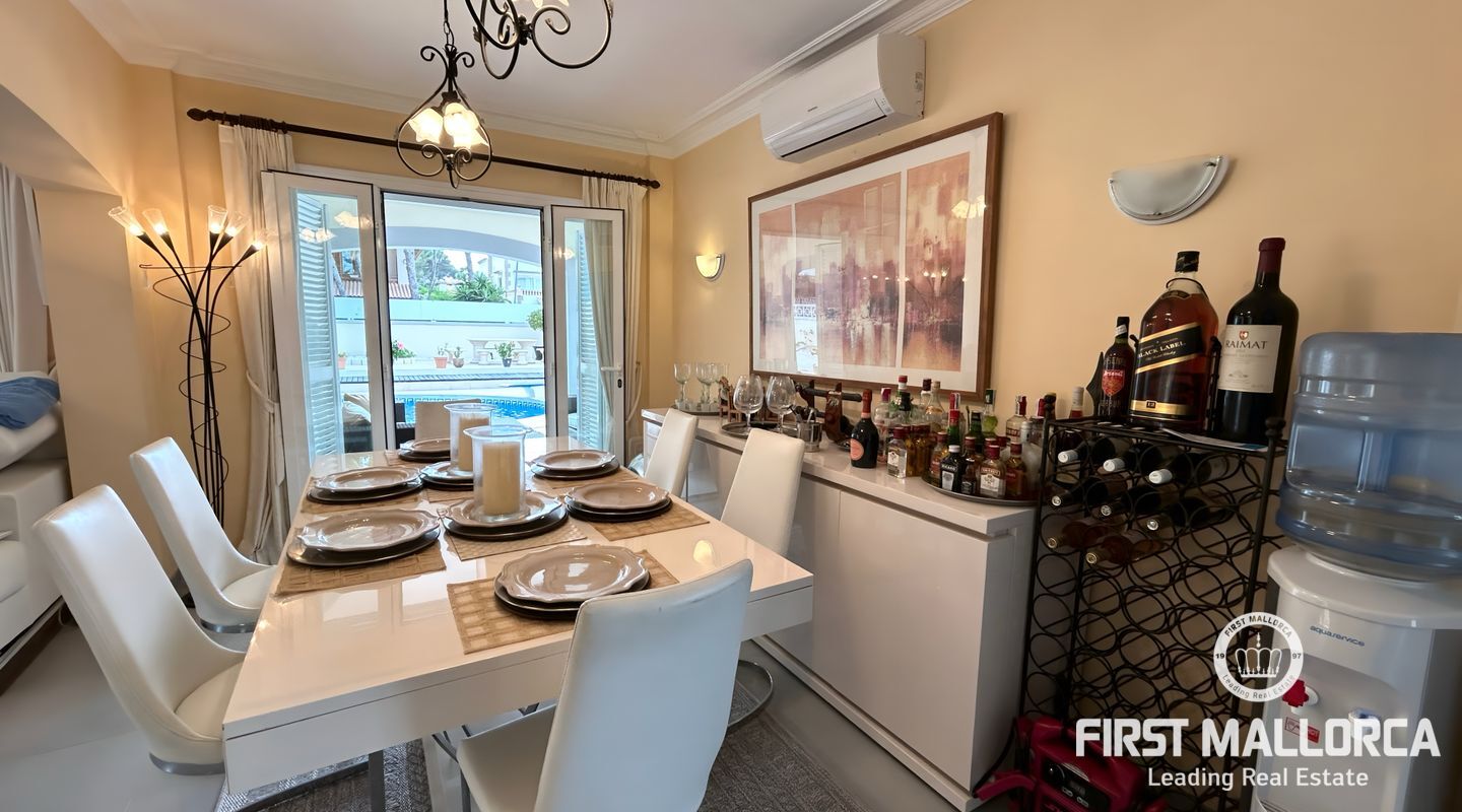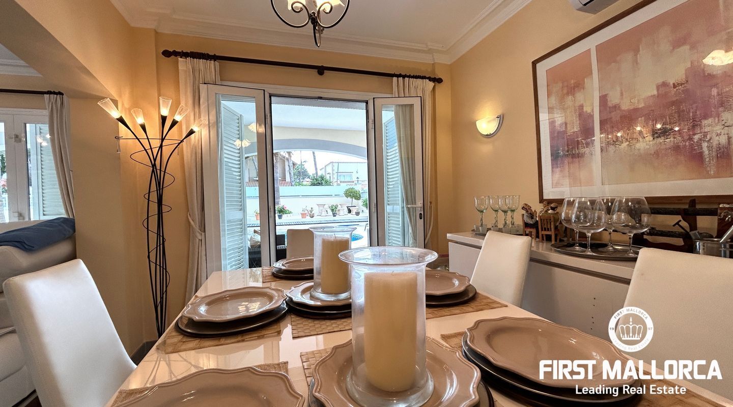 Desde el primer momento en que entras en esta casa perfectamente cuidada, te recibe una distribución bien diseñada que equilibra las zonas comunes abiertas con espacios privados. El acogedor salón se abre a una terraza cubierta, perfecta para cenas al aire libre o para relajarse junto a la piscina.