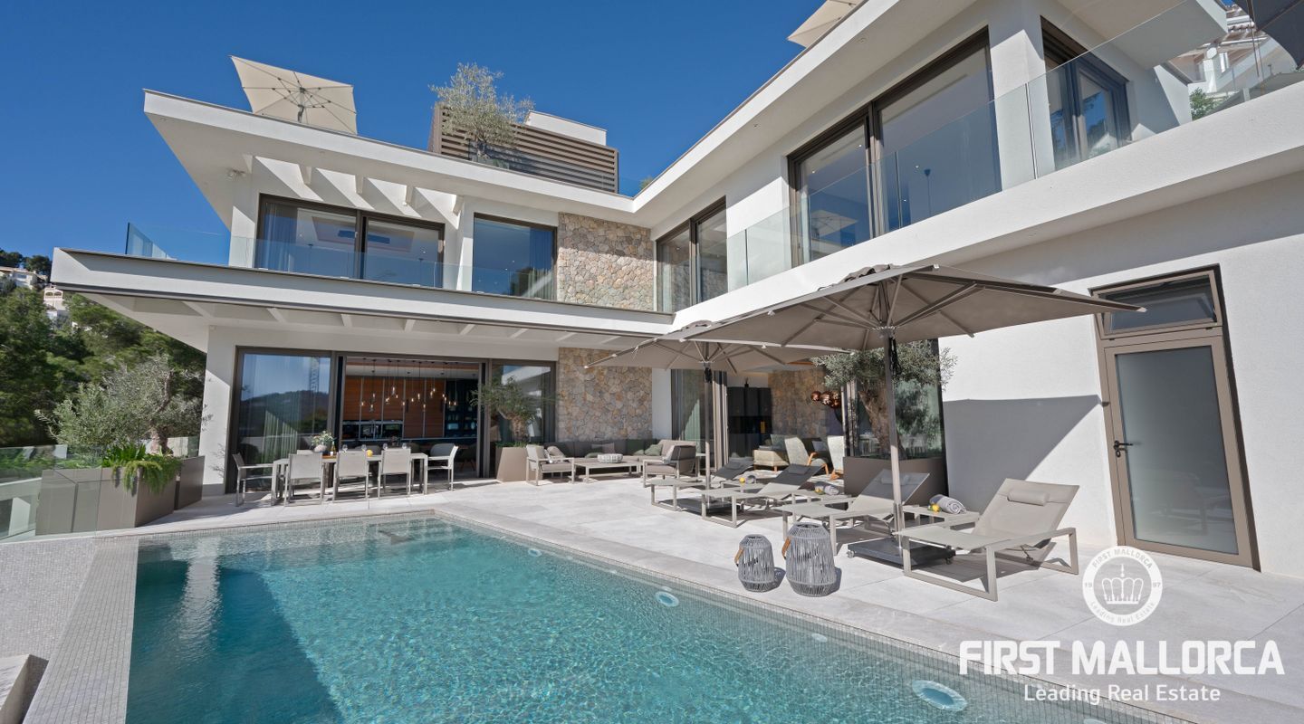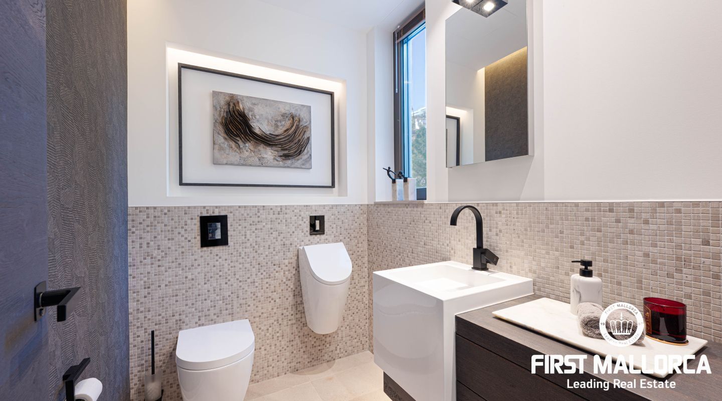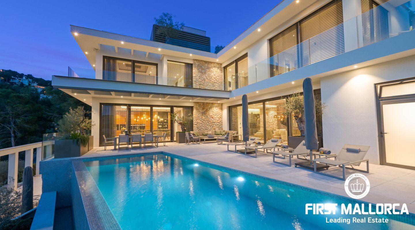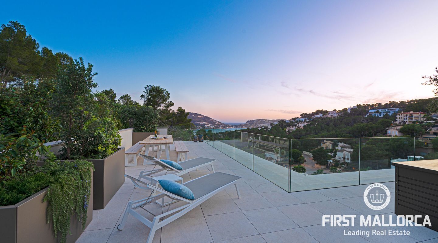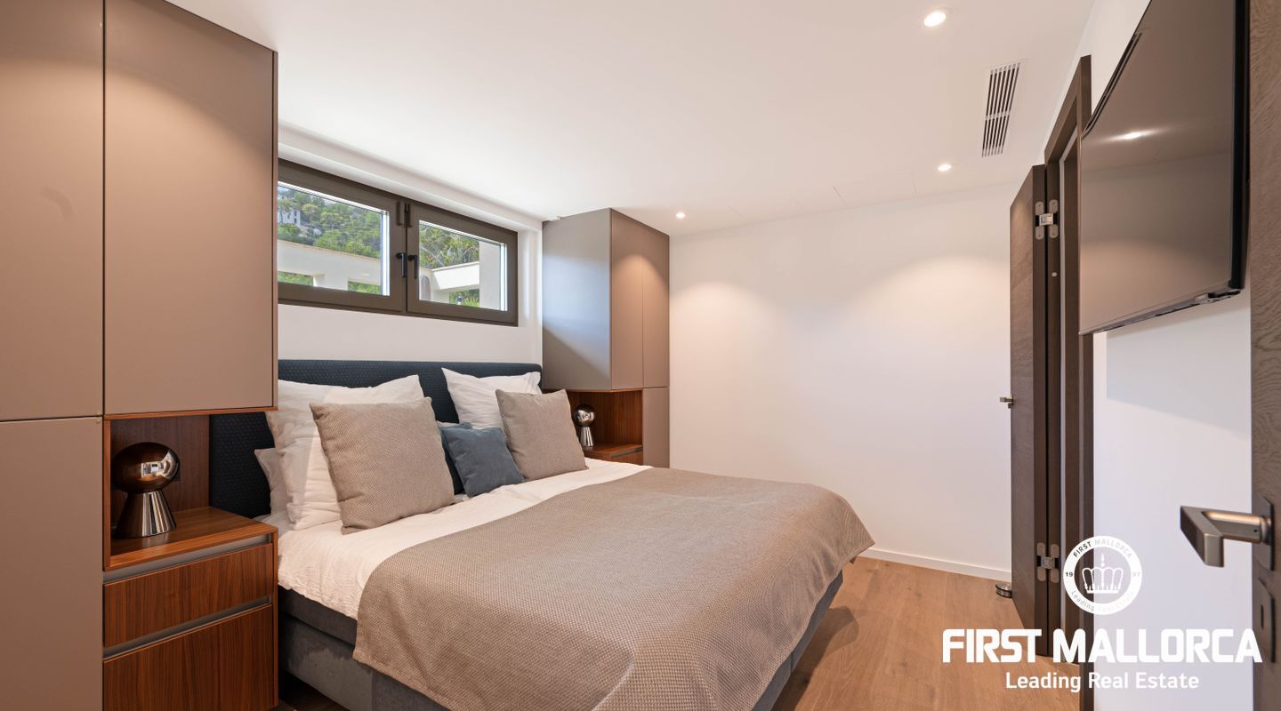 Esta extraordinaria villa en Andratx combina la más alta calidad de construcción, un diseño atemporal y equipamiento de última generación, y ofrece unas impresionantes vistas al mar y al puerto. La villa cuenta con un total de cinco dormitorios, todos con baño en suite y acceso directo a la terraza. Planos generosos, materiales de alta calidad y mobiliario de lujo de reconocidas marcas como Rolf Benz, Hülsta, Koinor y Cattelan Italia subrayan el carácter exclusivo de la propiedad. Un ascensor conecta todas las plantas, desde el garaje hasta la amplia azotea con vistas espectaculares. En la planta baja se encuentran la cocina principal, un aseo de invitados, un lavadero y el luminoso salón-comedor con acceso a la piscina infinita. Un baño completo independiente en la zona de la piscina complementa el concepto de distribución cuidadosamente diseñado. La planta superior alberga el área principal con vestidor, baño en suite y una gran terraza, así como dos dormitorios adicionales, también con baño propio. La zona de invitados independiente en la planta inferior incluye dos dormitorios con baño en suite, una cocina totalmente equipada, un salón-comedor, un gimnasio, así como salas técnicas y de servicio. Uno de los puntos más destacados es la espaciosa azotea con espectaculares vistas al mar y al puerto. Un concepto exclusivo de iluminación interior y exterior – con lámparas de diseño de Nemo y Secto – crea una atmósfera acogedora. El equipamiento técnico incluye un sistema domótico, bomba de calor, calefacción por suelo radiante, aire acondicionado y un completo sistema de seguridad. La propiedad es completamente accesible. La orientación sur y suroeste, así como un cuidado jardín mediterráneo, completan este exclusivo concepto de vivienda. (El mobiliario de alta gama está disponible opcionalmente con un coste adicional.)