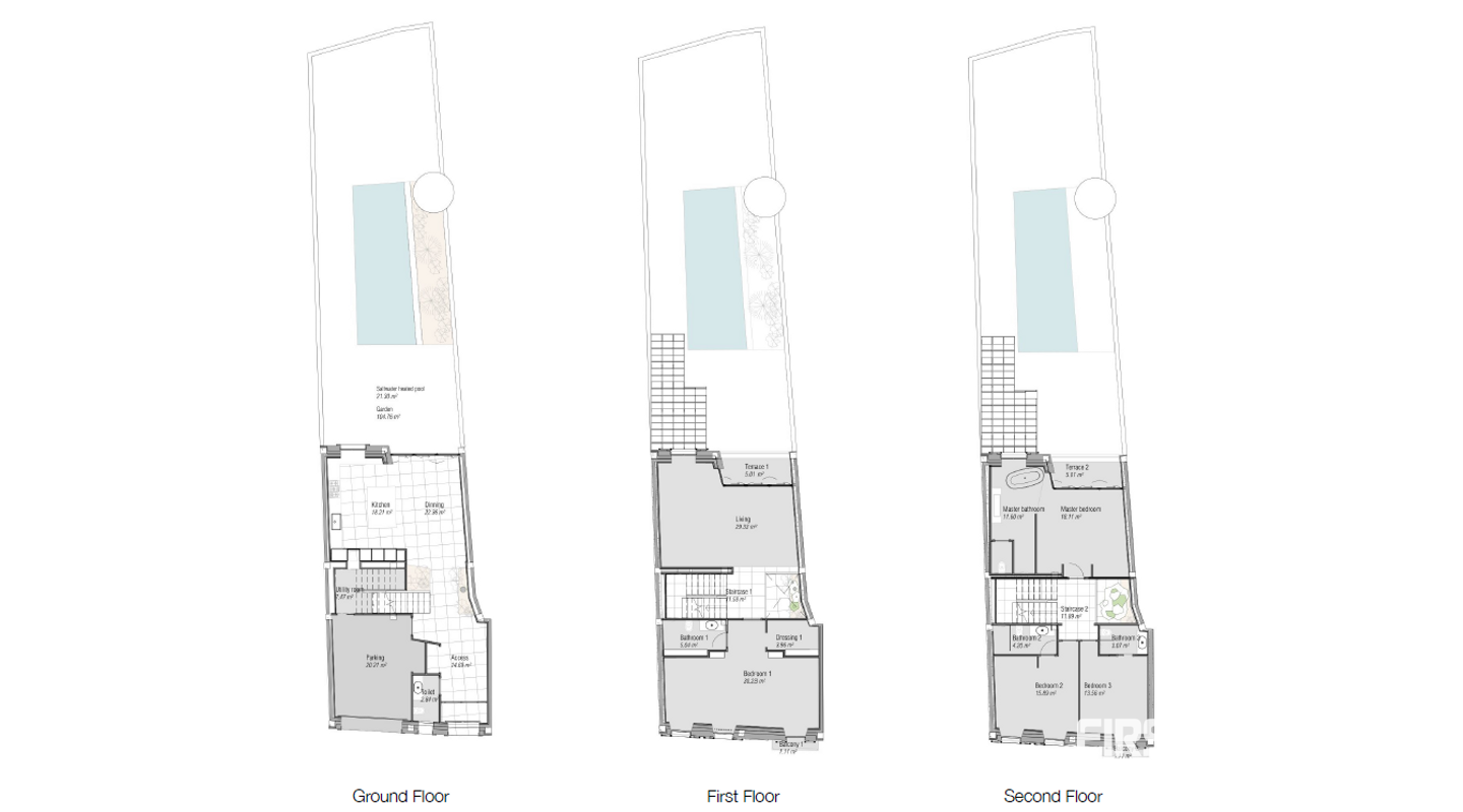 Hay 3 parcelas edificables con licencia para la construcción de tres casas adosadas cada una con cuatro o cinco dormitorios, jardín y piscina privada. Desde aquí se puede llegar a la plaza principal en sólo unos minutos a pie. Todas las casas ofrecerán magníficas vistas de las montañas circundantes. La Casa 1 tiene una superficie construida de aprox. 326m2 con cinco dormitorios con baños en-suite, un jardín privado de aprox. 126m2 con una piscina climatizada de agua salada. También dispone de un garaje y sótano. La Casa 2 tiene una superficie construida de aprox. 329 m2, cuatro dormitorios con baños en suite, un jardín de aprox. 127m2 y una piscina. También hay un garaje y un sótano. La casa 3 tiene una superficie construida de unos 319 m2, cuatro dormitorios con baños en suite, un jardín de unos 100 m2 y una piscina. Esta casa también tiene un garaje y un sótano.