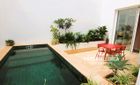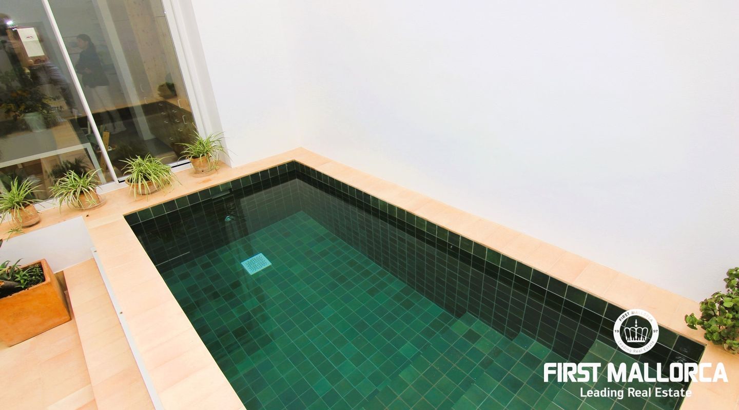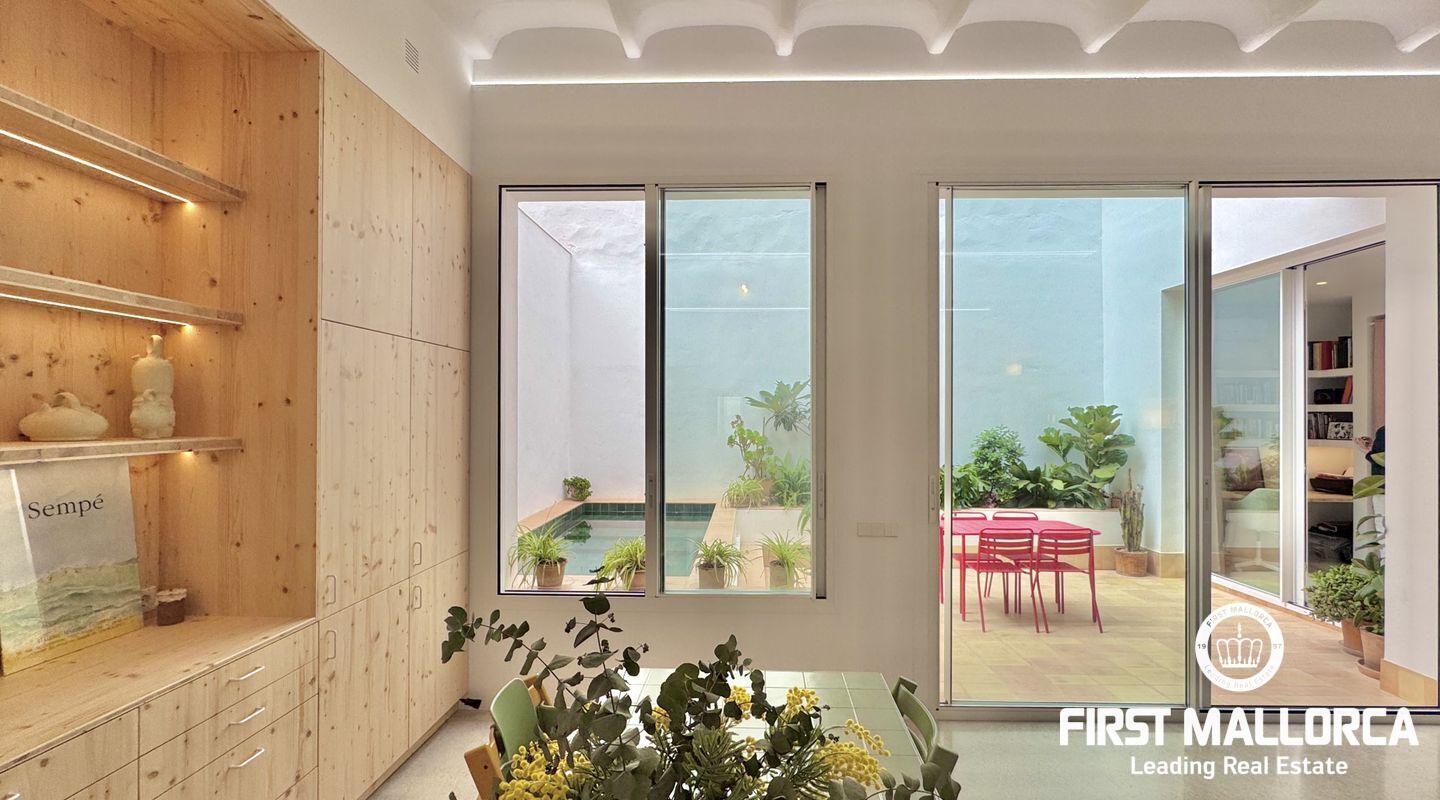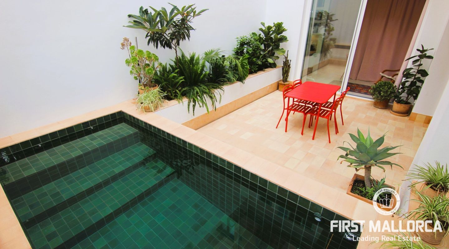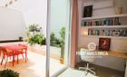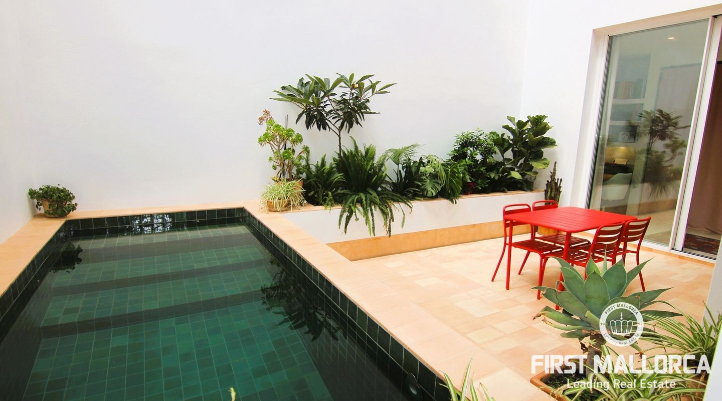 La propiedad cuenta con dos dormitorios y dos baños, así como un amplio y luminoso salón-comedor con cocina abierta moderna y una barra larga, además de acceso directo a un patio elegantemente diseñado. Este espacio exterior incluye una refrescante piscina tipo plunge, jardineras integradas y una atmósfera serena, casi meditativa.