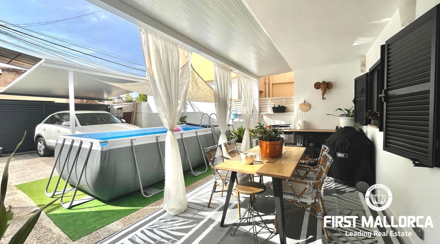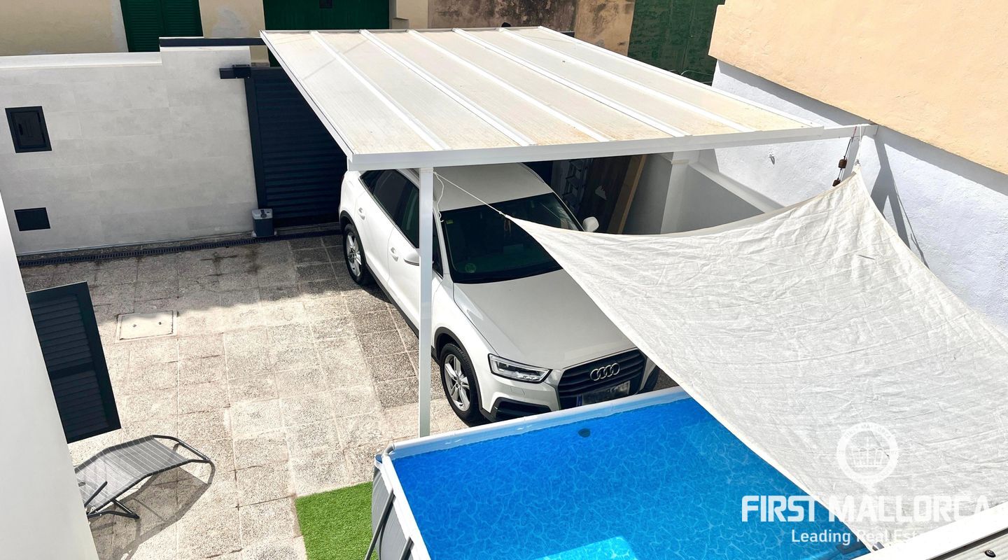 En la parte delantera de la casa se encuentra un porche con terraza soleada, una kitchenette exterior, aparcamiento cubierto y espacio adicional para instalar una piscina desmontable, perfecta para disfrutar del estilo de vida al aire libre de Mallorca.