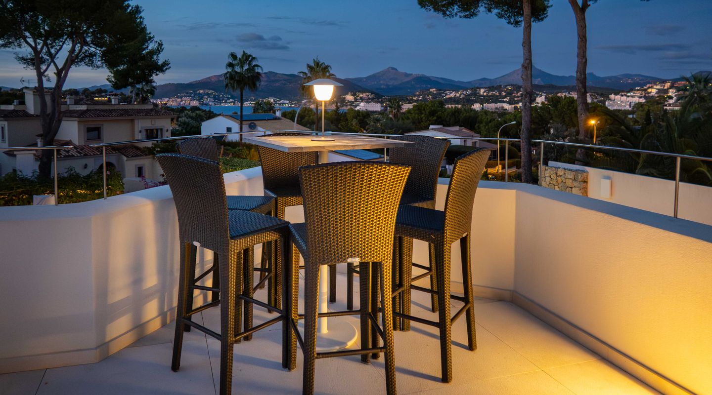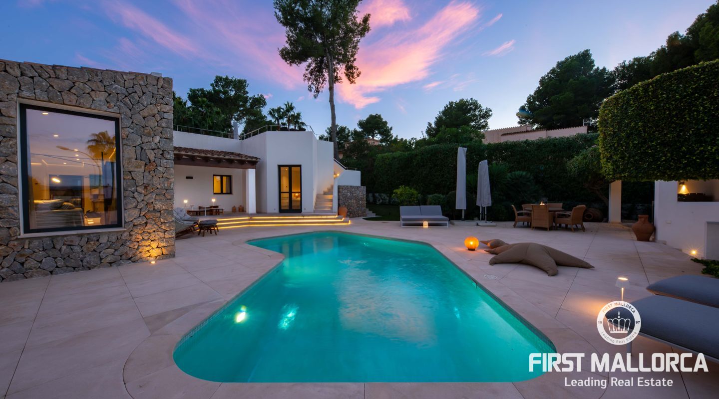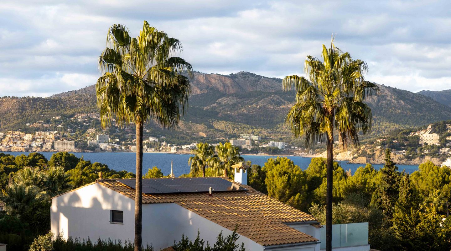 Esta exclusiva villa de lujo en Nova Santa Ponsa, rodeada por un precioso jardín subtropical, fue diseñada por un arquitecto local y ofrece unas vistas maravillosas e obstaculizadas al mar y a la sierra de Tramuntana. Debido al tamaño de la parcela, existe incluso una reserva de ampliación en lo que respecta a las normas de construcción.