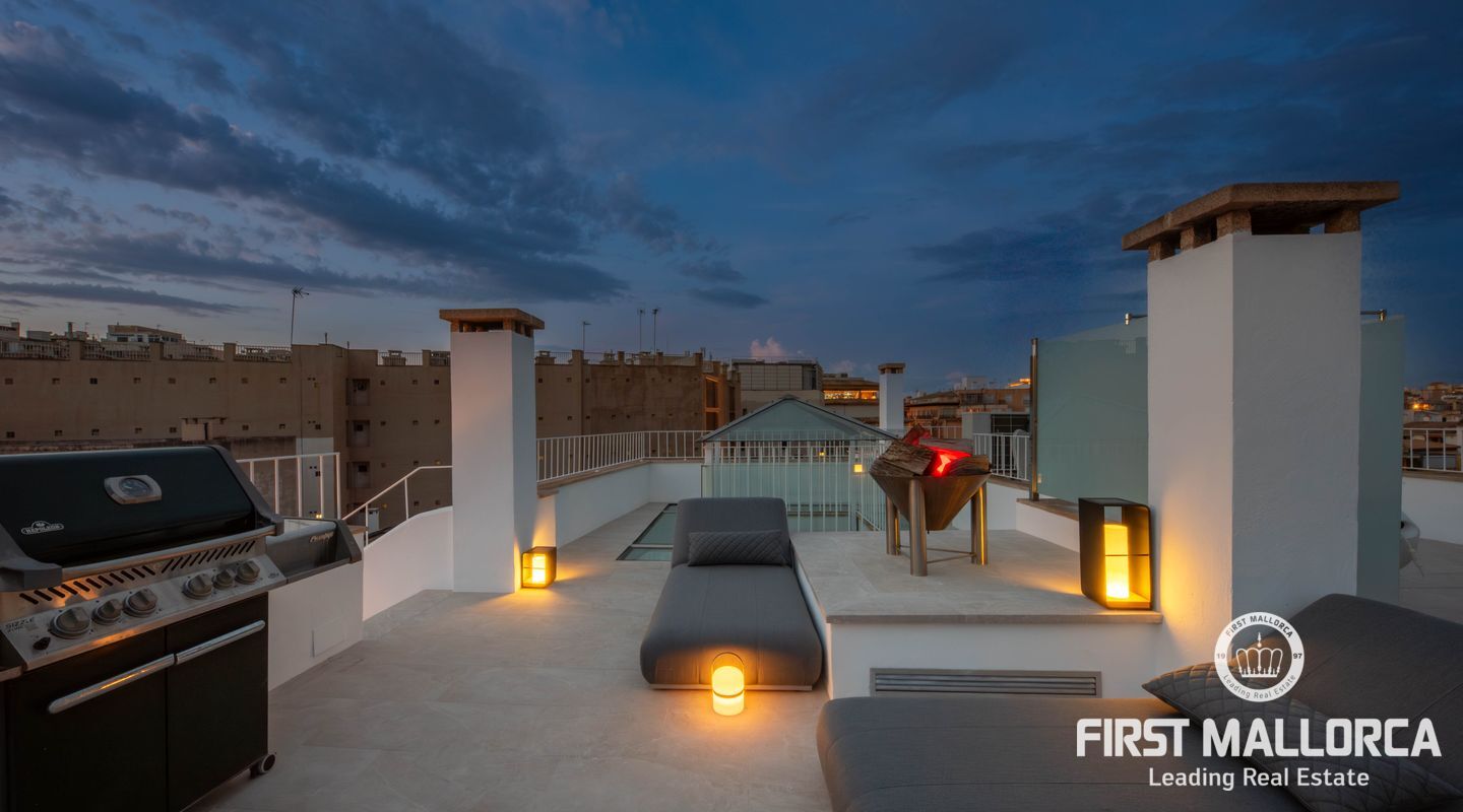 Desde esta planta se accede a la gran terraza en la azotea, un auténtico oasis urbano que ofrece vistas panorámicas de 360º sobre Palma, el mar y la Sierra de Tramuntana. Este espacio, totalmente privado, cuenta con zona chill out, ducha exterior y fuego decorativo, convirtiéndose en la joya de la propiedad.