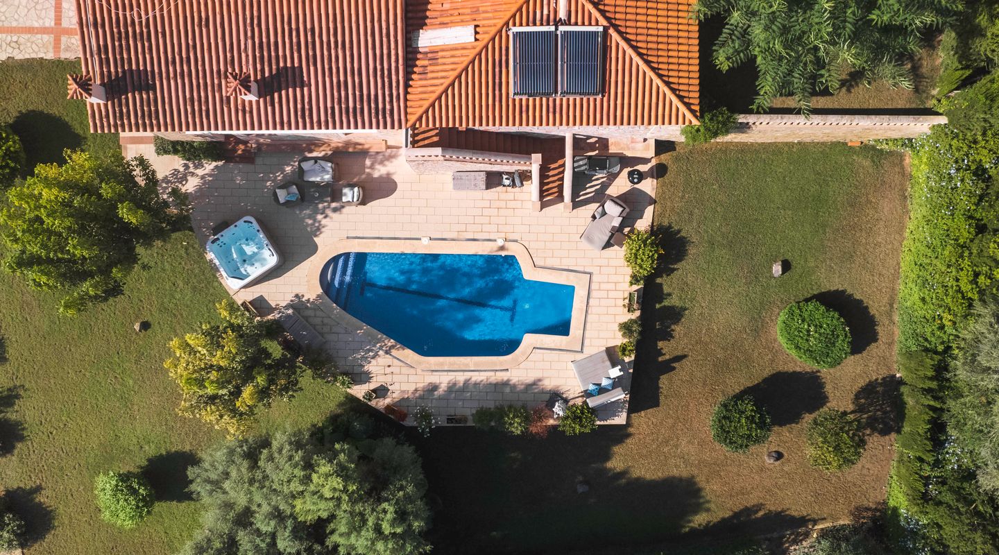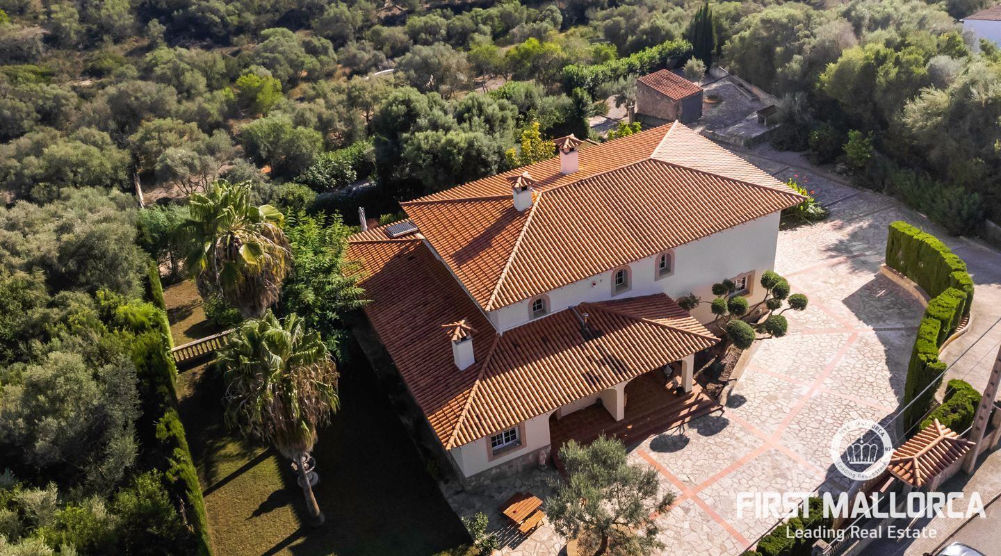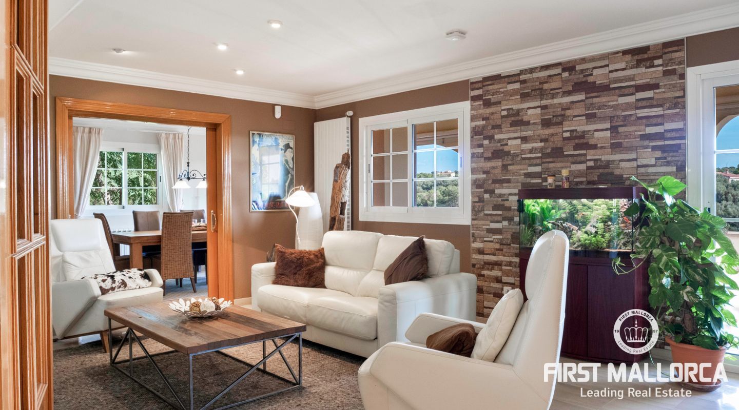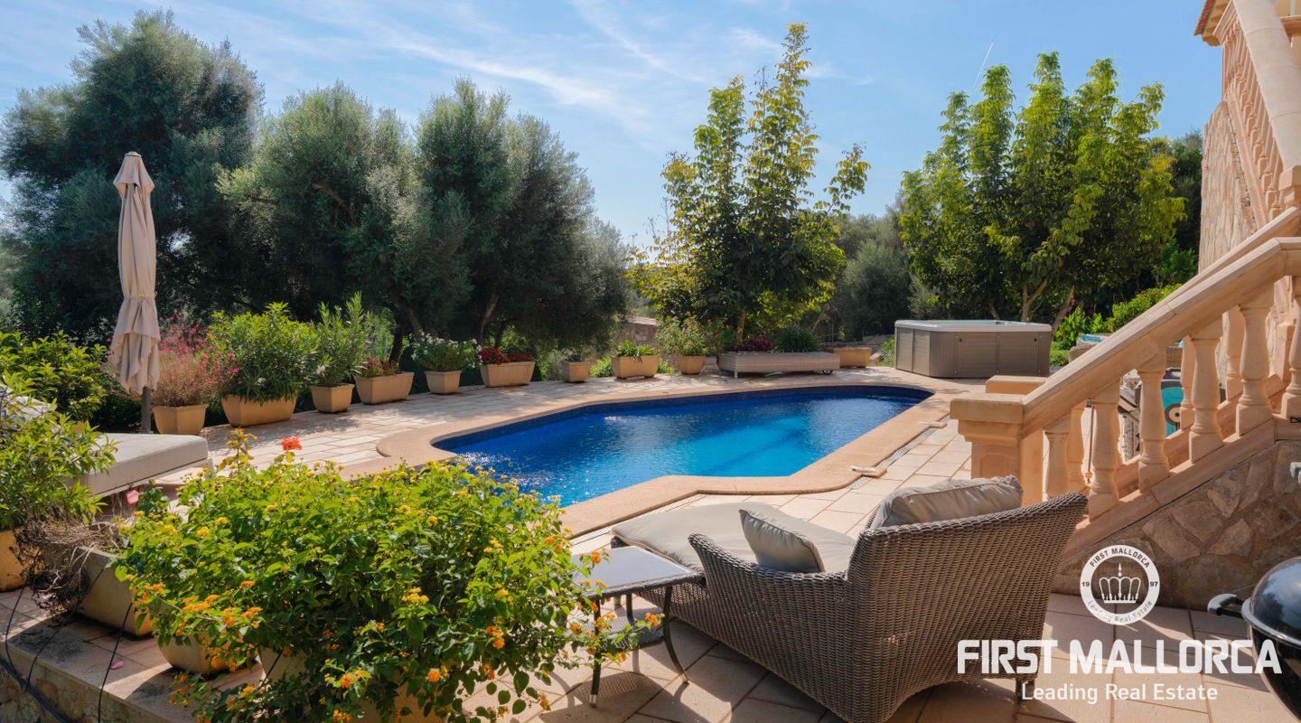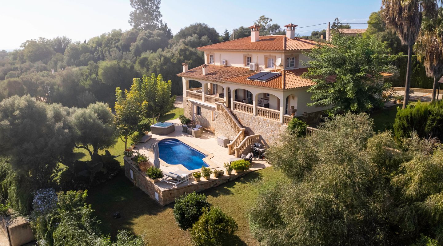 Esta villa mediterránea construida en piedra natural combina tres niveles de confort lujoso y vistas panorámicas despejadas sobre el paisaje de S’Aranjassa. Situada en una parcela de 7.661 m² con 550 m² de superficie construida, se presenta como una residencia de ensueño en Mallorca.