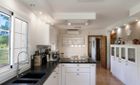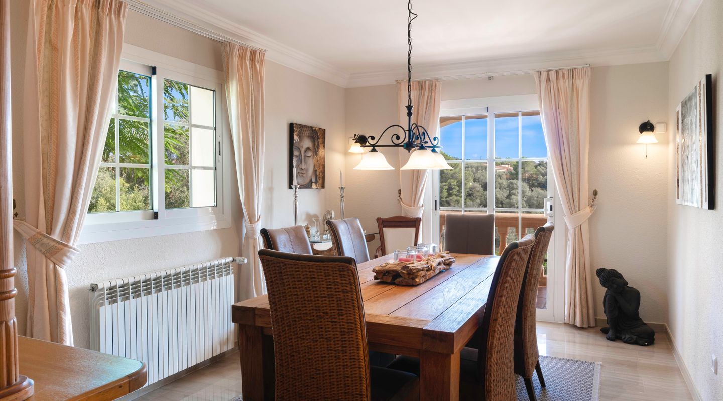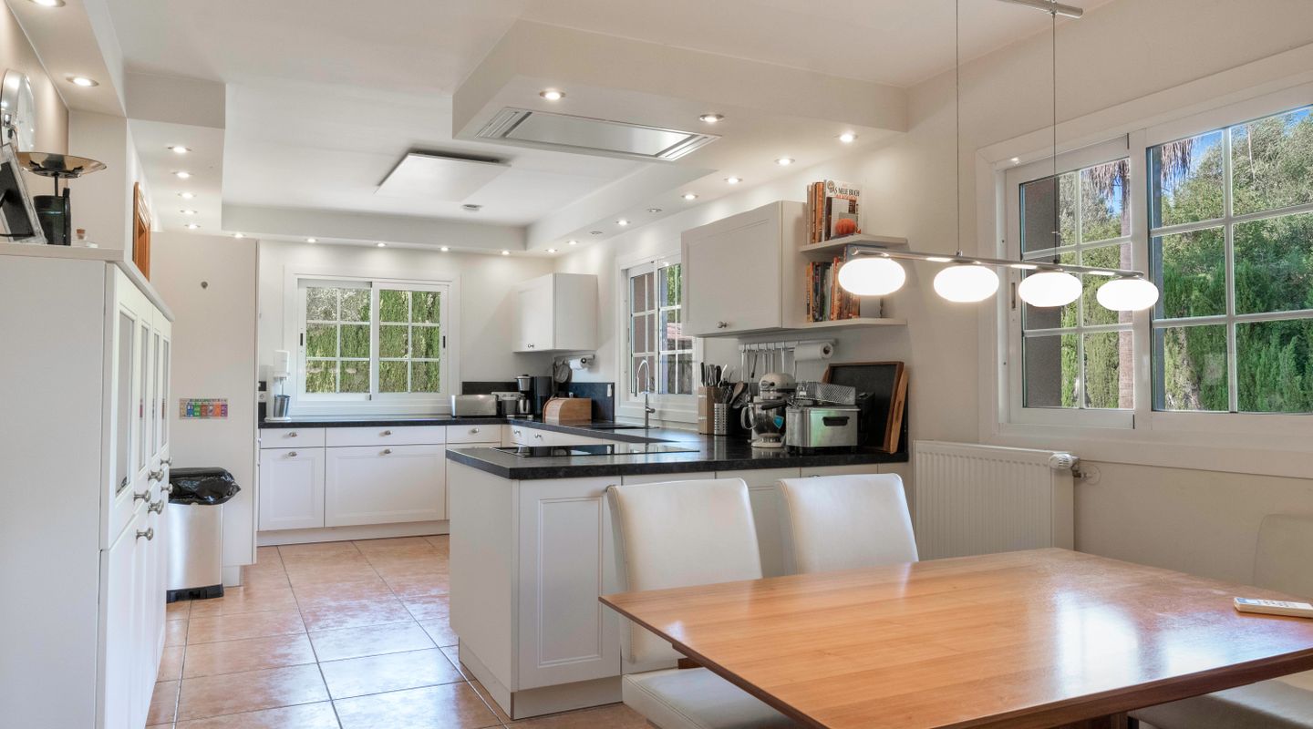 La planta baja ofrece amplias estancias, incluyendo un luminoso salón familiar con chimenea, un comedor independiente, otro salón con chimenea y una suite de invitados con baño en suite. La cocina Nolte de alta gama, equipada con modernos electrodomésticos, es elegante y funcional. Todas las estancias se abren a la terraza cubierta con impresionantes vistas panorámicas.