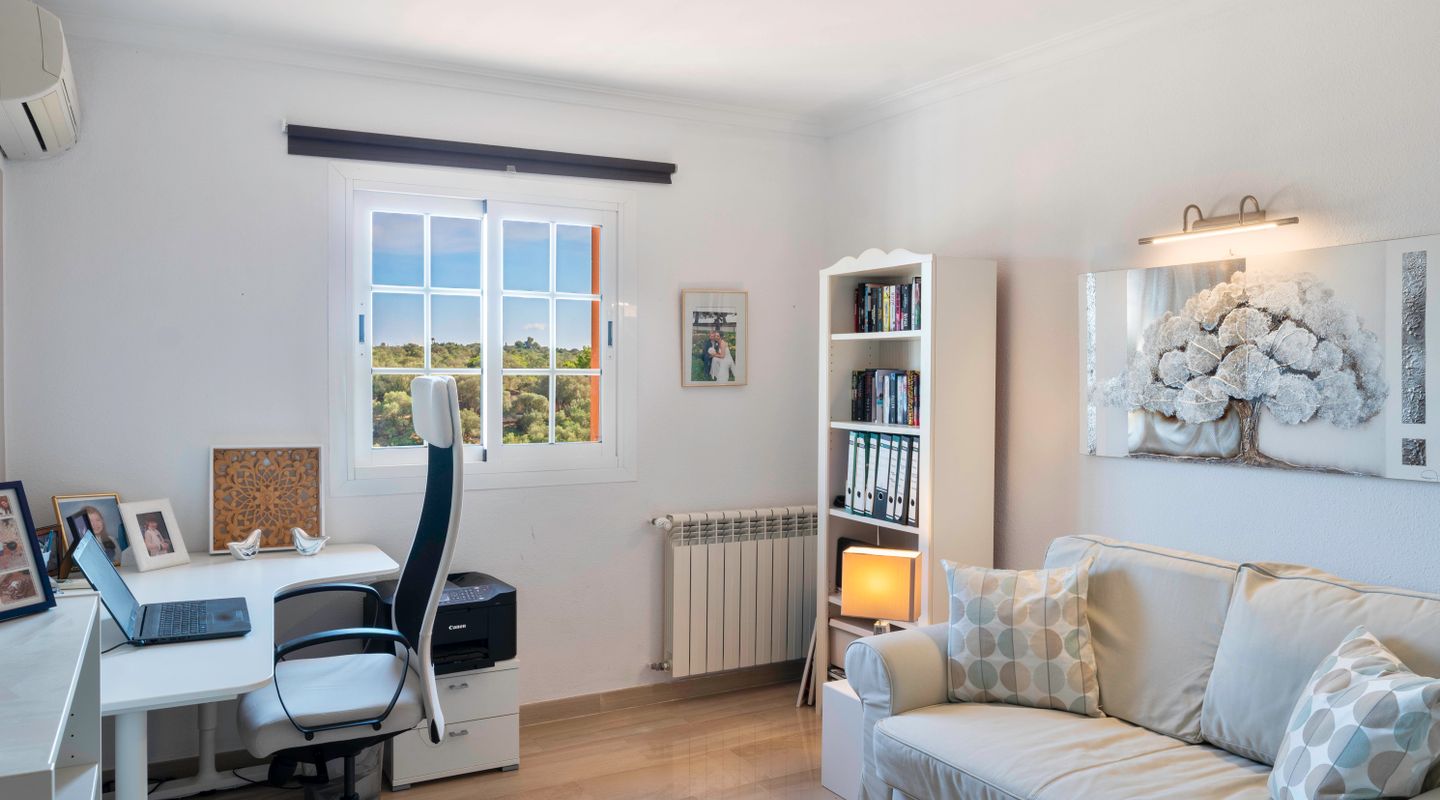 En la planta superior, la suite principal cuenta con baño en suite, vestidor y jardín de invierno. Otros dos dormitorios comparten un baño moderno y también pueden utilizarse como oficina.