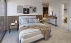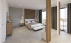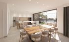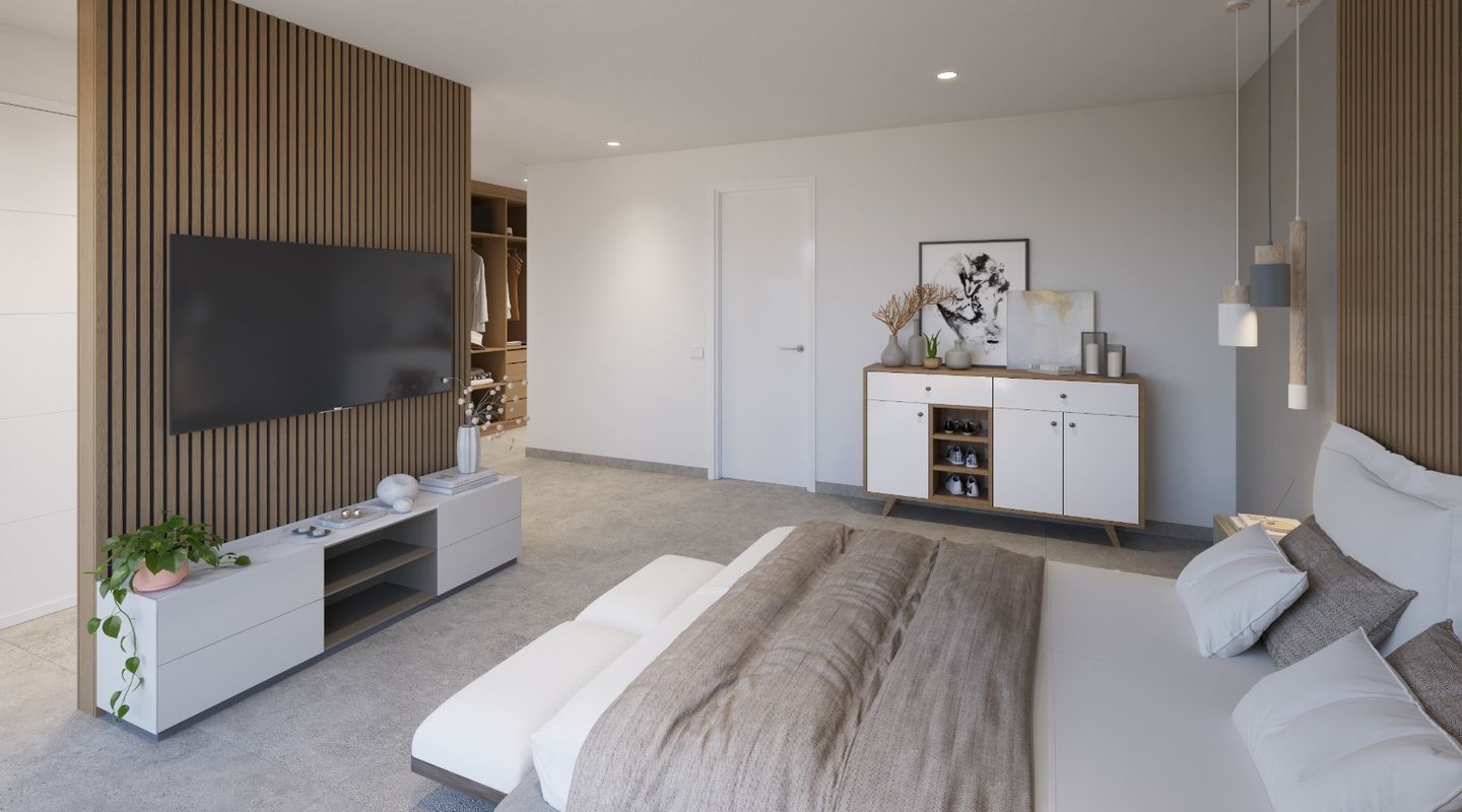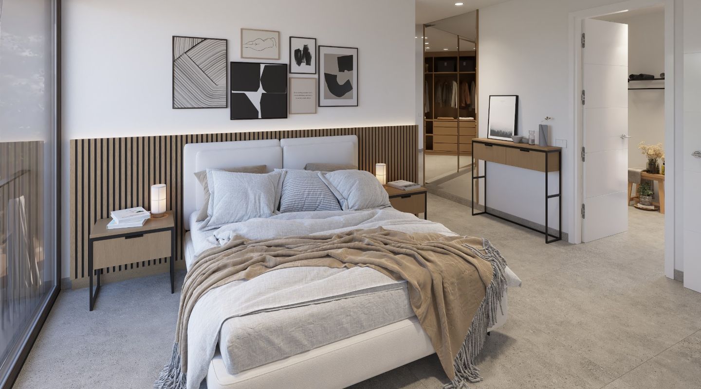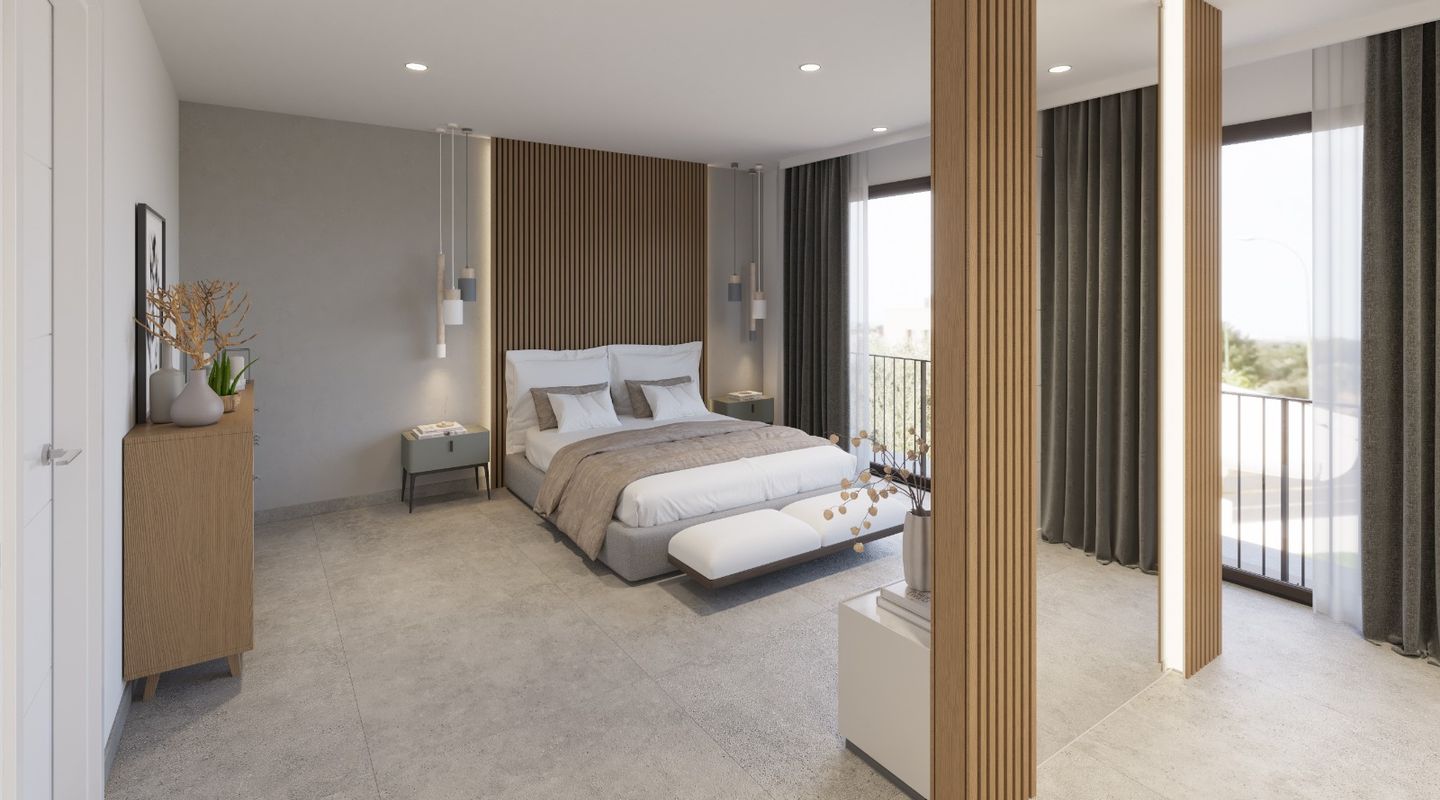 La planta baja cuenta con un gran salón-comedor con cocina abierta totalmente equipada, un dormitorio en suite y un aseo de cortesía. En la planta superior se encuentran tres dormitorios, todos con vestidor y baño privado, además de una terraza en la azotea con vistas a la Bahía de Palma y la Serra de Tramuntana.