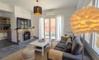 El apartamento en la planta baja ofrece dos dormitorios, un baño y una zona de estar abierta con chimenea, con acceso a una gran terraza y a un jardín de 300 m². También cuenta con un estudio separado con un dormitorio, baño y cocina.