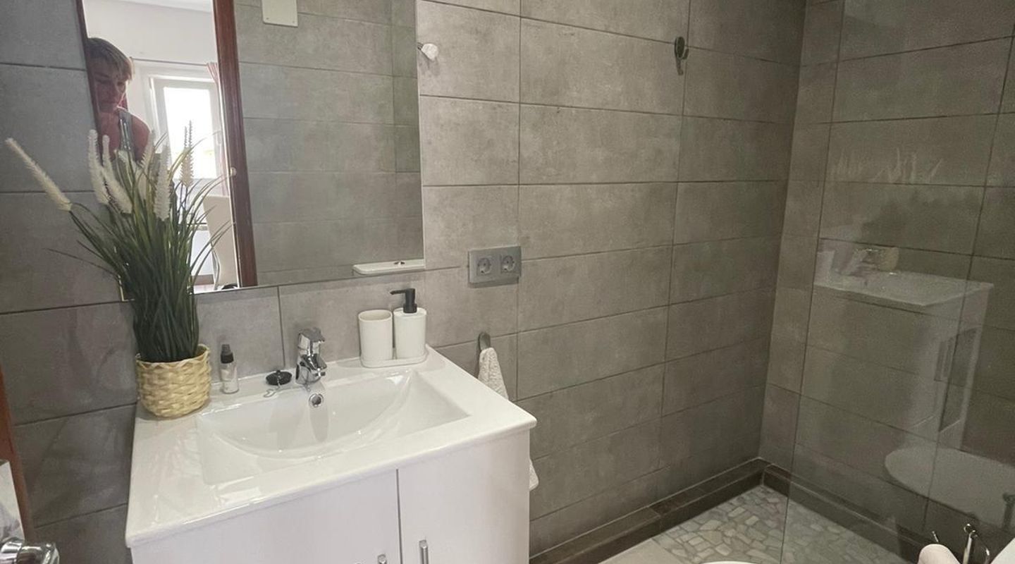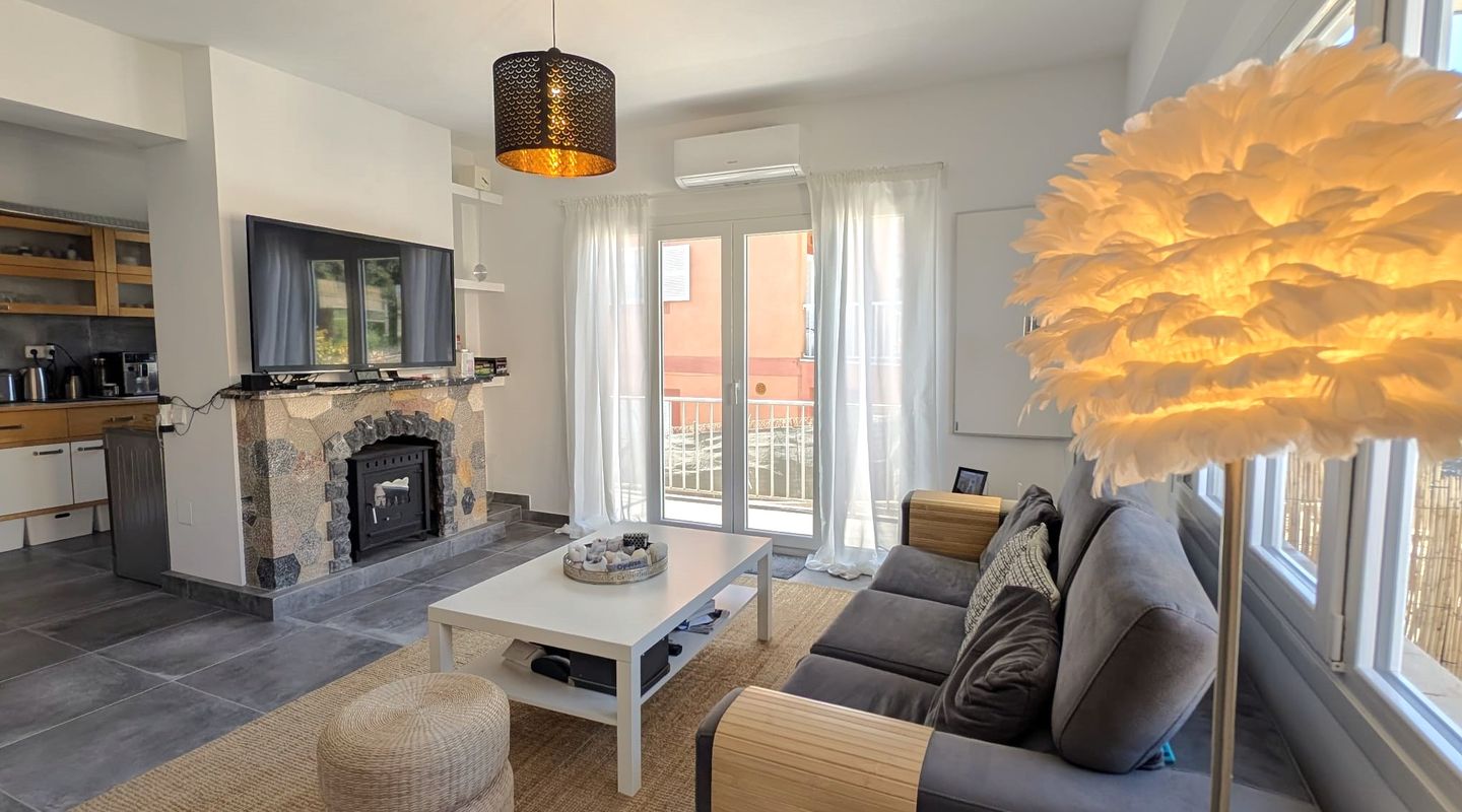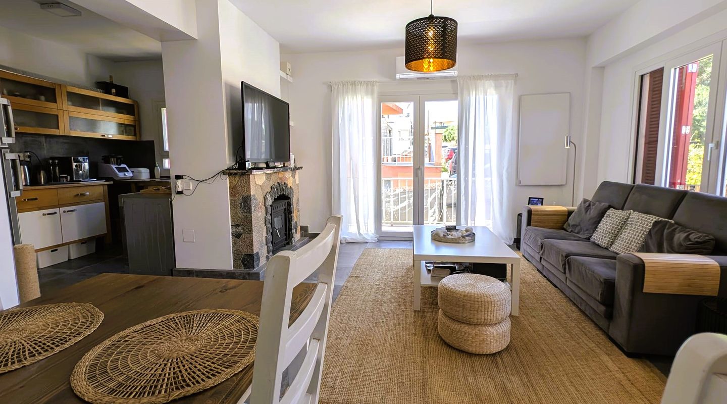 El apartamento en el primer piso, recientemente renovado y modernizado, cuenta con tres dormitorios, un baño y una zona de estar abierta con chimenea que conecta directamente con la cocina. Además, hay un estudio separado para huéspedes con un dormitorio, baño y cocina. El apartamento también incluye dos balcones, una terraza espaciosa en la parte frontal y el uso exclusivo de la terraza en la azotea. Además, la propiedad tiene un pequeño estudio separado para huéspedes, con un dormitorio, baño y cocina.