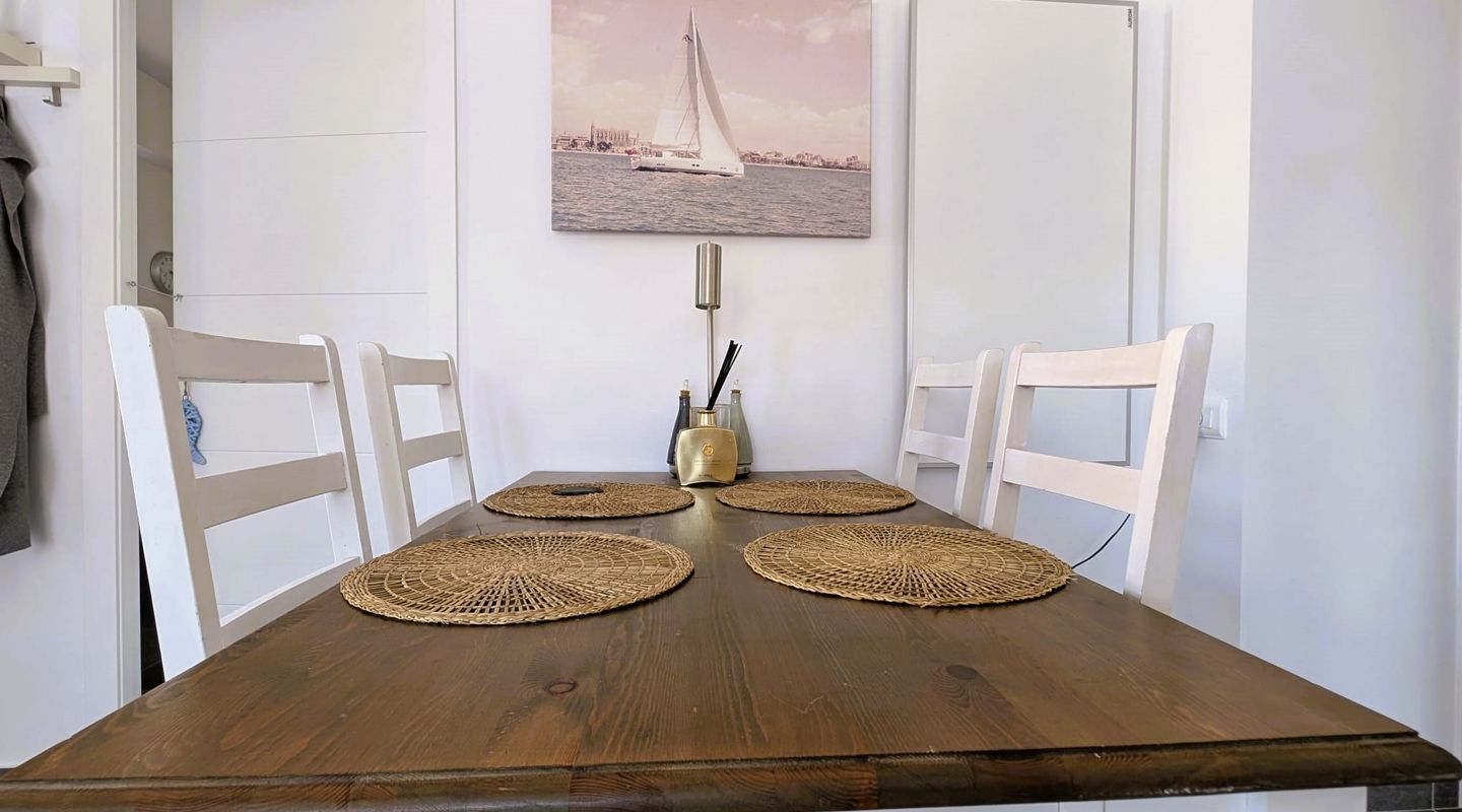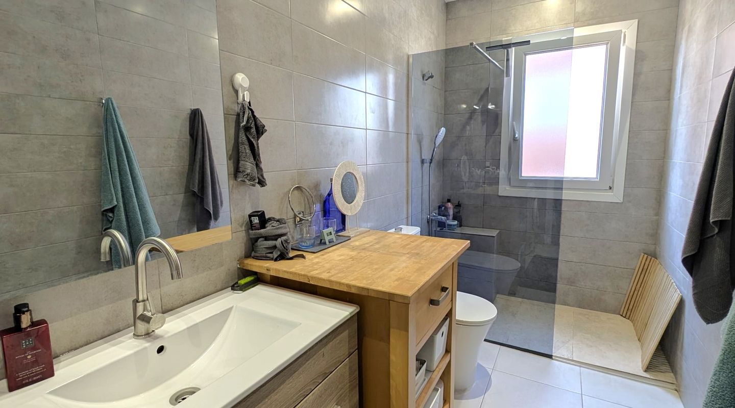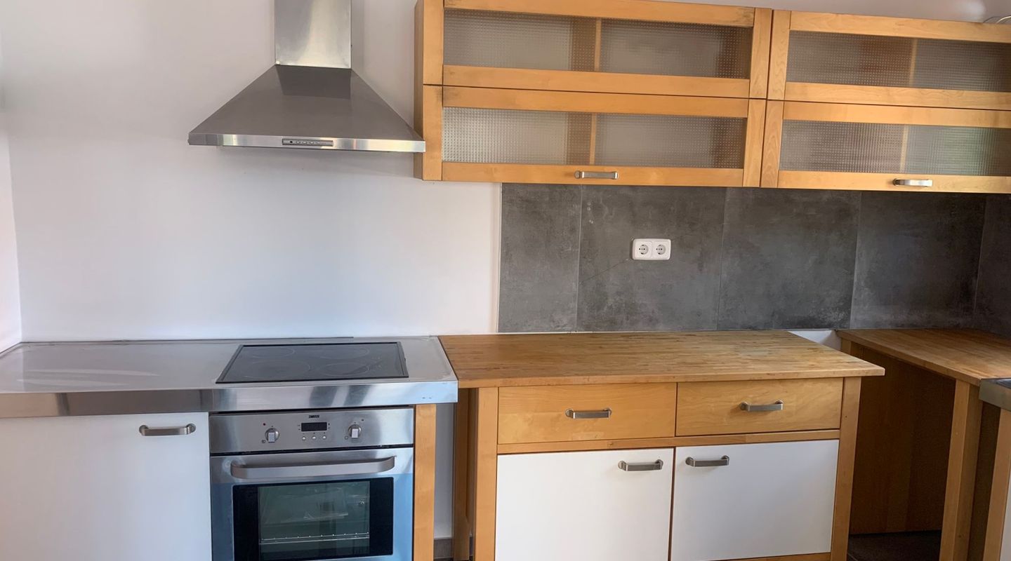 El apartamento en el primer piso, recientemente renovado y modernizado, cuenta con tres dormitorios, un baño y una zona de estar abierta con chimenea que conecta directamente con la cocina. Además, hay un estudio separado para huéspedes con un dormitorio, baño y cocina. El apartamento también incluye dos balcones, una terraza espaciosa en la parte frontal y el uso exclusivo de la terraza en la azotea. Además, la propiedad tiene un pequeño estudio separado para huéspedes, con un dormitorio, baño y cocina.