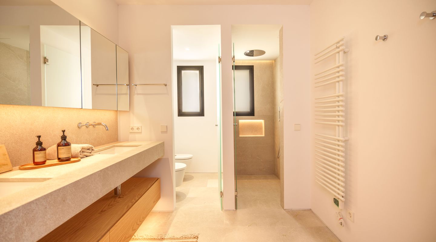 Planta primera: área privada con tres dormitorios, todos con baño en suite. El principal cuenta con vestidor y terraza privada con vistas despejadas. Los otros dos dormitorios, también dobles, ofrecen vestidor, baño en suite y terraza propia.