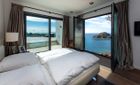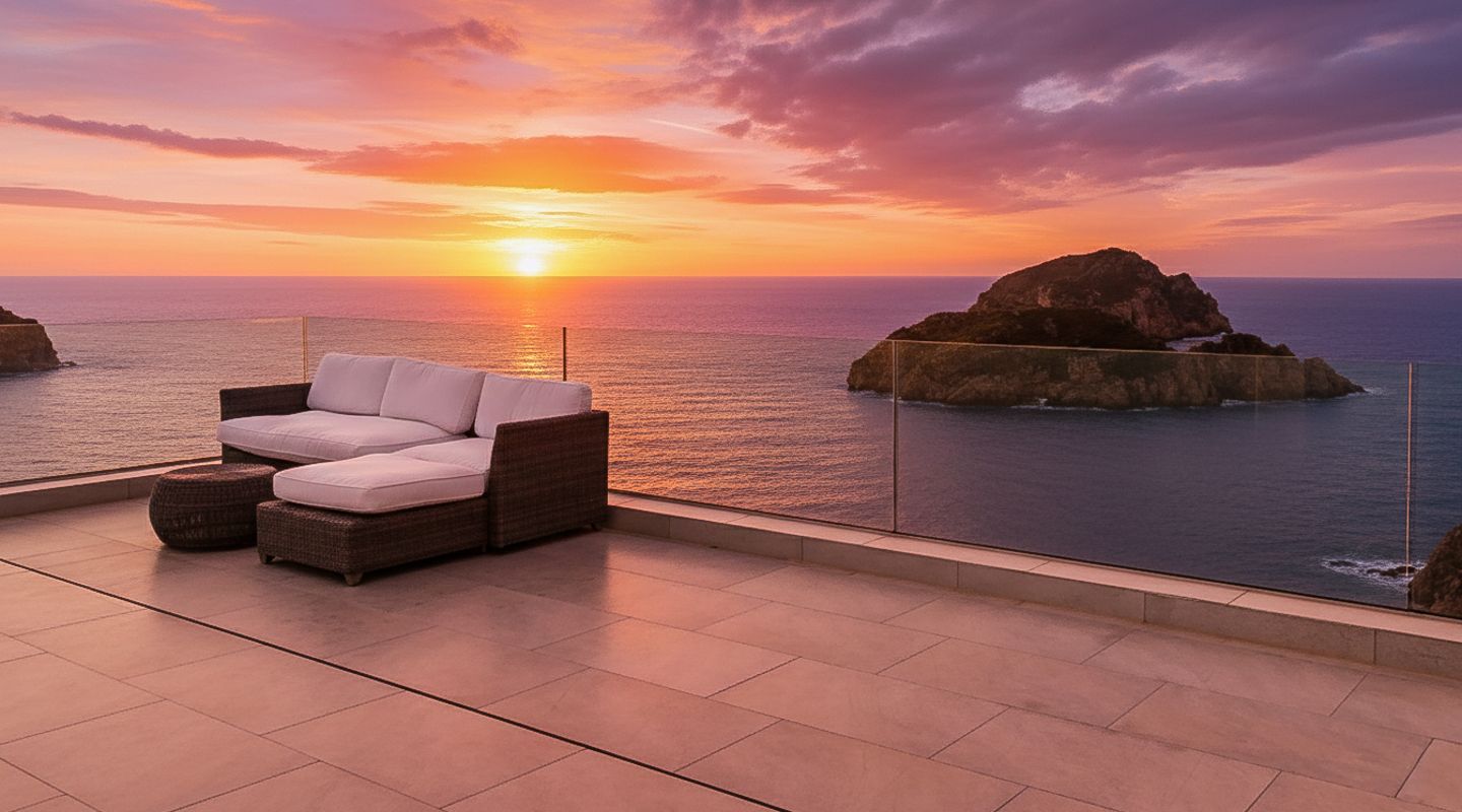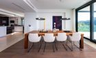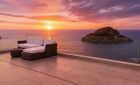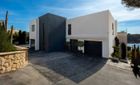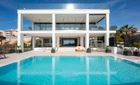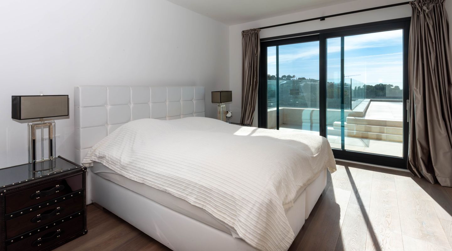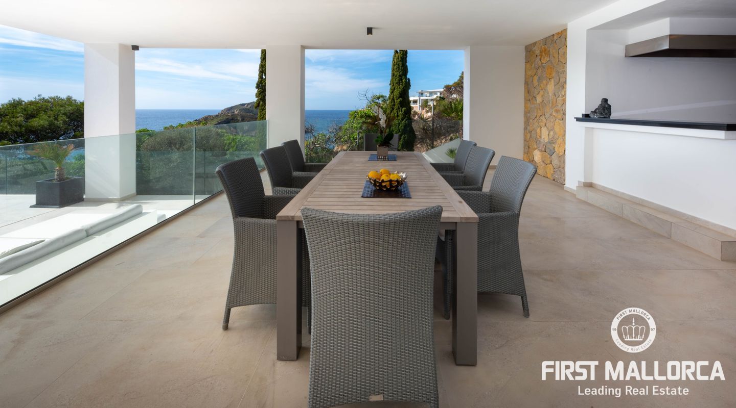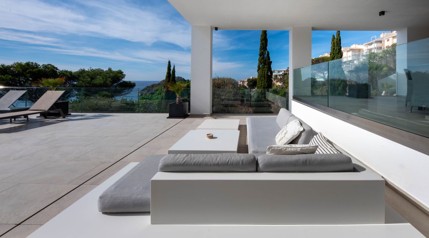 La fachada orientada al sur, casi completamente acristalada, inunda los espacios con luz natural y ofrece vistas espectaculares al mar y al paisaje circundante. Amplias terrazas, cubiertas y descubiertas, incluyen zonas de descanso, baño exterior, área de barbacoa y una elegante piscina infinita, creando un entorno perfecto para relajarse y disfrutar.