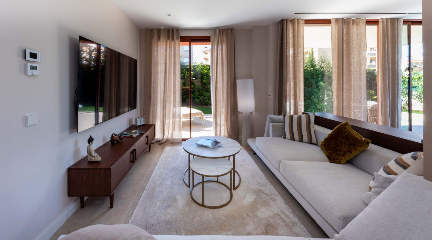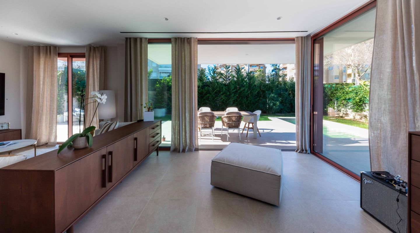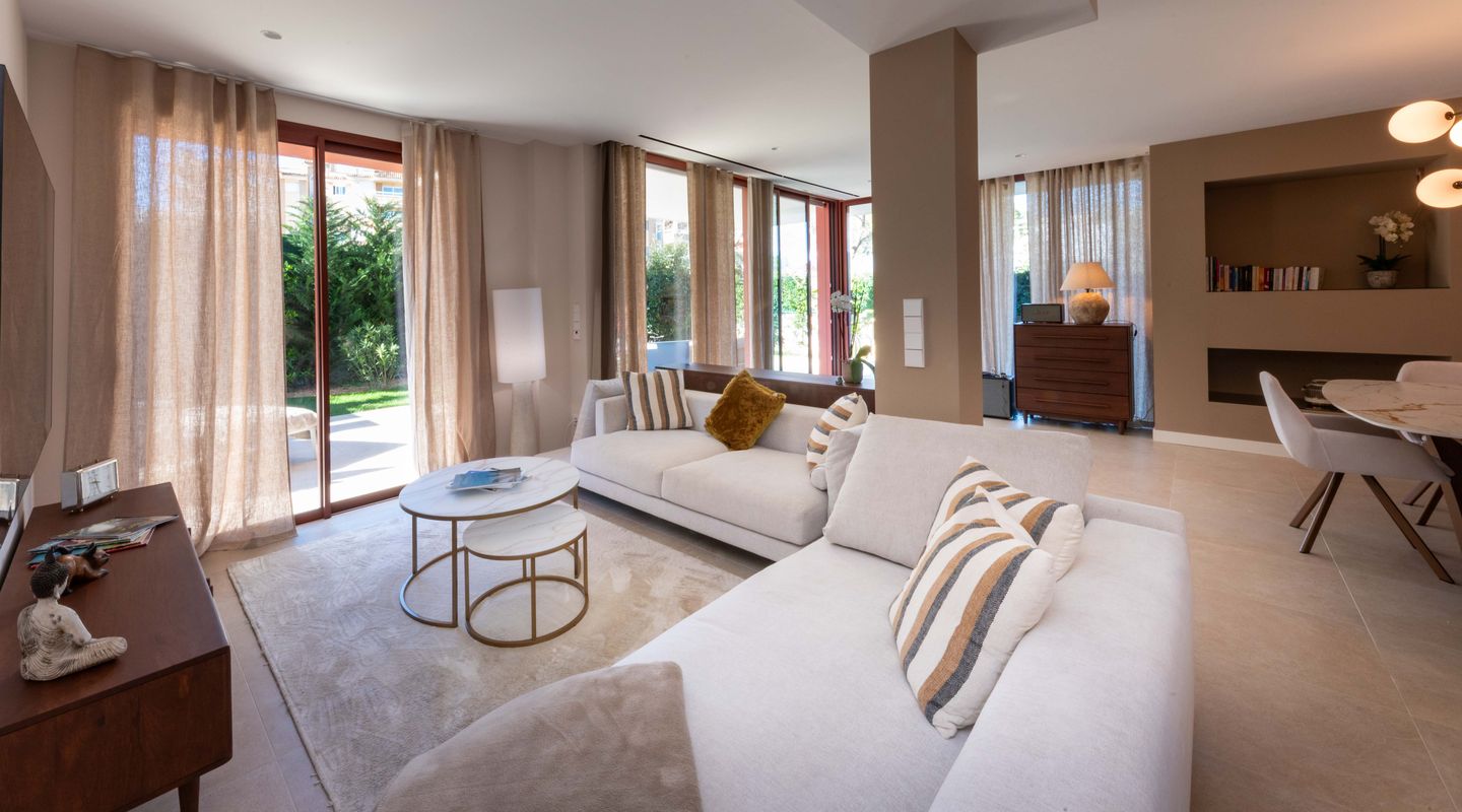 Todos los dormitorios tienen acceso directo a la amplia terraza y al jardín privado, creando un estilo de vida interior-exterior fluido y llenando el hogar de luz natural. El corazón de la propiedad es una luminosa y moderna zona de cocina abierta, salón y comedor, terminada con materiales de alta calidad.
