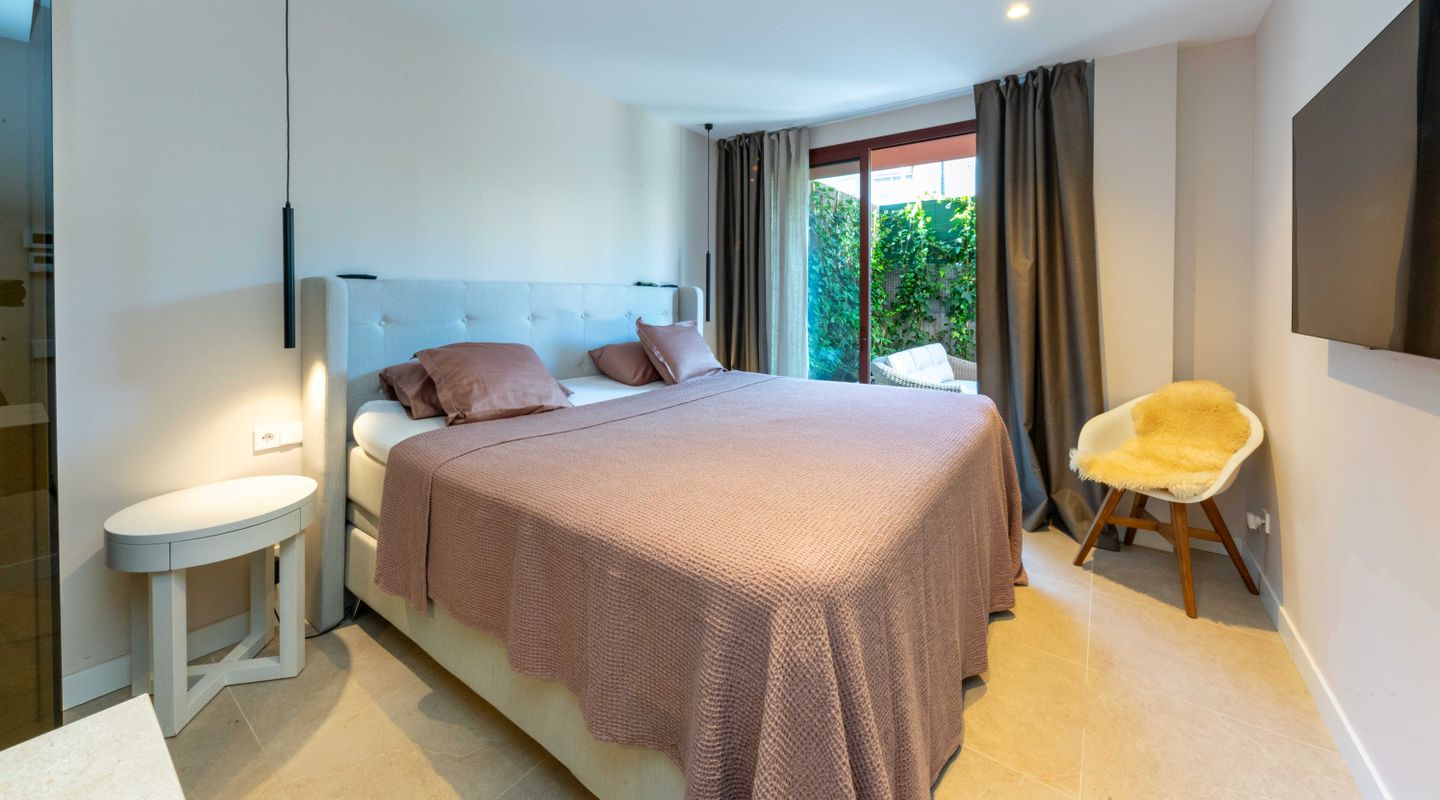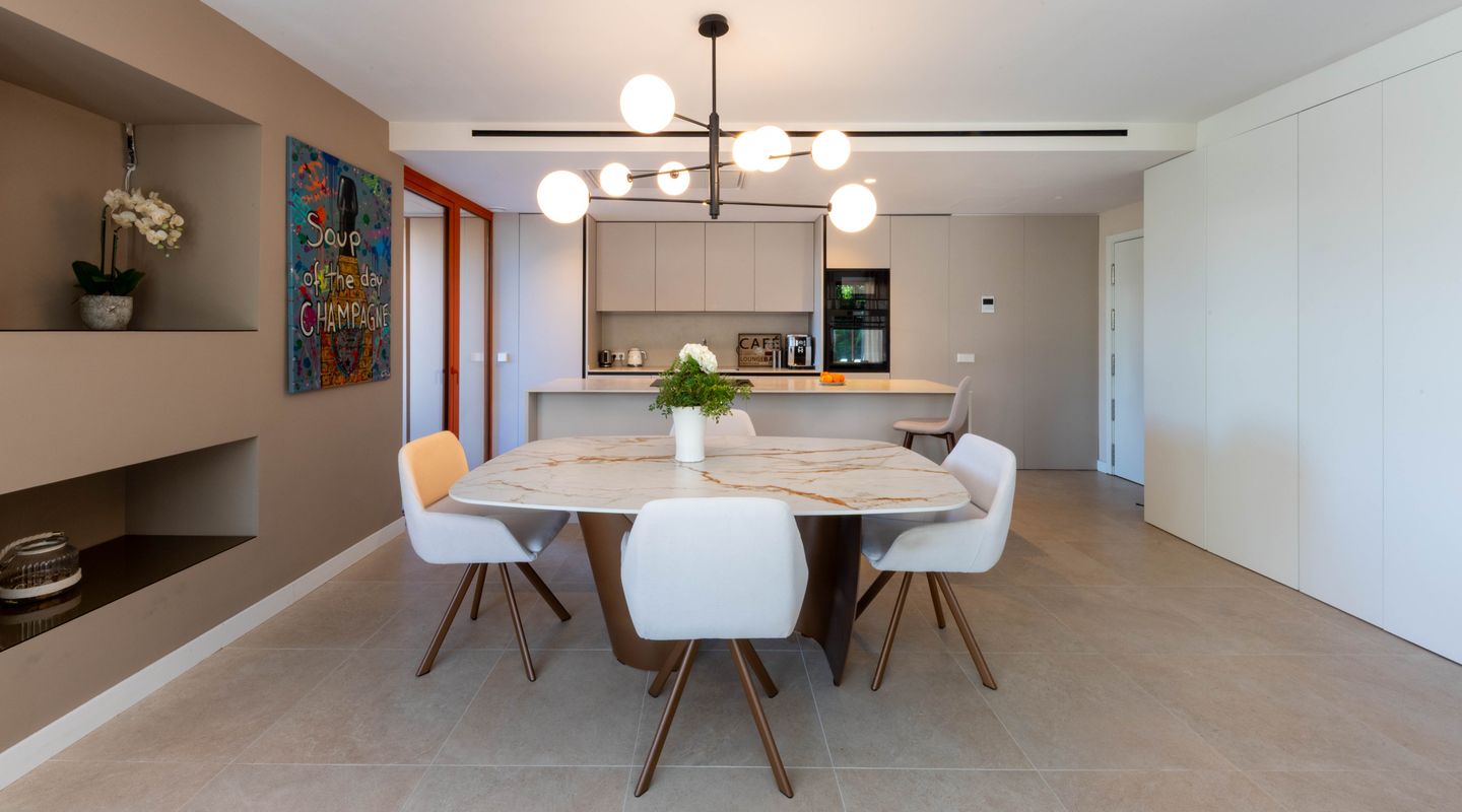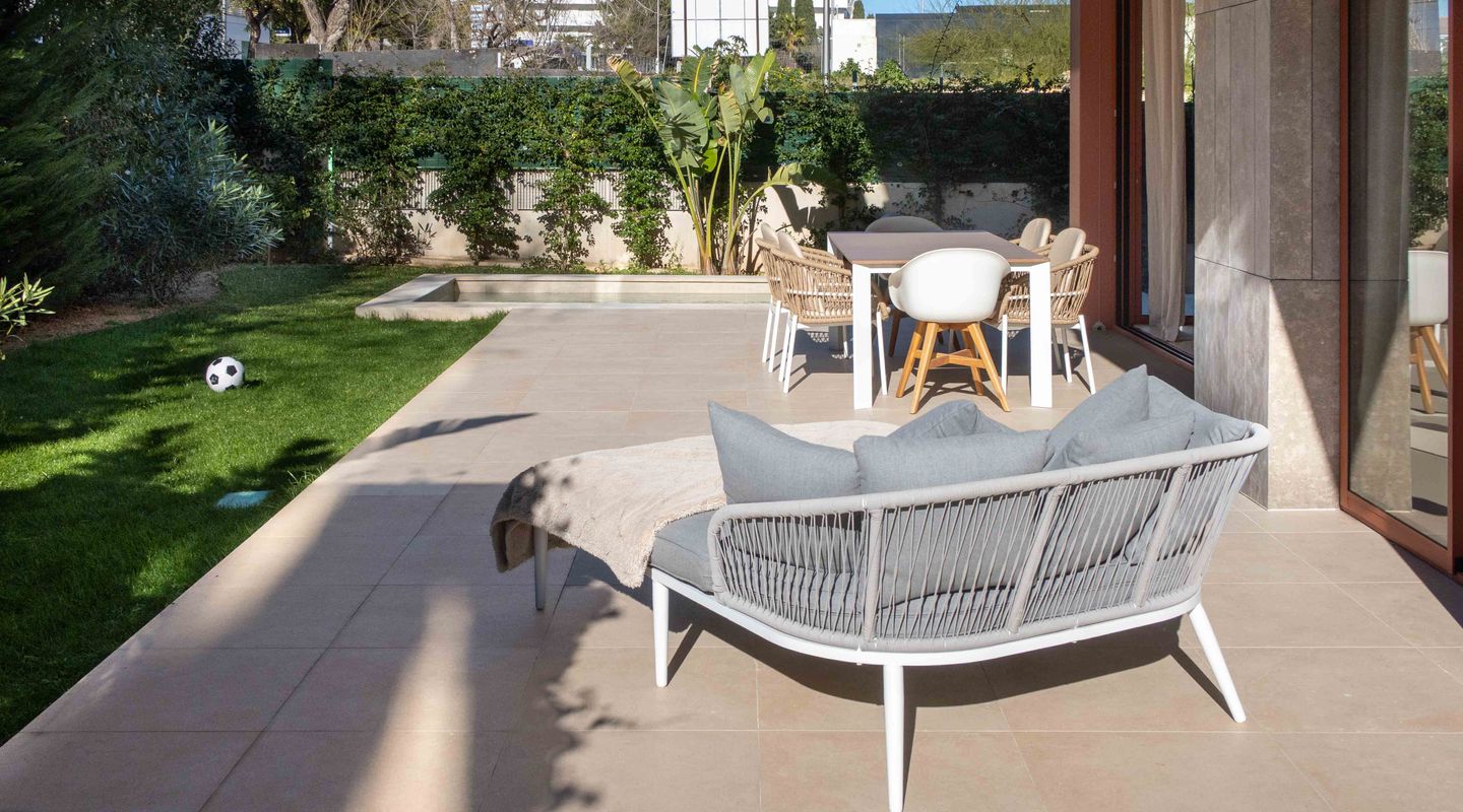 Todos los dormitorios tienen acceso directo a la amplia terraza y al jardín privado, creando un estilo de vida interior-exterior fluido y llenando el hogar de luz natural. El corazón de la propiedad es una luminosa y moderna zona de cocina abierta, salón y comedor, terminada con materiales de alta calidad.