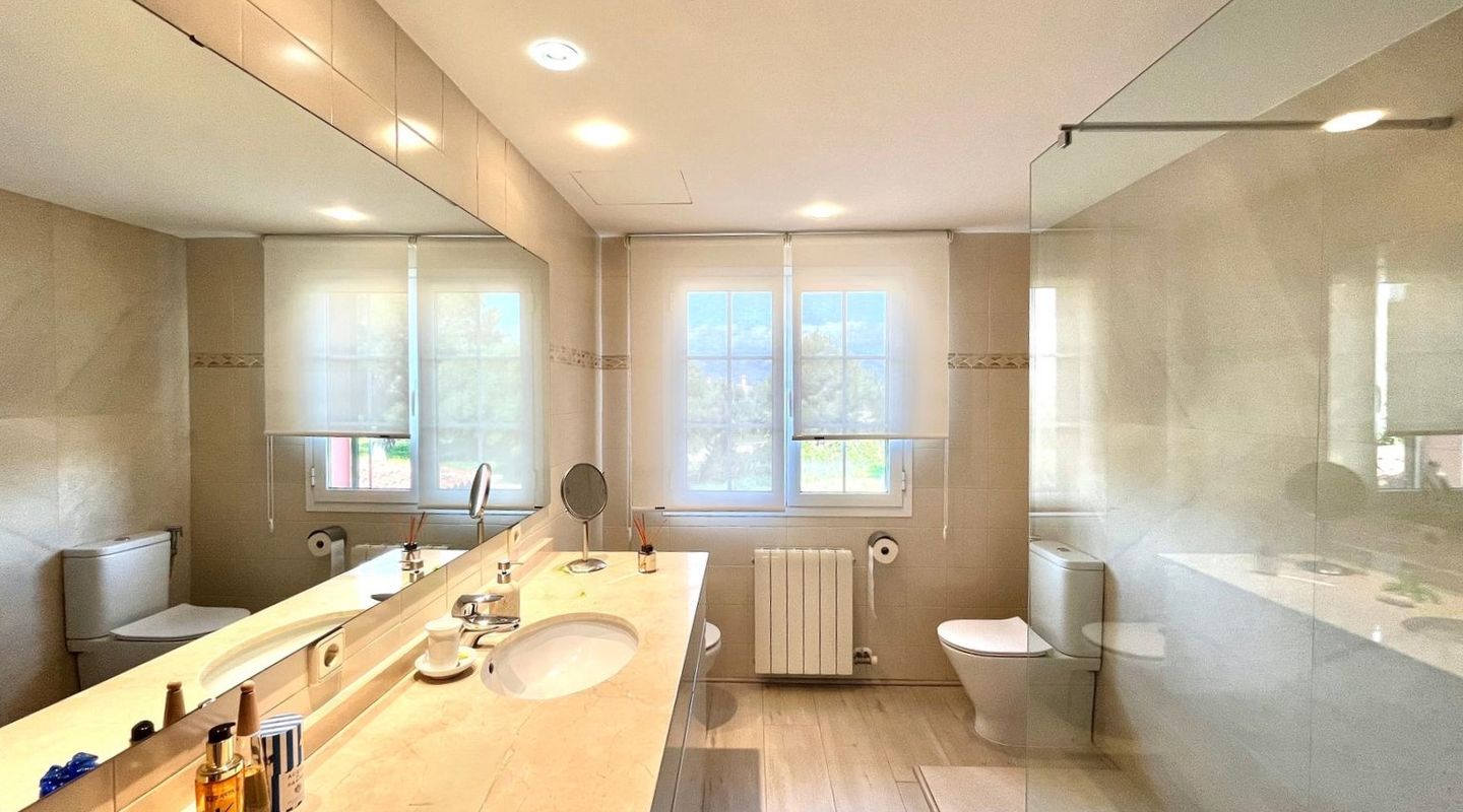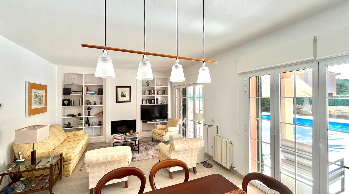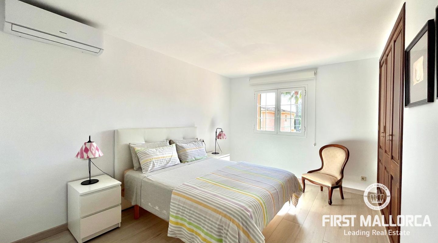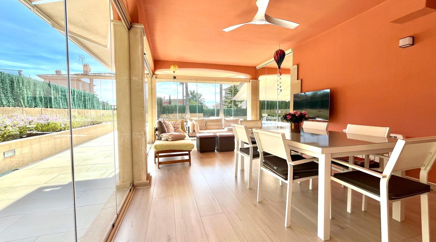 El corazón de la casa es el salón-comedor de concepto abierto, lleno de luz natural y con acceso directo al jardín y a la terraza con piscina. Desde aquí se disfrutan de preciosas vistas abiertas sobre la Bahía de Palma, que aportan una sensación especial de amplitud y conexión con el entorno.