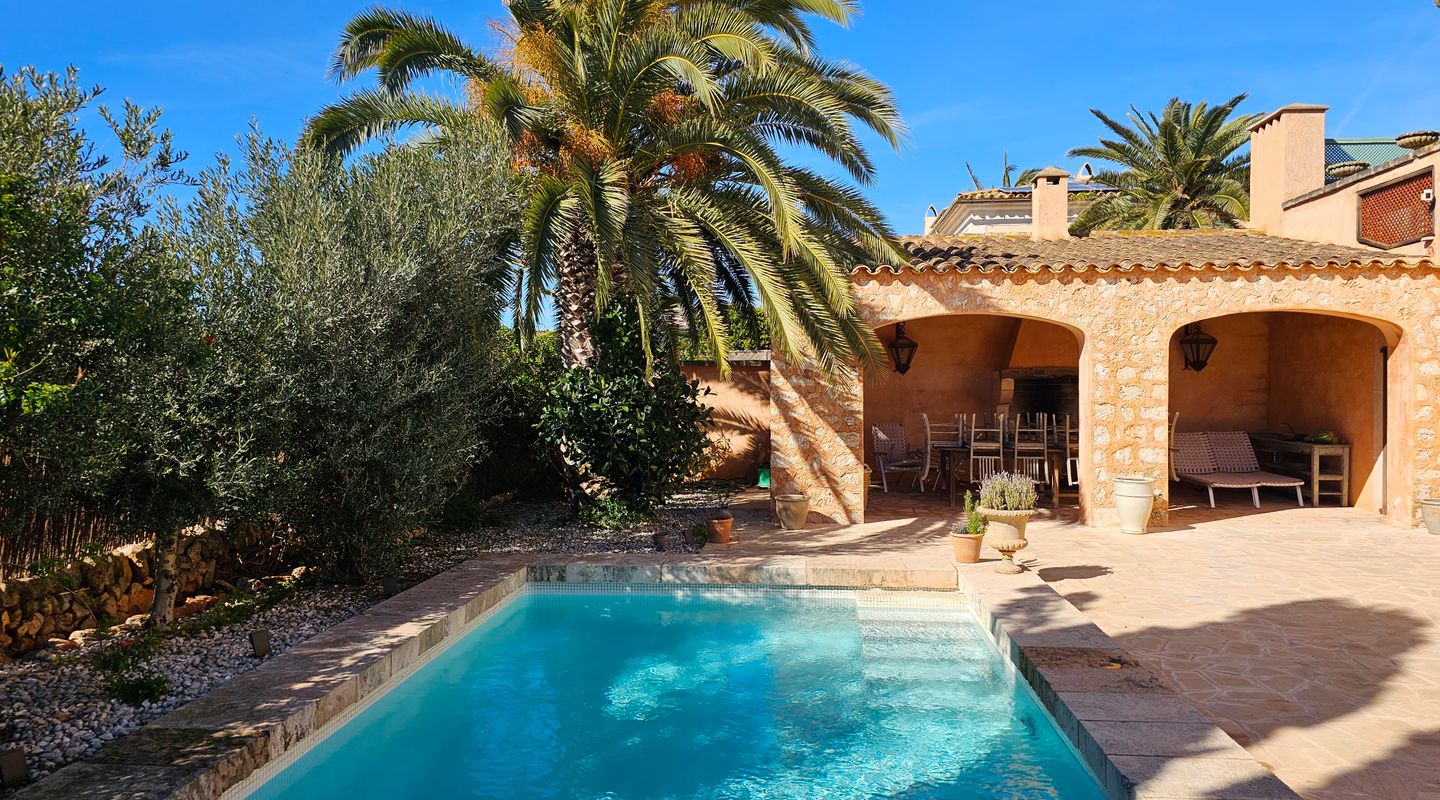 El área exterior es un punto destacado: piscina, zona de barbacoa cubierta y una majestuosa palmera crean el ambiente perfecto para días soleados y noches cálidas.