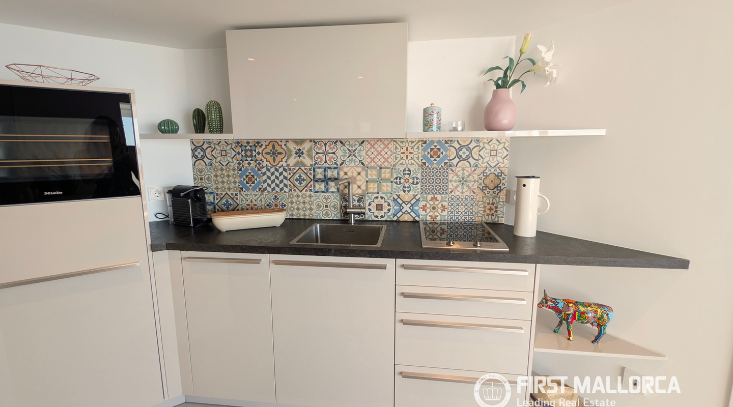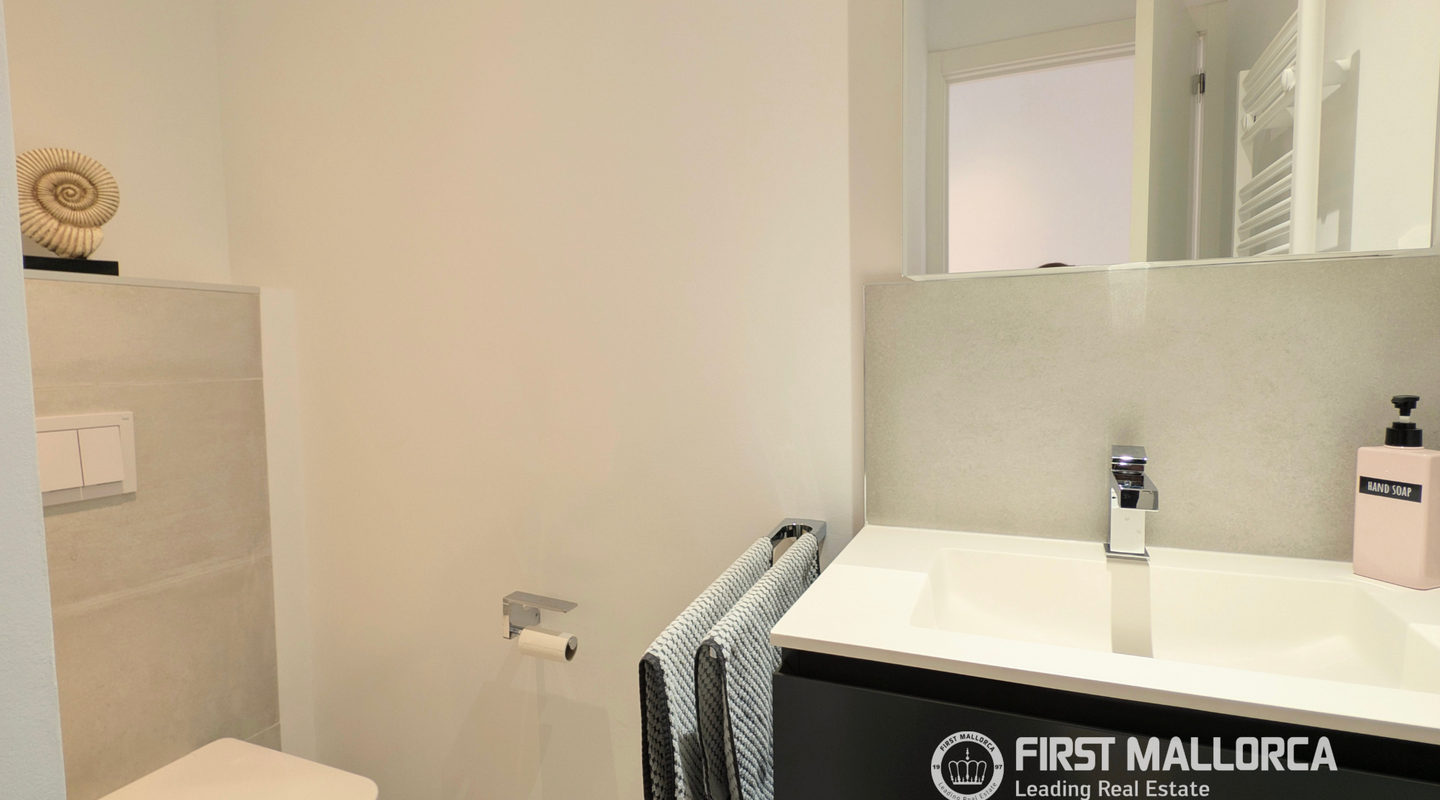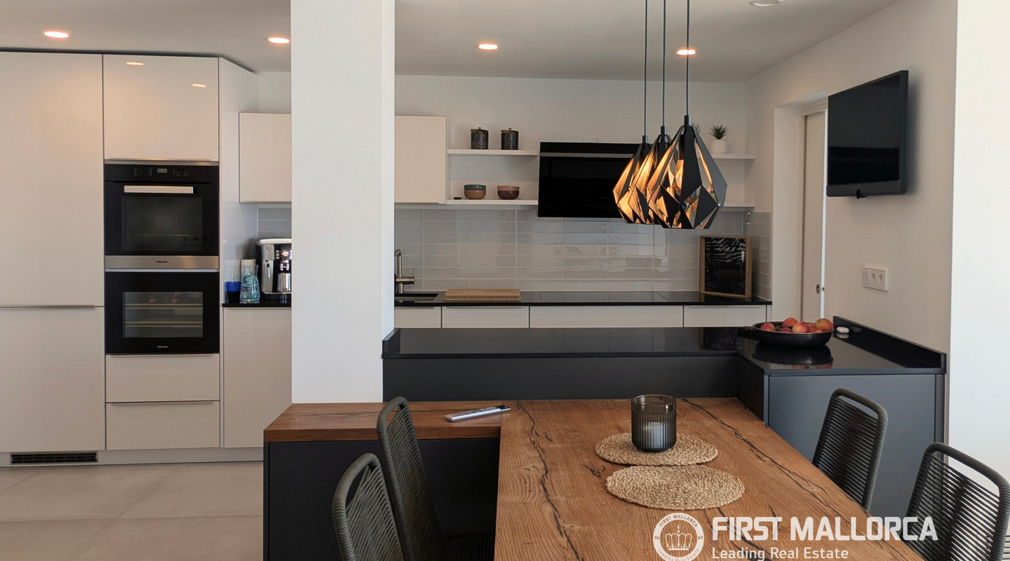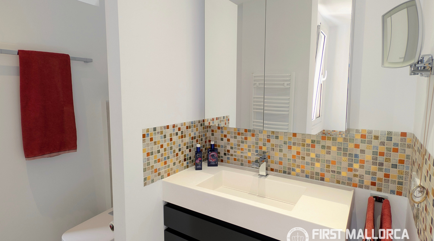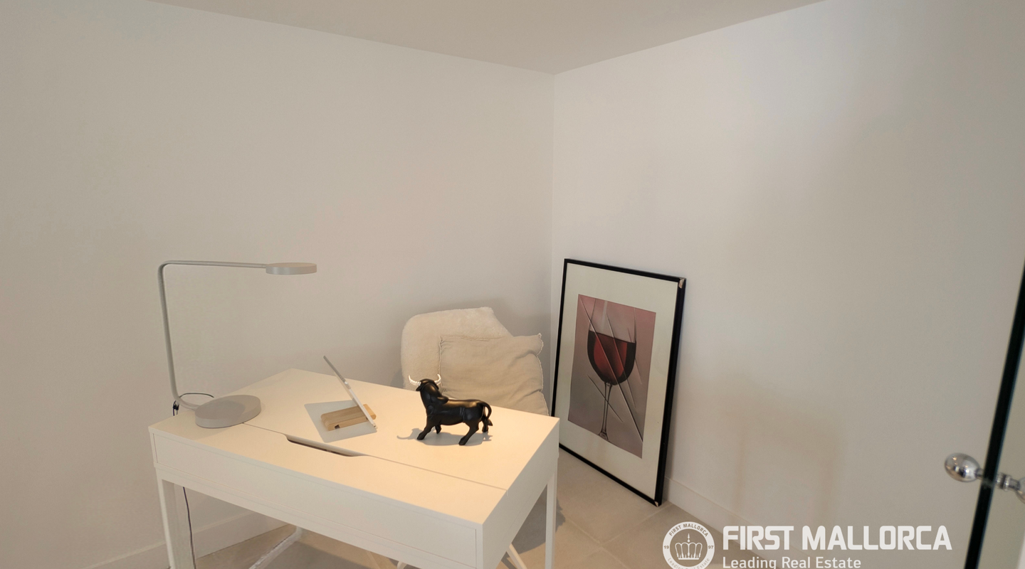 Una escalera interior conduce a la planta superior. Aquí encontramos un despacho muy luminoso, un baño de cortesía y una cocina independiente, totalmente equipada, con acceso directo a la azotea. Esta zona puede transformarse fácilmente en un dormitorio adicional con baño en suite, ofreciendo así más posibilidades de uso.