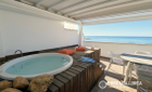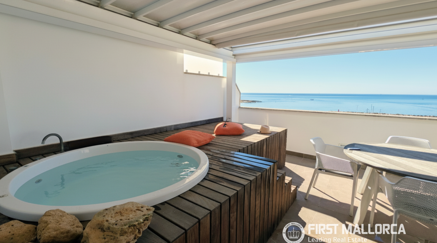 La amplia terraza en la azotea, orientada al sur, es uno de los puntos fuertes de la propiedad: cuenta con una moderna pérgola con sistema de sombreado eléctrico, jacuzzi y vistas despejadas al mar, lo que la convierte en el lugar perfecto para relajarse, tomar el sol y disfrutar de amaneceres y atardeceres.
