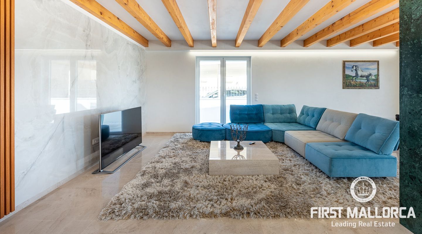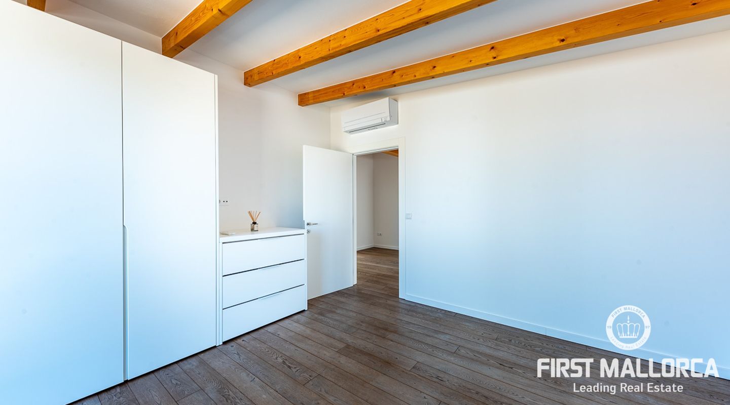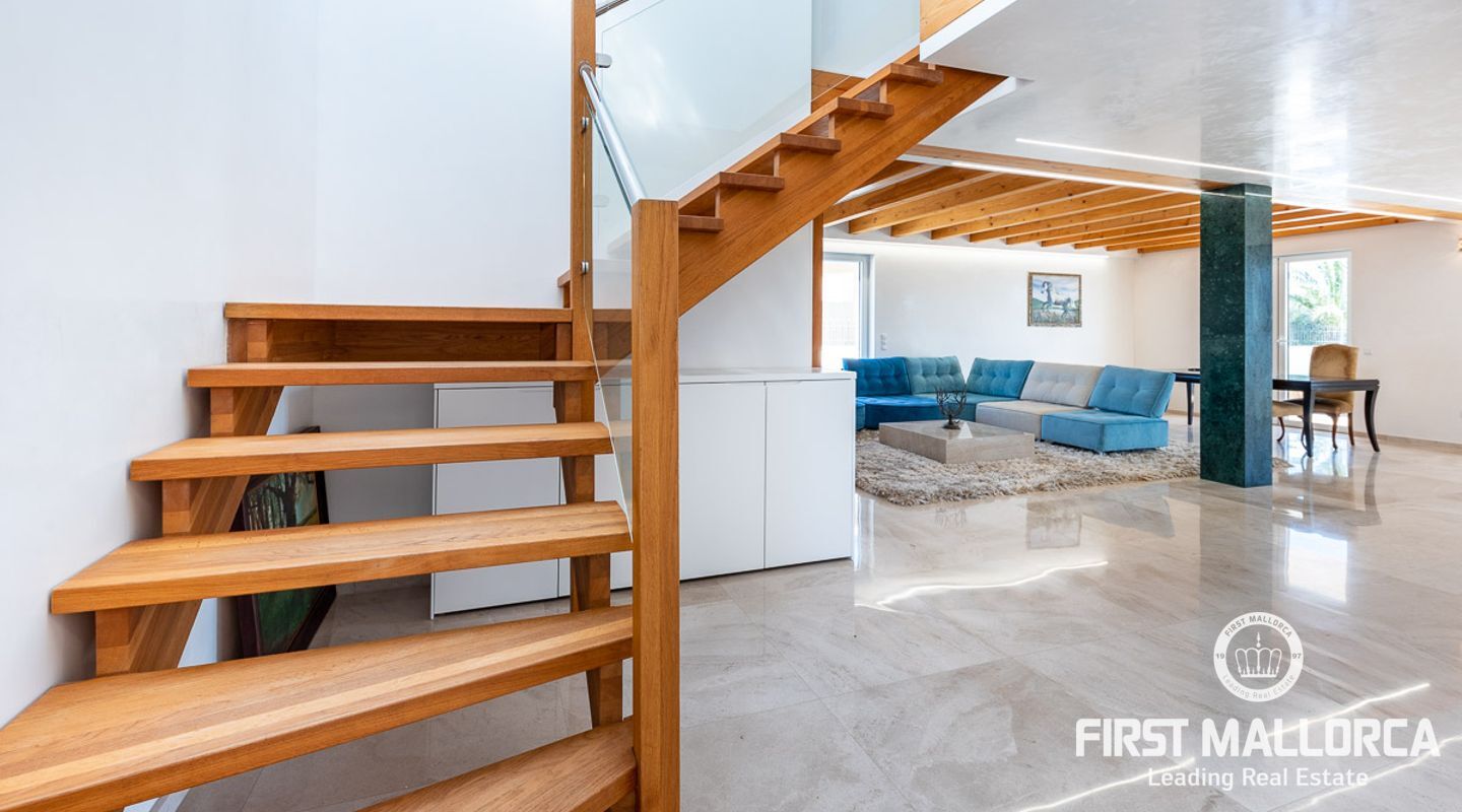 En la primera planta está el dormitorio principal en suite, dos dormitorios más, un baño y una habitación extra que se puede convertir en un amplio vestidor o una oficina. Además, uno de los dormitorios tiene acceso directo a la gran terraza, que se aprecia tanto por el día como por la noche con las luces encendidas.
