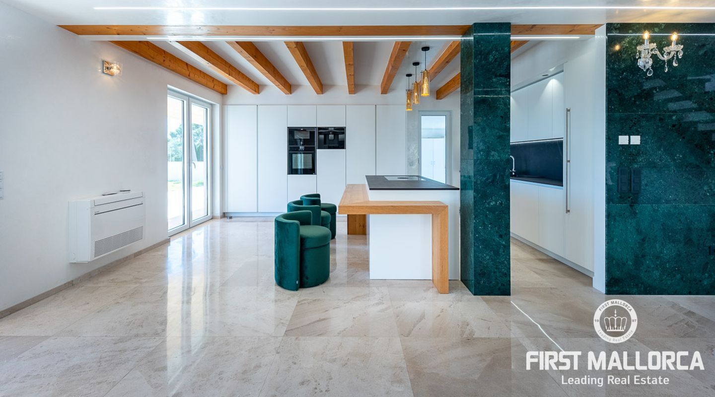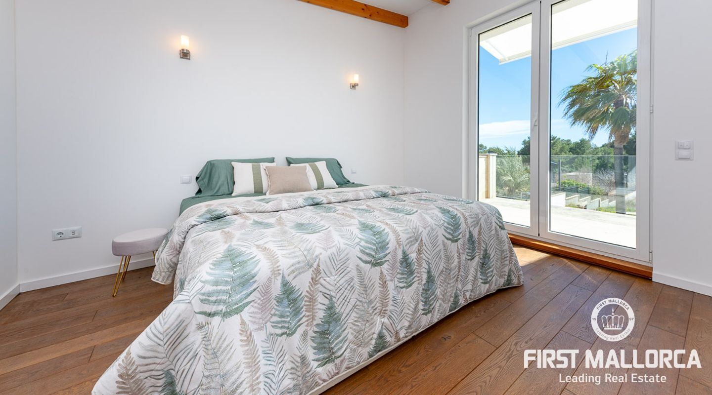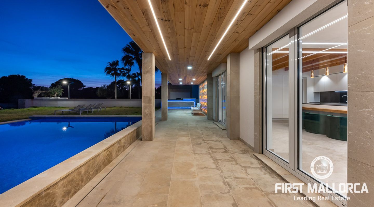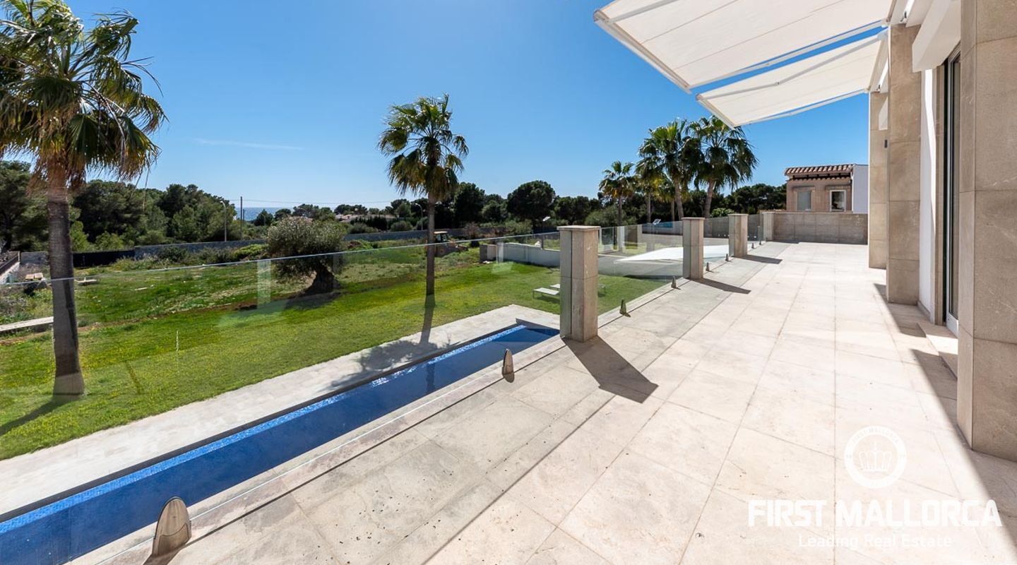 En la primera planta está el dormitorio principal en suite, dos dormitorios más, un baño y una habitación extra que se puede convertir en un amplio vestidor o una oficina. Además, uno de los dormitorios tiene acceso directo a la gran terraza, que se aprecia tanto por el día como por la noche con las luces encendidas.