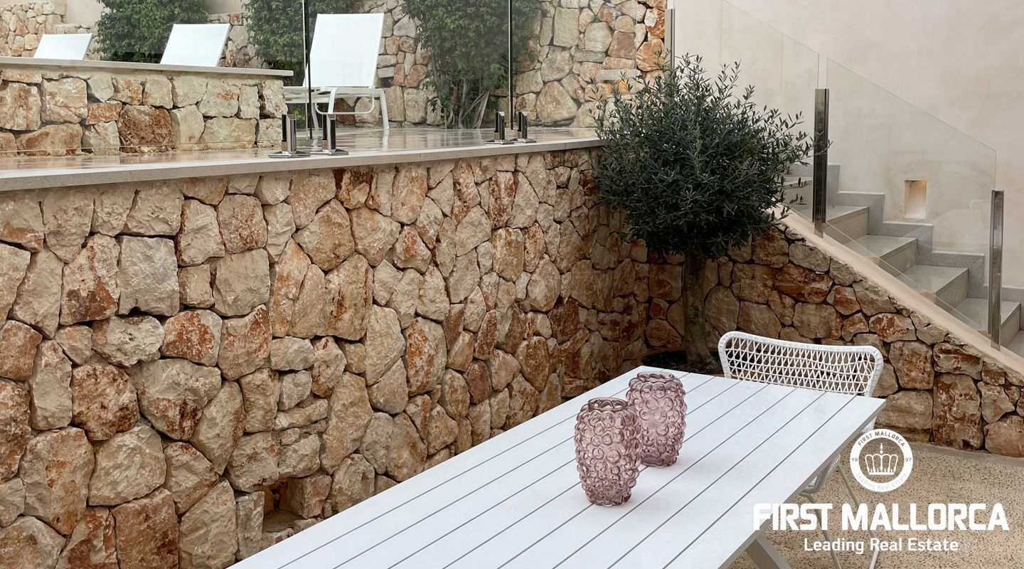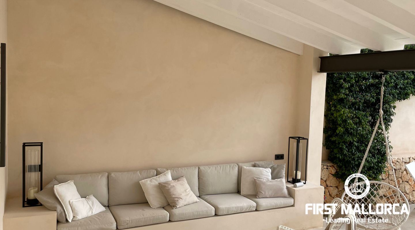 Al salir al exterior, el encantador patio invita a disfrutar del estilo de vida mediterráneo. Una zona de estar sombreada ofrece el espacio perfecto para relajarse, mientras que unos escalones conducen a una terraza soleada y una refrescante piscina de agua salada. La pared de piedra natural del patio y la iluminación tenue en la noche refuerzan la atmósfera serena.