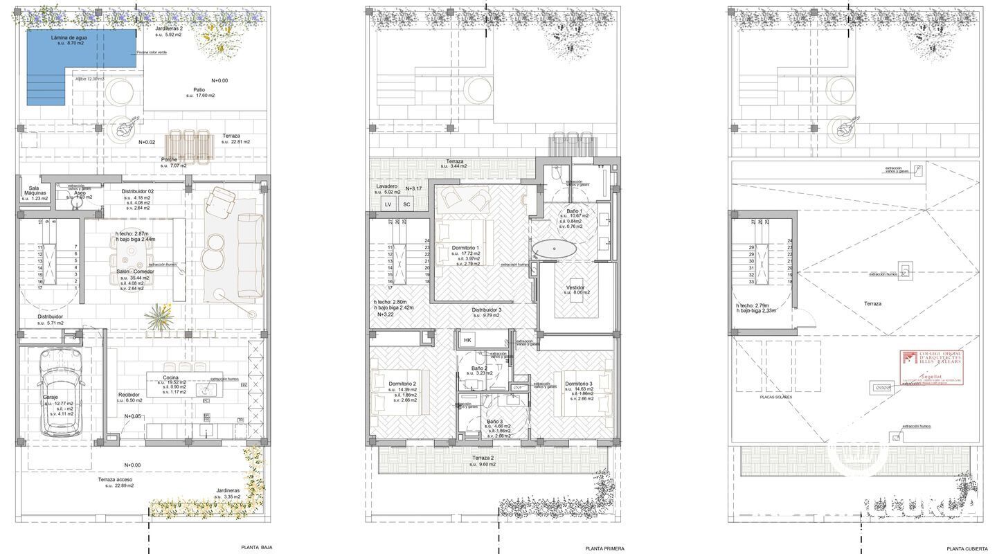 Características del Proyecto: 3 habitaciones dobles con balcones, incluyendo una master suite con vestidor y terraza privada. 4 baños diseñados para máxima comodidad. Terraza superior ideal para disfrutar las vistas. Espaciosa terraza y jardín con piscina privada. Parking privado para 1 coche y varias motos. Chimenea, añadiendo calidez al diseño.