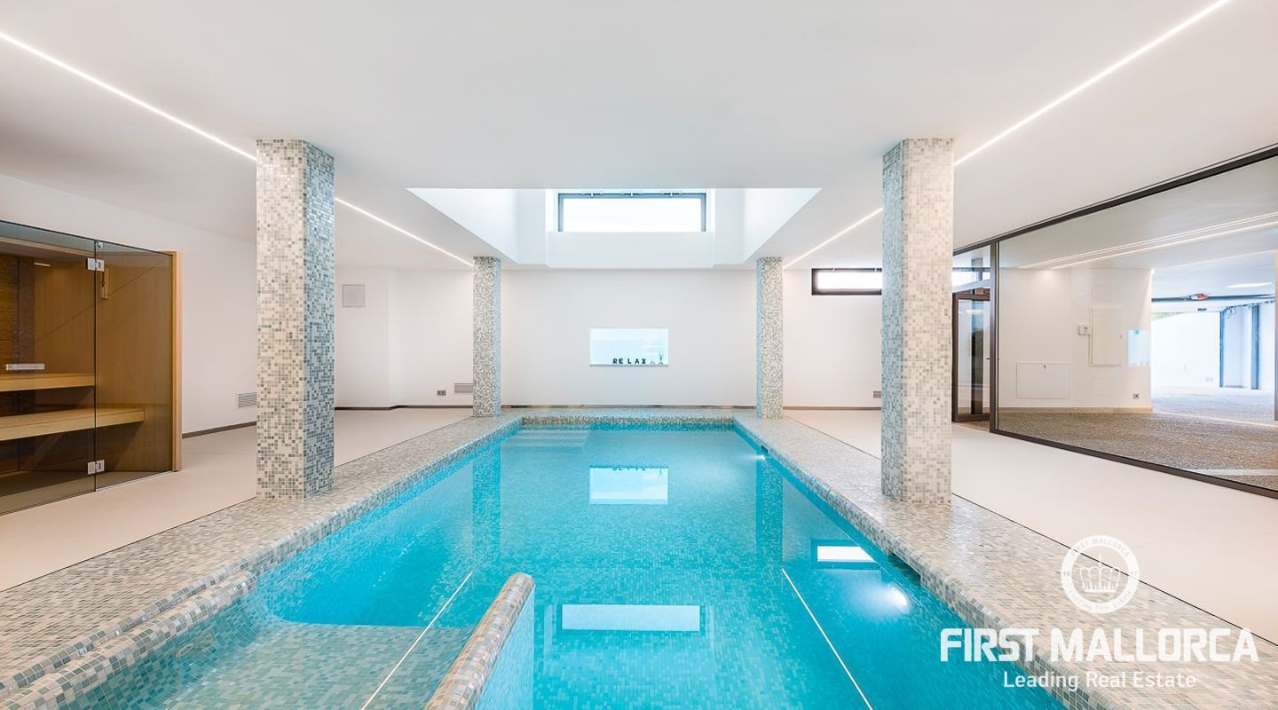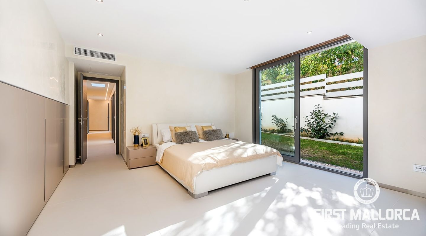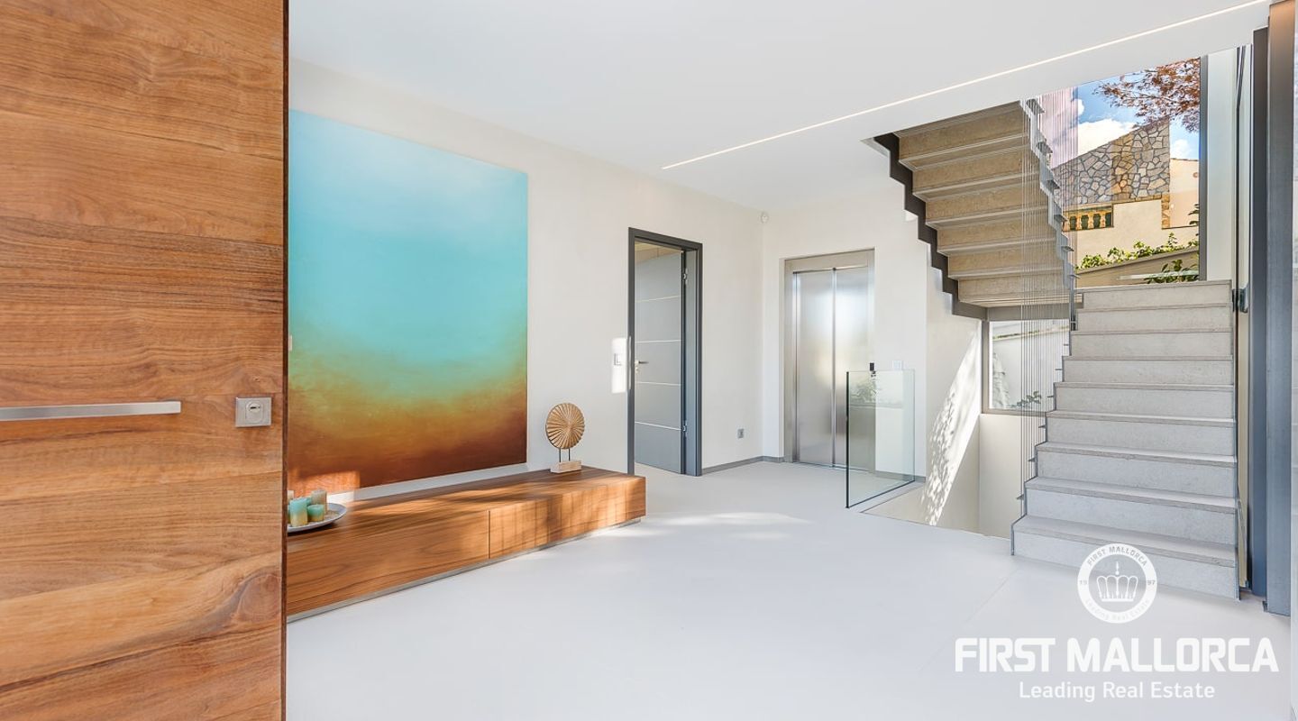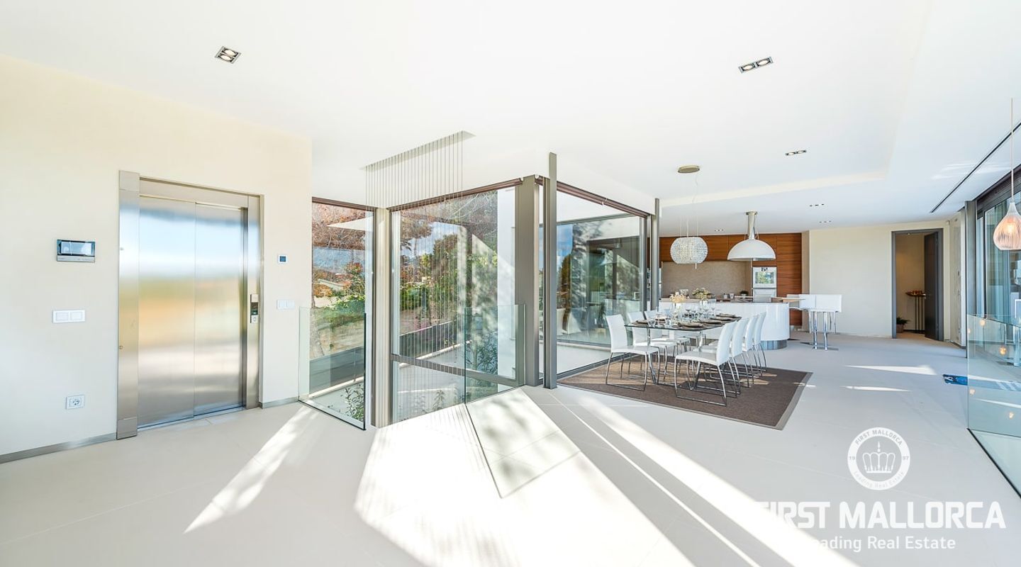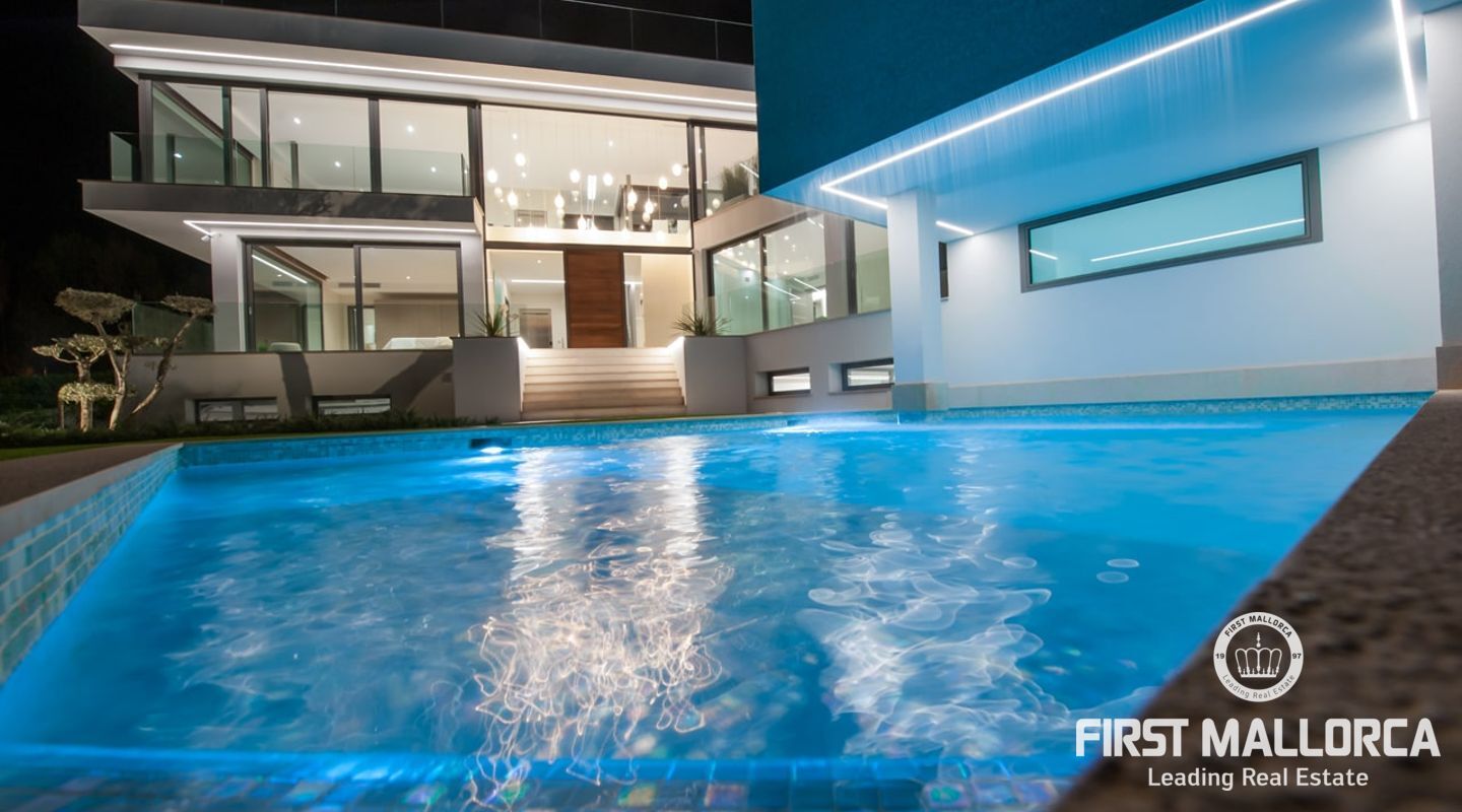 Esta impresionante villa de nueva construcción con vistas al mar fue construida en 2017 en una parcela de 1.275m2 en una tranquila calle residencial de Nova Santa Ponsa. Esta propiedad de lujo de construcción de primera clase ofrece un total de 5 dormitorios en el nivel de entrada, todos con baños en suite. El ascensor, que también está conectado con el garaje, conduce a la sala de estar principal con una amplia zona al aire libre y maravillosas vistas al mar y panorámicas. Cada nivel tiene su propia piscina, con la superior desbordando espectacularmente en la inferior mediante una cascada. Además, una azotea de 153m2 invita a tomar el sol, desde aquí se puede disfrutar de una vista de 360 grados sobre el mar y las montañas. En el sótano, donde hay un apartamento de invitados y 2 plazas de aparcamiento, hay una zona de spa con sala de fitness, piscina cubierta climatizada, sauna y mucho más para relajarse y disfrutar. Características de esta fantástica villa de diseño moderno son: Calefacción por suelo radiante, aire acondicionado frío/calor, ventanas de aluminio con doble acristalamiento, garaje, chimenea de gas, sistema domótico, sistema de alarma y vídeo, ascensor, zona de SPA, barbacoa.