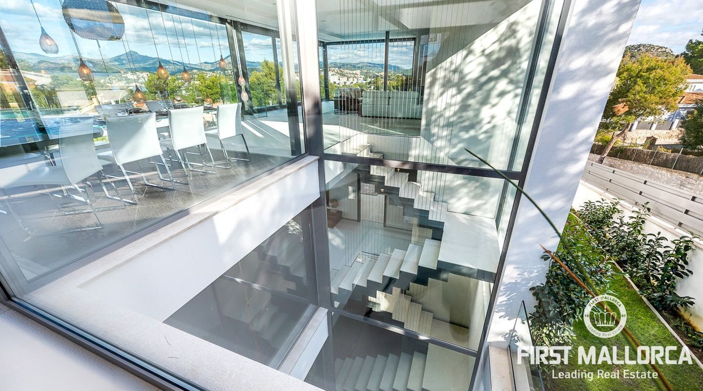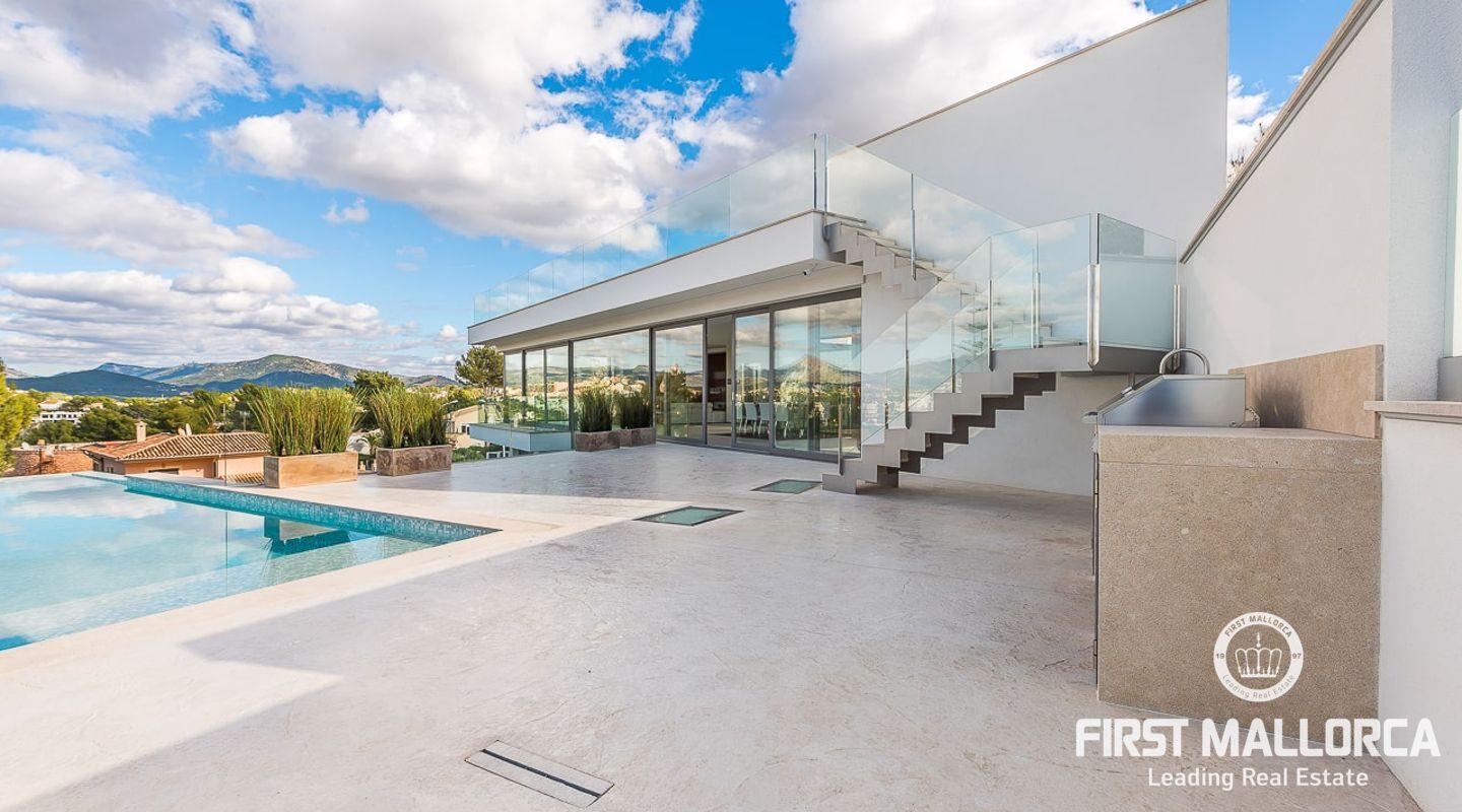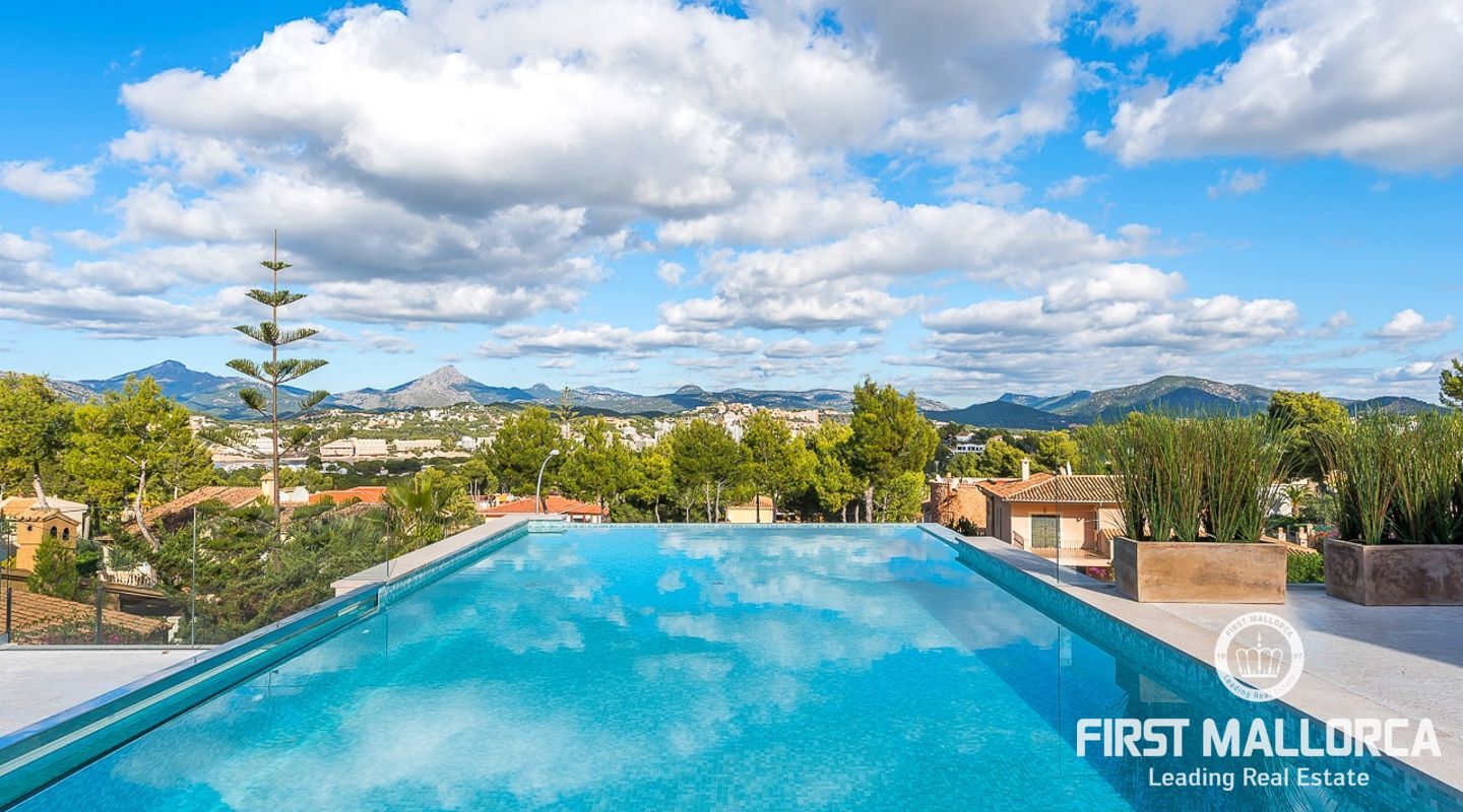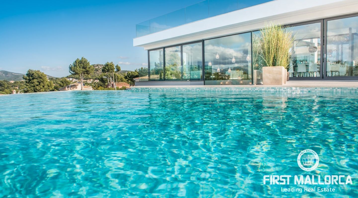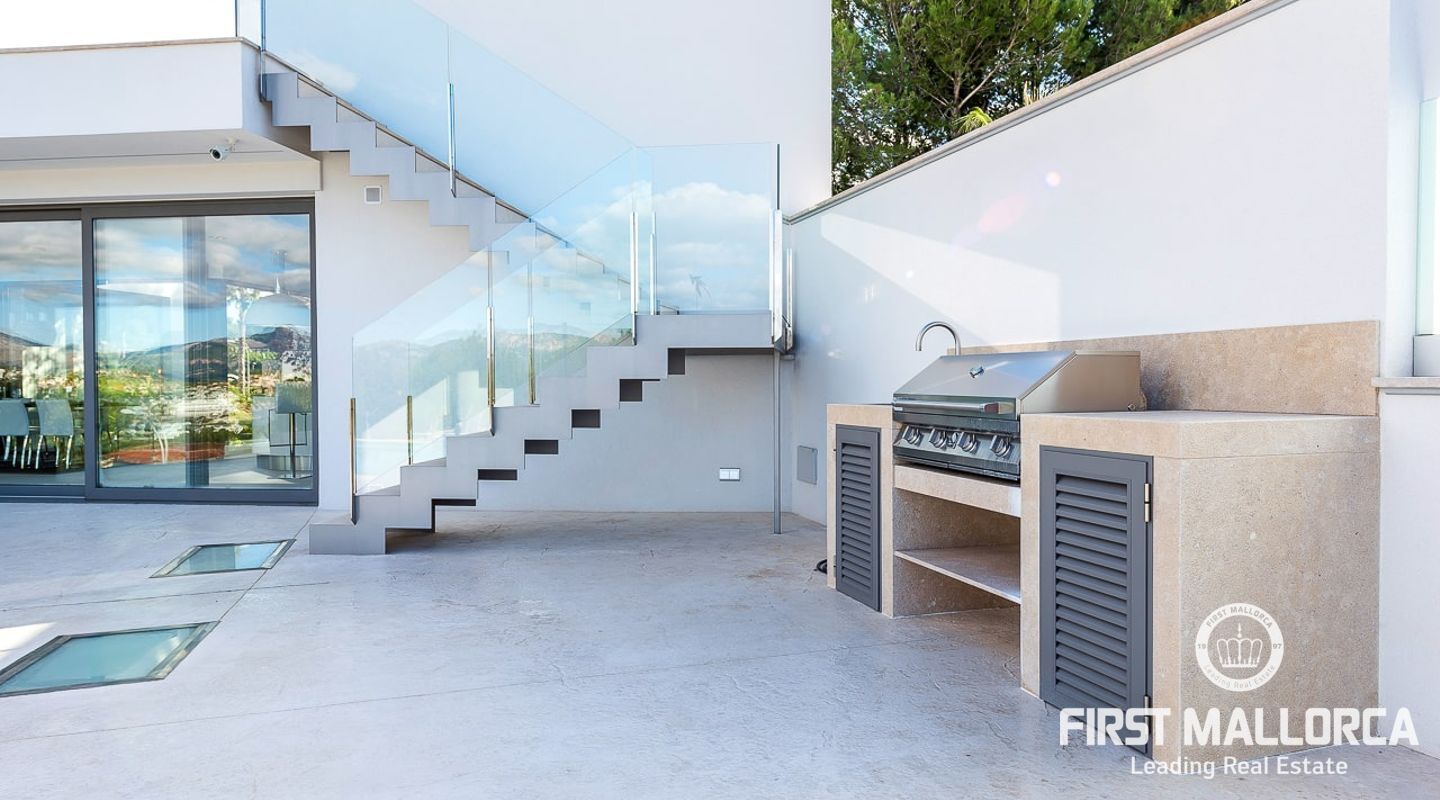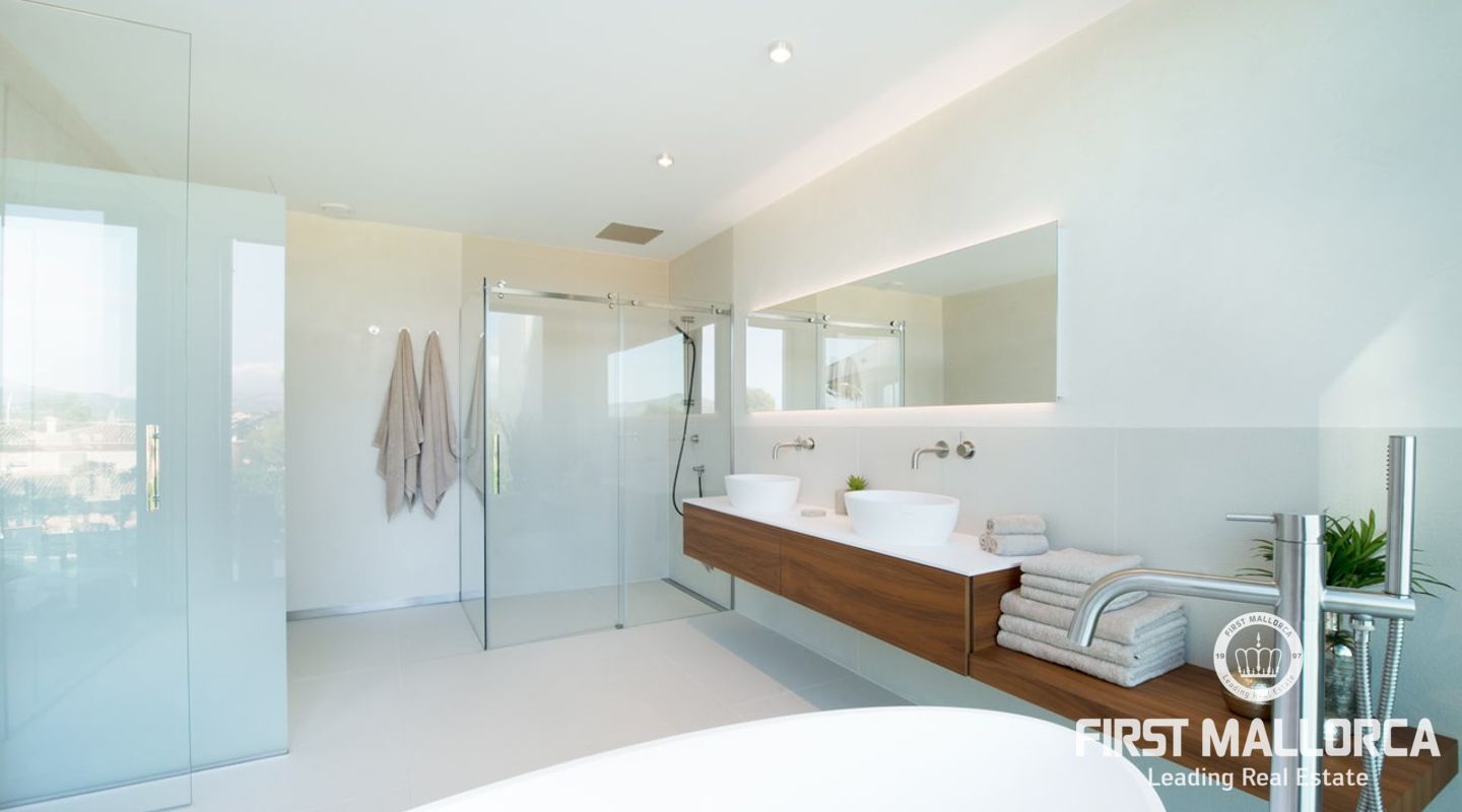 Esta impresionante villa de nueva construcción con vistas al mar fue construida en 2017 en una parcela de 1.275m2 en una tranquila calle residencial de Nova Santa Ponsa. Esta propiedad de lujo de construcción de primera clase ofrece un total de 5 dormitorios en el nivel de entrada, todos con baños en suite. El ascensor, que también está conectado con el garaje, conduce a la sala de estar principal con una amplia zona al aire libre y maravillosas vistas al mar y panorámicas. Cada nivel tiene su propia piscina, con la superior desbordando espectacularmente en la inferior mediante una cascada. Además, una azotea de 153m2 invita a tomar el sol, desde aquí se puede disfrutar de una vista de 360 grados sobre el mar y las montañas. En el sótano, donde hay un apartamento de invitados y 2 plazas de aparcamiento, hay una zona de spa con sala de fitness, piscina cubierta climatizada, sauna y mucho más para relajarse y disfrutar. Características de esta fantástica villa de diseño moderno son: Calefacción por suelo radiante, aire acondicionado frío/calor, ventanas de aluminio con doble acristalamiento, garaje, chimenea de gas, sistema domótico, sistema de alarma y vídeo, ascensor, zona de SPA, barbacoa.