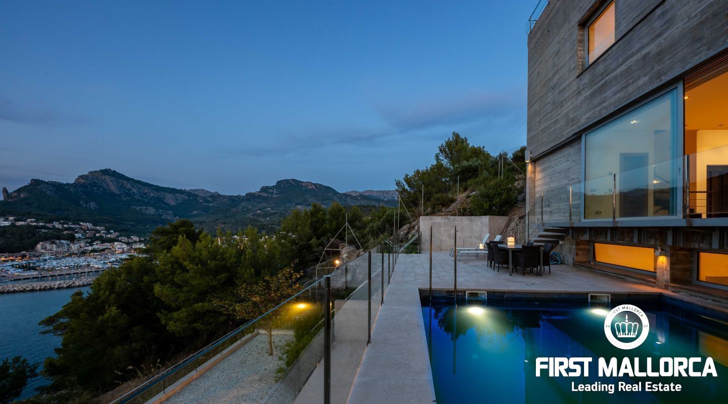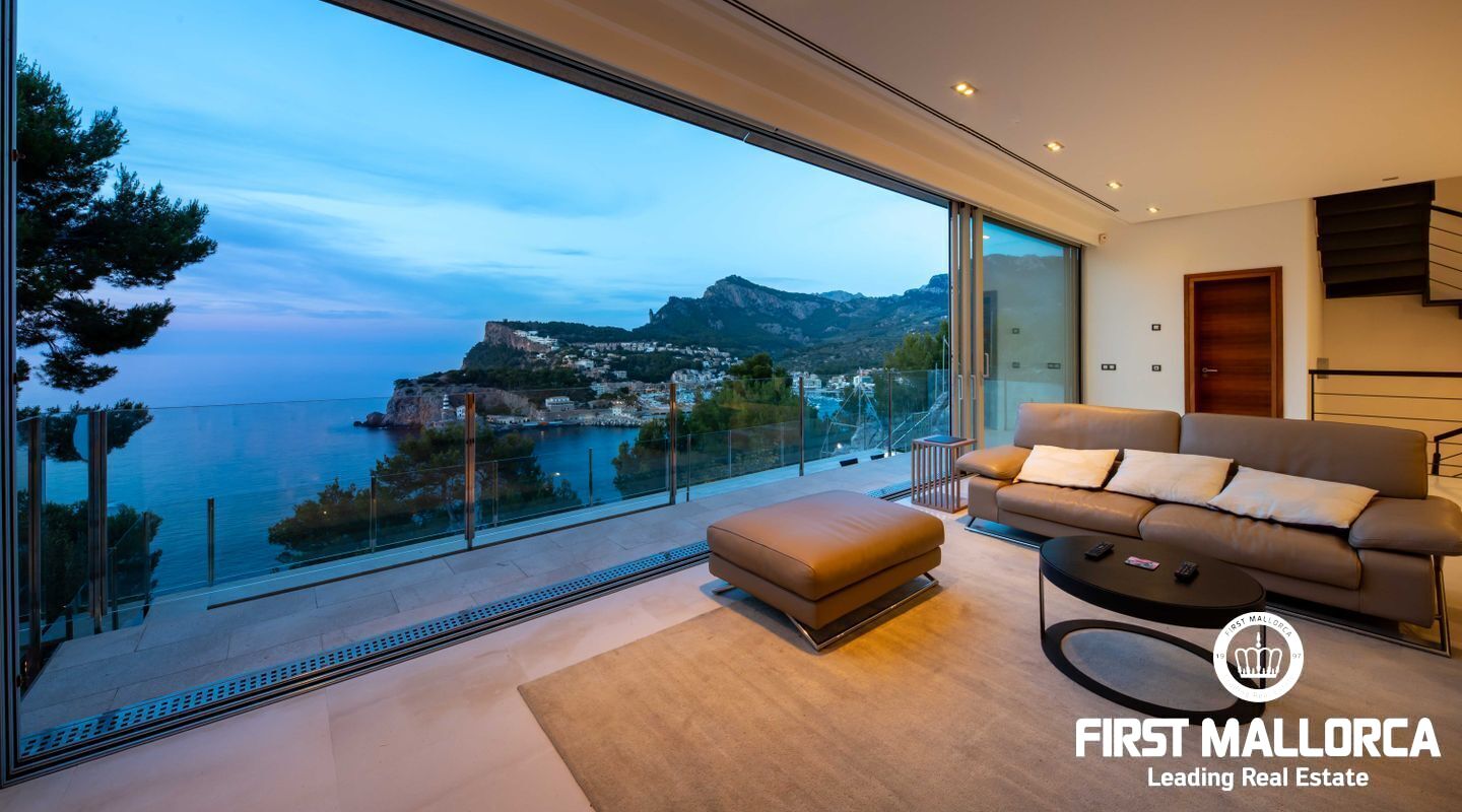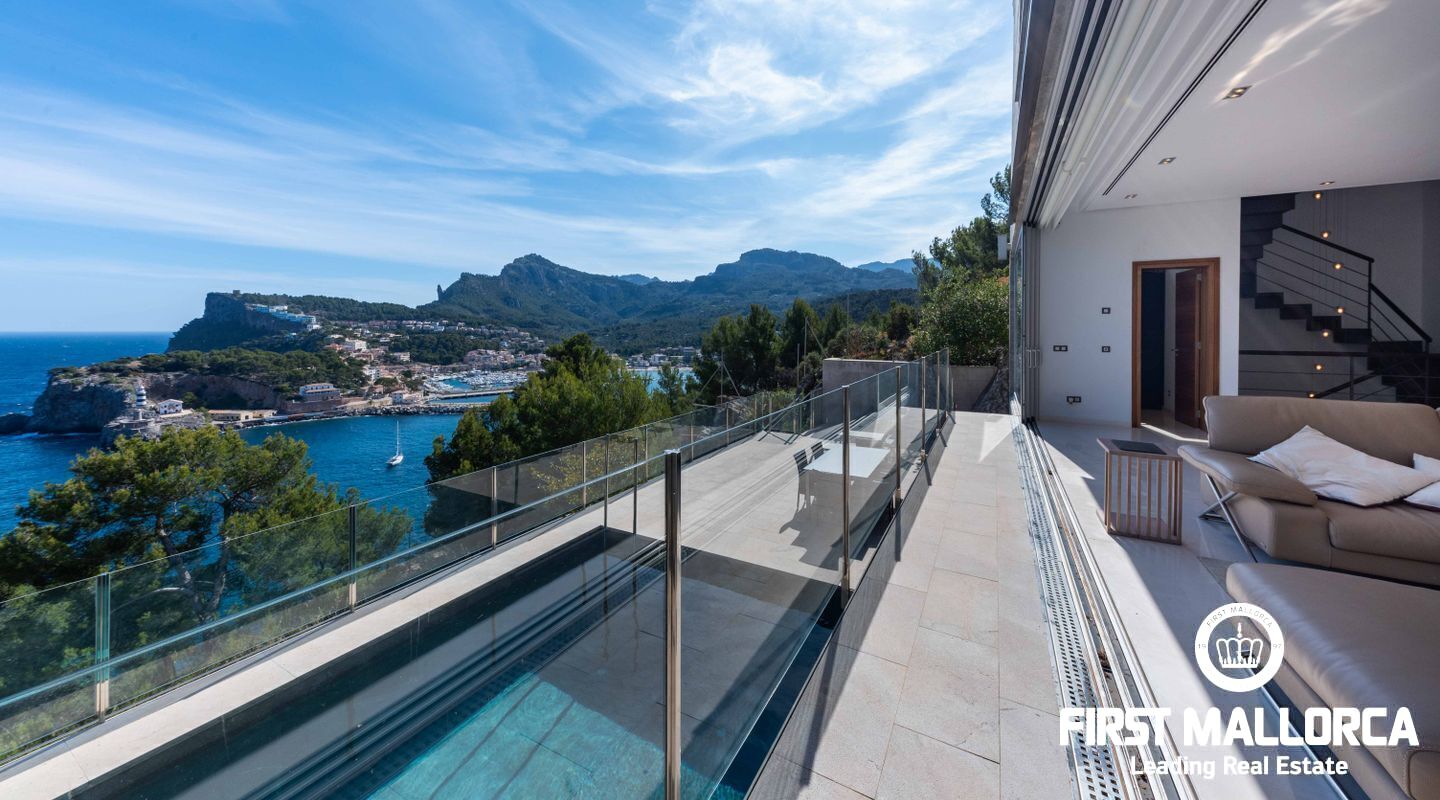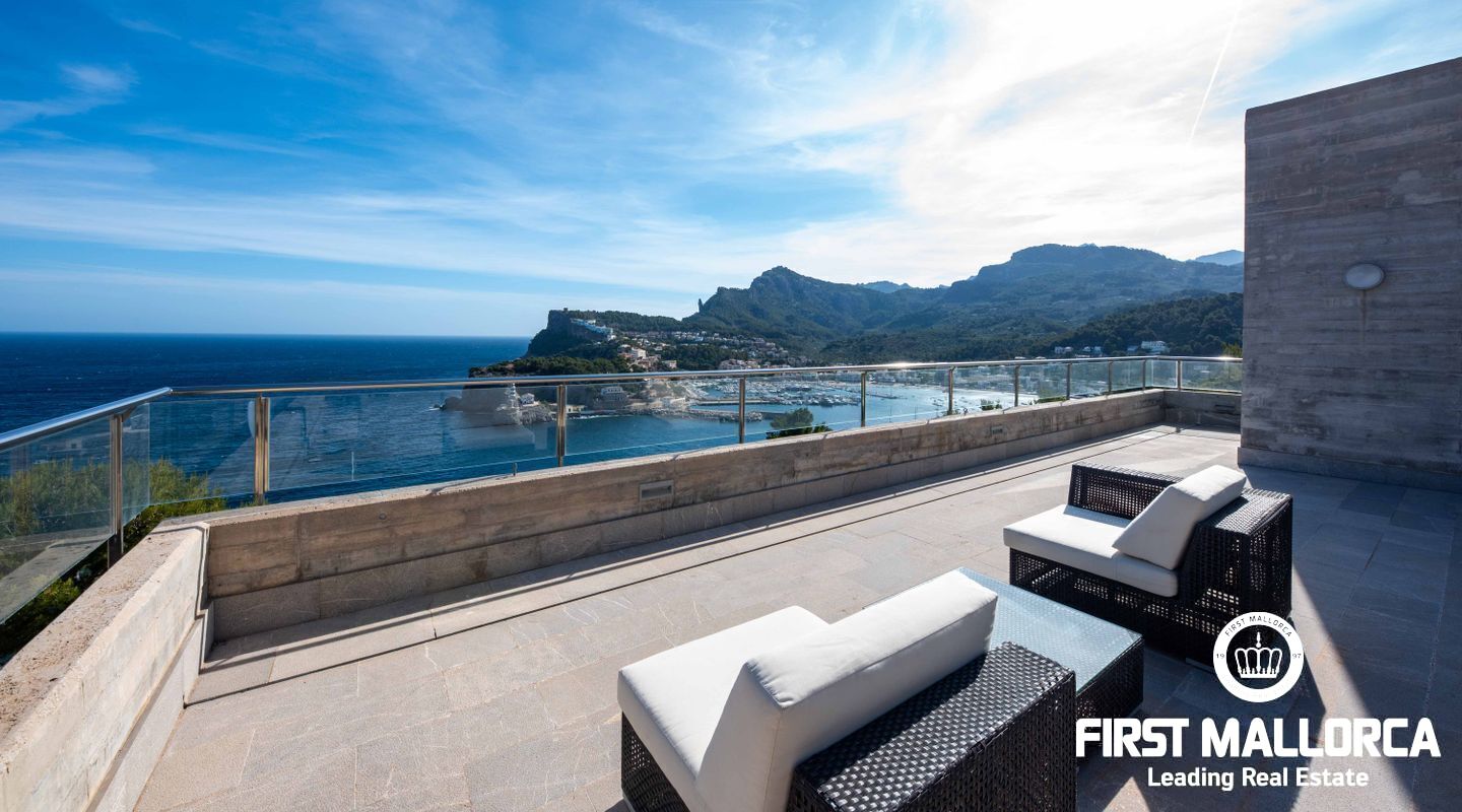 Moderna villa con impresionantes vistas al puerto y al mar en Puerto de Sóller en la costa oeste de Mallorca.