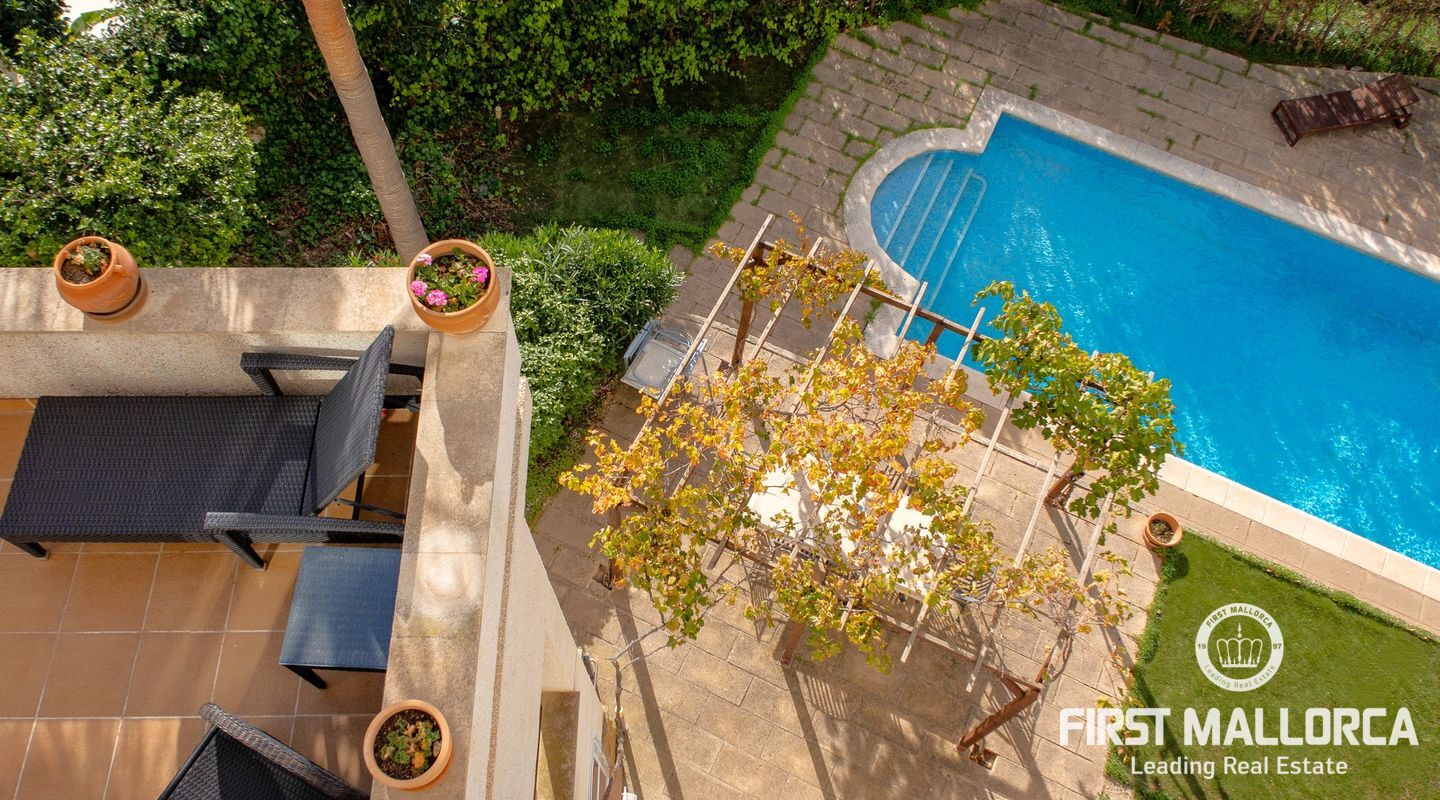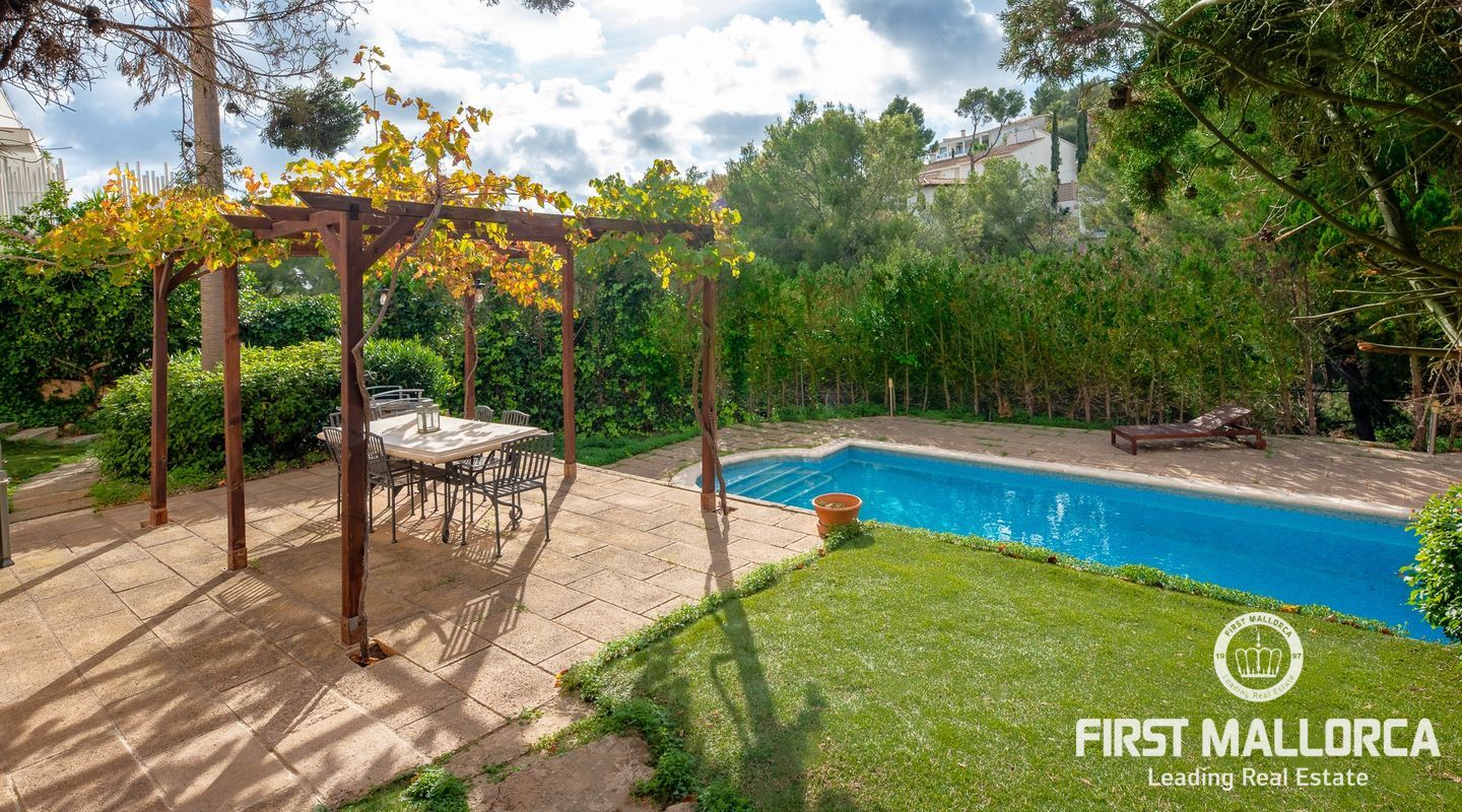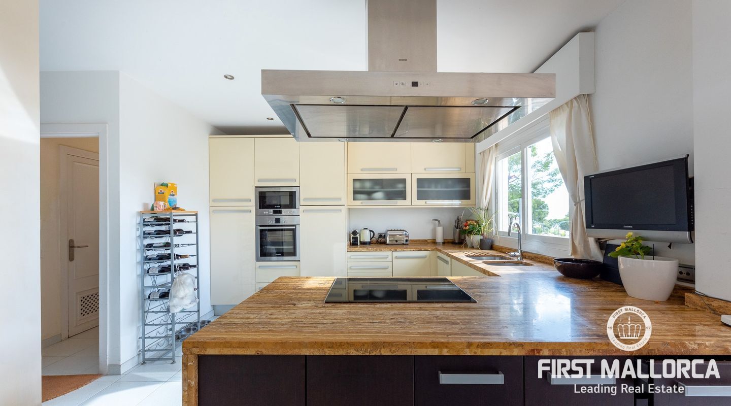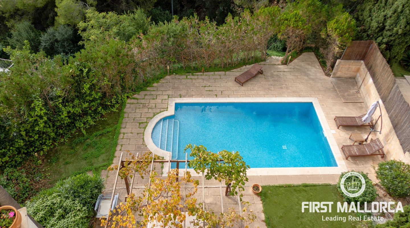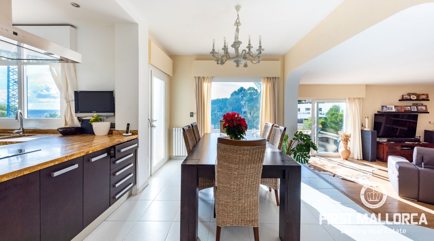 Дом с южной стороны, построенный в 1989 году, расположен в тихом районе Коста д'эн Бланес, откуда открывается частичный вид на море. Дом имеет большой потенциал и расположен на 2 уровнях. На верхнем этаже находятся прихожая с туалетом для гостей, оборудованная кухня, столовая, гостиная с камином и выходом на террасу с частичным видом на море. На первом этаже находятся 4 спальни и 2 ванные комнаты, одна из которых с ванной комнатой и гардеробной со встроенным шкафом, а также крытая терраса и прачечная. С этого этажа есть выход в сад, на большую террасу с беседкой, зоной отдыха и бассейном. В доме также есть отдельная гостевая квартира площадью 35 м2 с гостиной-кухней и ванной комнатой. Также имеется большая терраса на крыше с панорамным видом на море и горы. Другие особенности: центральное газовое отопление, камин, кондиционеры в каждой спальне, встроенные шкафы, прачечная, парковка на две машины.