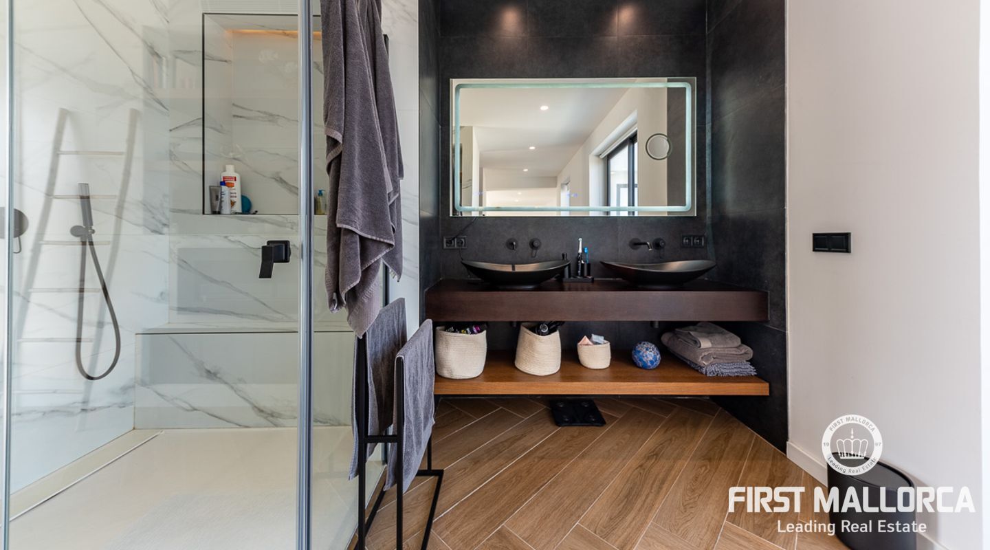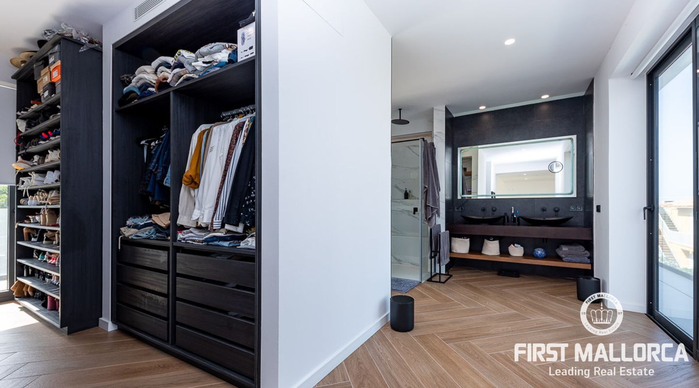Trappan i entréhallen med 8 m höga glaselement leder till master-sviten på första våningen. Ett helt avskalat utrymme som kombinerar master bedroom med delvis utsikt över Palmas kust och ett fristående badrum med omklädningsrum, turkiskt bad, toalett och dusch med bänk. Ett fjärde sovrum kan skapas i detta område om det behövs. Från denna våning finns tillgång till en balkong på framsidan av fastigheten samt till den stora terrassen med utsikt över poolen och trädgården och en trappa som leder till en takterrass med vatten- och elförsörjning.