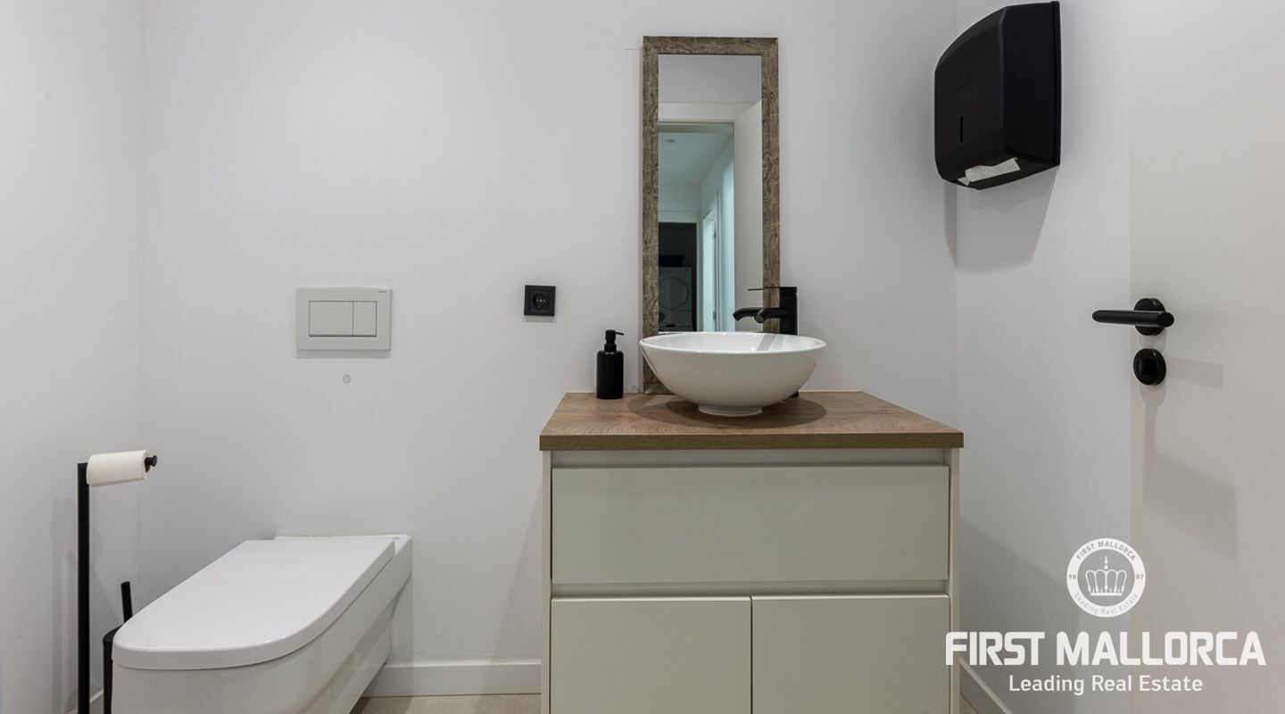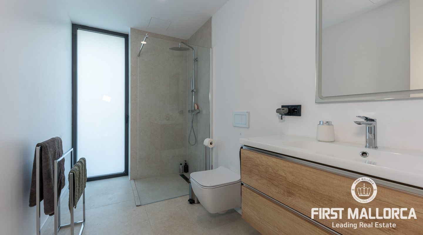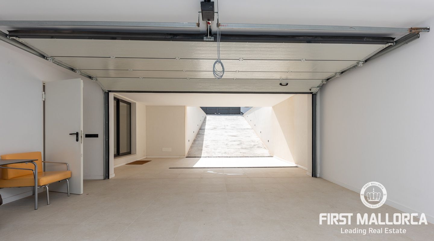 Denna ljusa villa på cirka 401 m2 nära Palma färdigställdes 2022. På bottenvåningen finns ett rymligt vardagsrum/matsal med öppen planlösning och elektrisk bioetanolspis, ett fullt utrustat kök med köksö och integrerad osynlig induktionshäll i toppmoderna "Cooking Surface" porslinskakel med marmorutseende. Stora fönster från golv till tak på båda sidor och dubbel höjd säkerställer maximalt naturligt ljus och en generös känsla av utrymme. Två sovrum med utgång till terrassen delar på ett badrum med dusch.