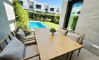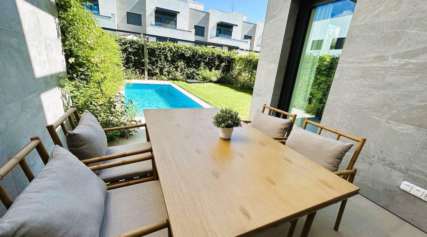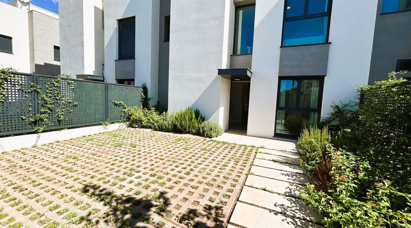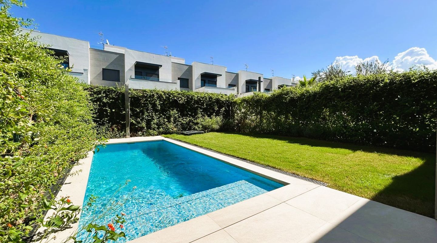 Huset erbjuder 4 sovrum, 3 badrum, ett öppet kök och vardagsrum, två parkeringsplatser ovan jord, en rymlig trädgård med gräsmatta och privat pool, samt en takterrass i solariumstil – ett mycket attraktivt erbjudande.