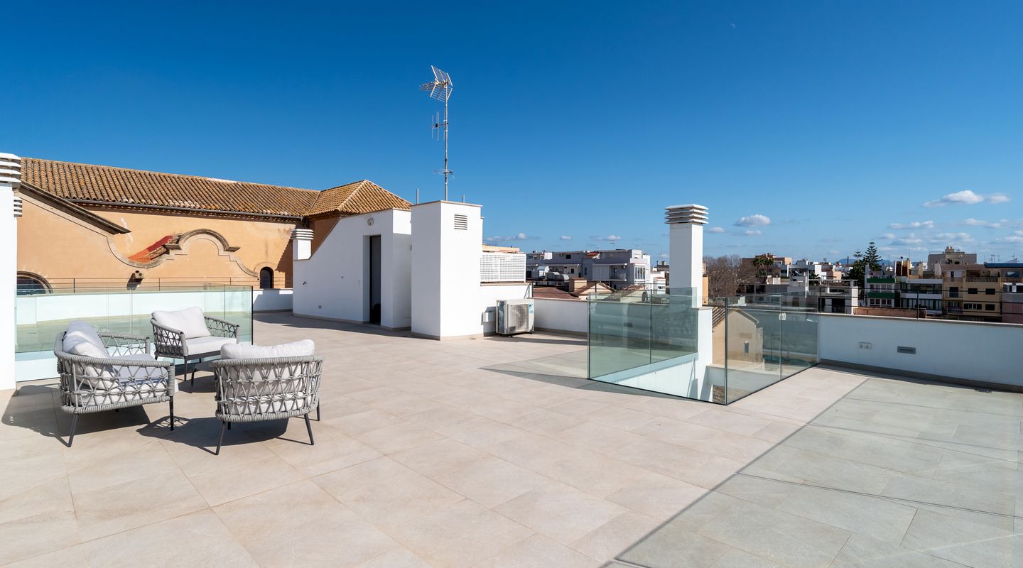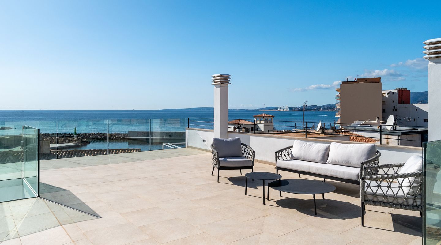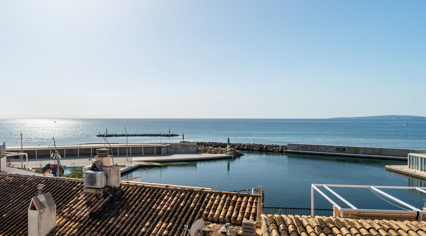 Detta nyss färdigställda spektakulära radhus har just blivit totalrenoverat och omfördelats till högsta standard. Läget precis intill havet i Portixol/Molinar är privilegierat och har blivit ett av Palmas mest populära områden.Radhuset på ca 360 kvm har två våningar, som är uppdelade i ett huvudhus och en studio. Studion på cirka 70 kvadratmeter erbjuder ett vardagsrum-matsal och alla nödvändiga anslutningar för att sätta upp ett kök, ett dubbelrum med inbyggd garderob, ett privat badrum och två terrasser. Studion är perfekt som gästlägenhet. I den andra delen av första våningen finns två dubbelrum med inbyggda garderober och två badrum. Från denna del av huset leder en bred trappa till andra våningen, som erbjuder ett öppet, ljust vardagsrum med öppet kök.På denna nivå finns också det rymliga sovrummet med omklädningsrum, badrum ensuite och en gästtoalett.. På övervåningen finns en stor soltakterrass på ca 150 m2 med hisnande utsikt över havet och de charmiga omgivningarna i en gammal mallorkinsk fiskeby som inte har förlorat sin charm. En hiss och ett privat garage kompletterar denna fastighet.