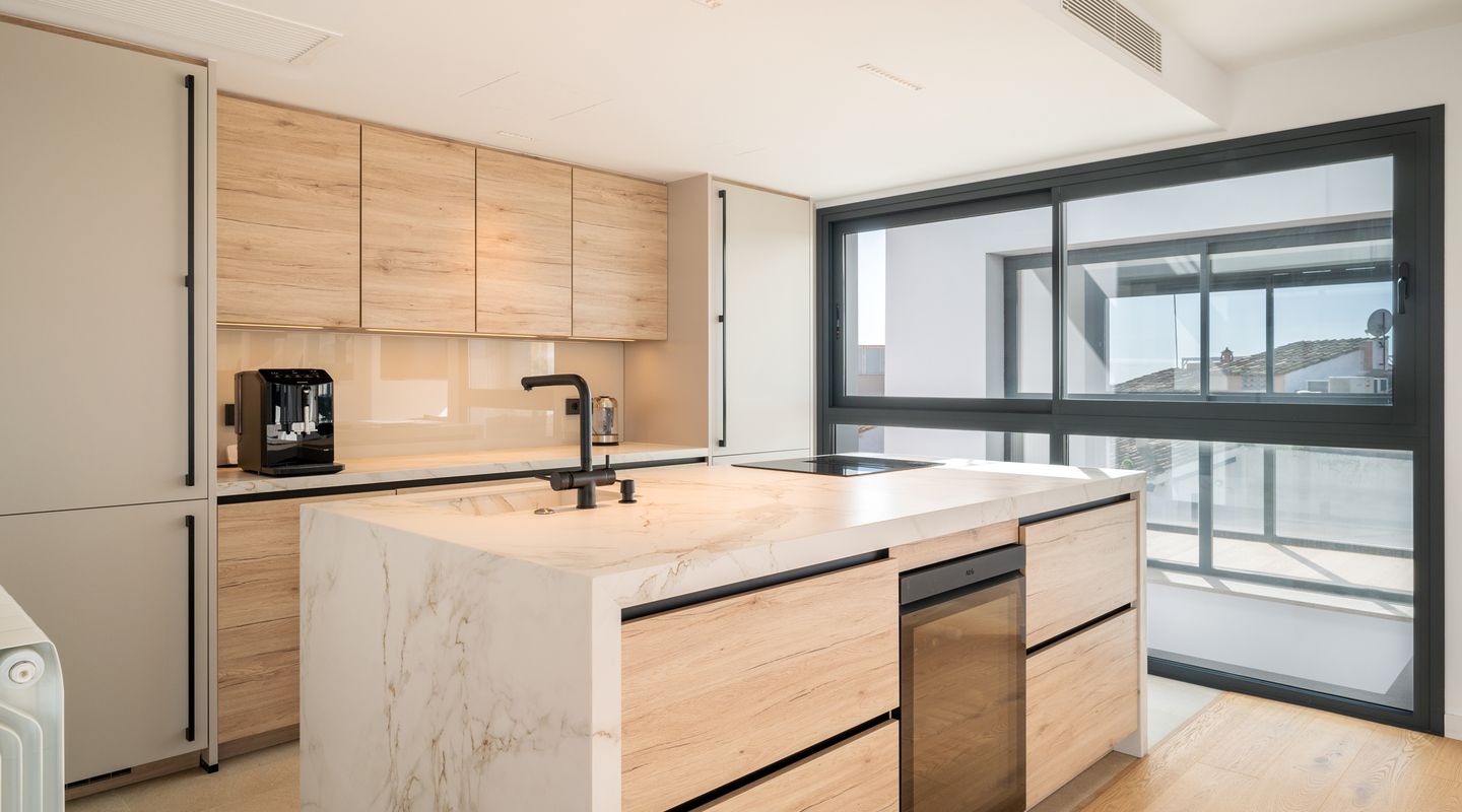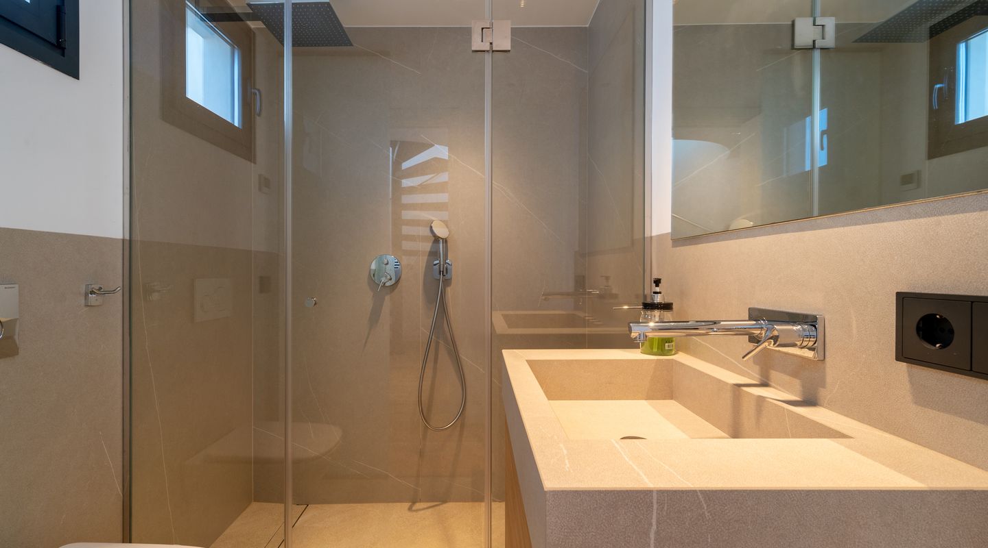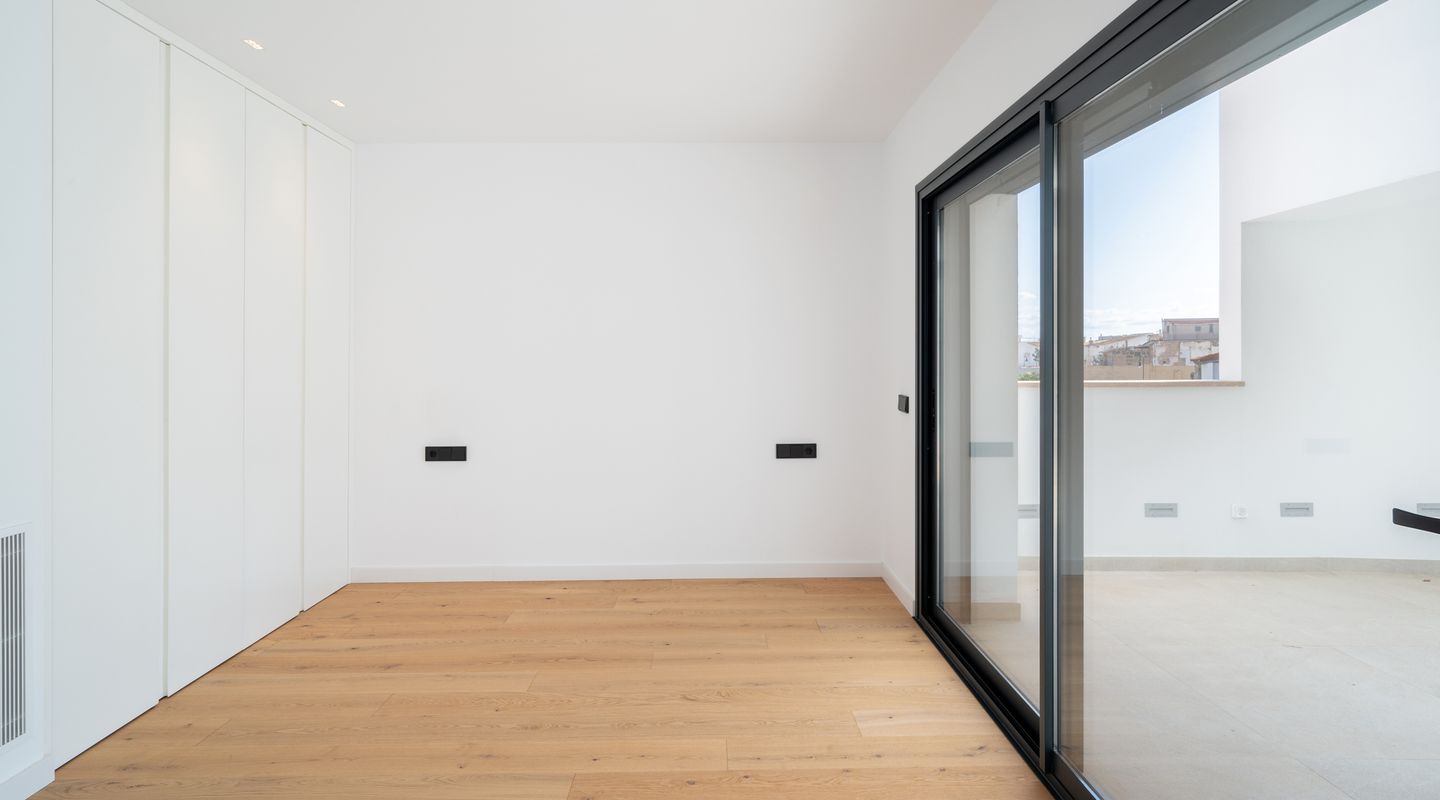 Detta nyss färdigställda spektakulära radhus har just blivit totalrenoverat och omfördelats till högsta standard. Läget precis intill havet i Portixol/Molinar är privilegierat och har blivit ett av Palmas mest populära områden.Radhuset på ca 360 kvm har två våningar, som är uppdelade i ett huvudhus och en studio. Studion på cirka 70 kvadratmeter erbjuder ett vardagsrum-matsal och alla nödvändiga anslutningar för att sätta upp ett kök, ett dubbelrum med inbyggd garderob, ett privat badrum och två terrasser. Studion är perfekt som gästlägenhet. I den andra delen av första våningen finns två dubbelrum med inbyggda garderober och två badrum. Från denna del av huset leder en bred trappa till andra våningen, som erbjuder ett öppet, ljust vardagsrum med öppet kök.På denna nivå finns också det rymliga sovrummet med omklädningsrum, badrum ensuite och en gästtoalett.. På övervåningen finns en stor soltakterrass på ca 150 m2 med hisnande utsikt över havet och de charmiga omgivningarna i en gammal mallorkinsk fiskeby som inte har förlorat sin charm. En hiss och ett privat garage kompletterar denna fastighet.