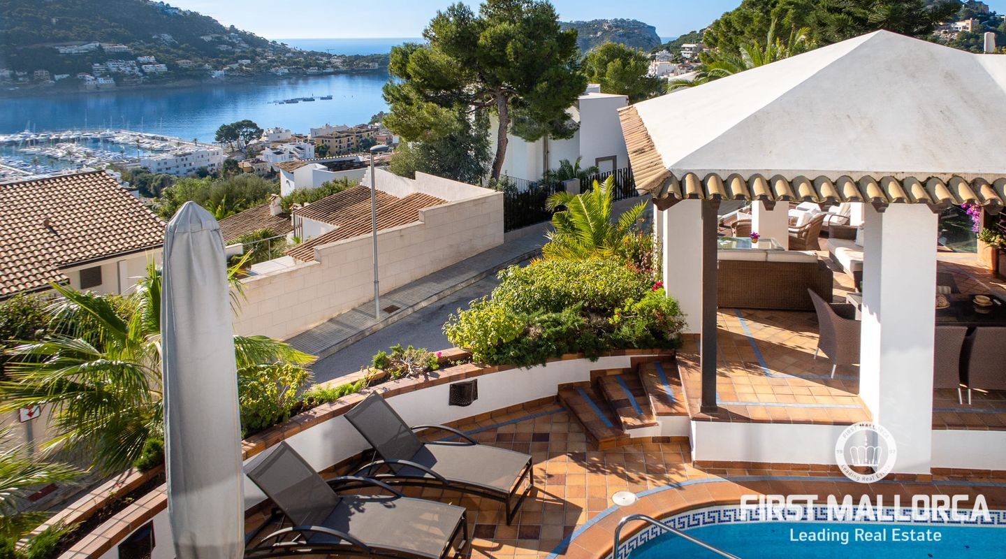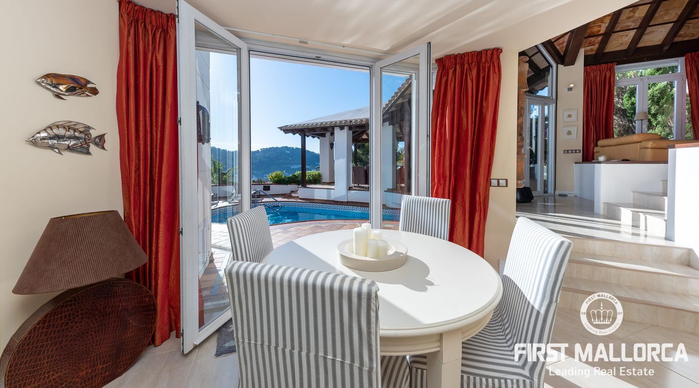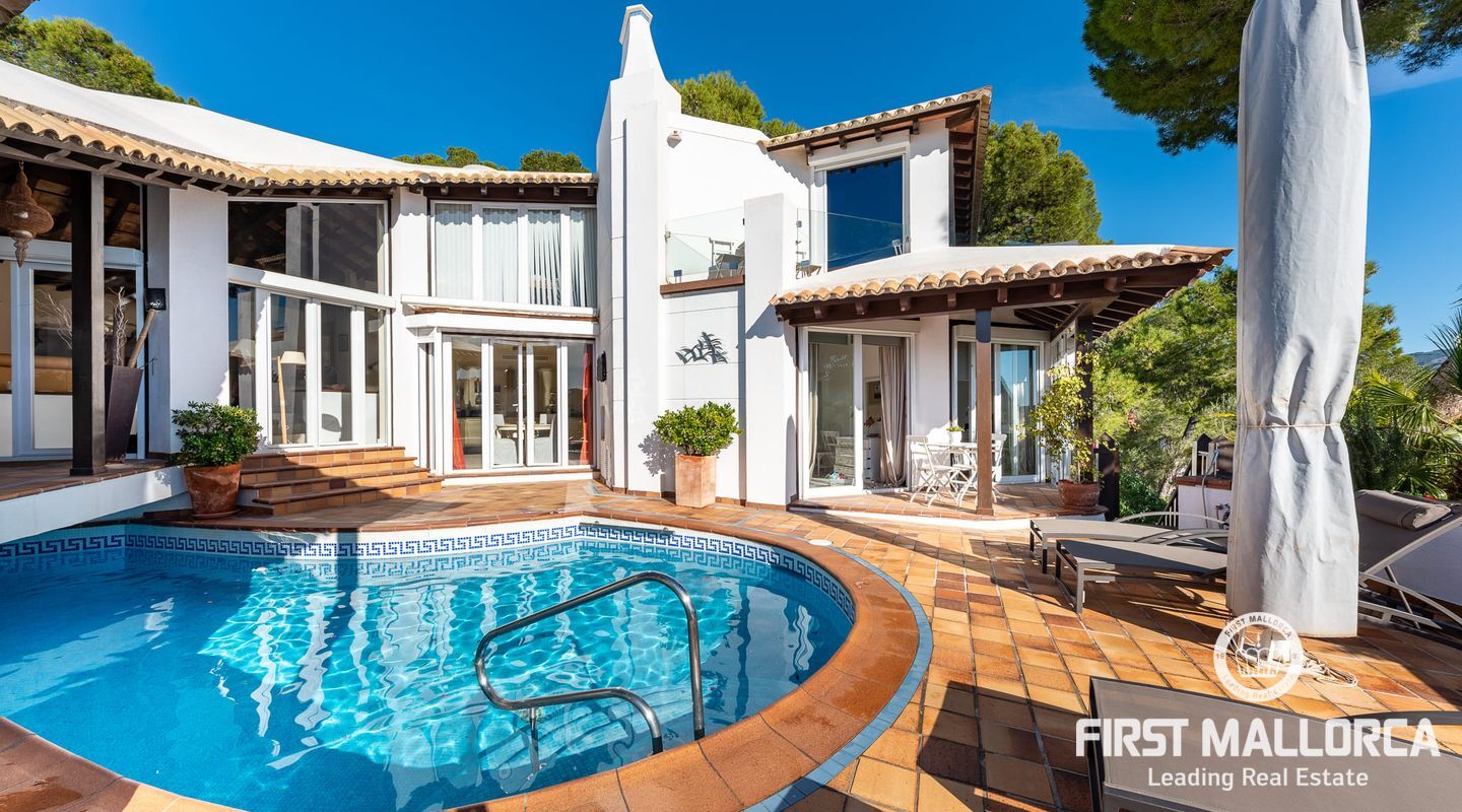 Den här fantastiska villan med måsar är ett riktigt hem med ett hjärta som väntar på att du ska komma och njuta av Medelhavsstilen med blå himmel och avkoppling på Mallorca. Huset är utformat med tanken på en mås i åtanke. Höga tak med träbjälkar, stora fönster och en pool som är integrerad i fastighetens trapphus vilket ger den en mycket originell touch, som ingen annan fastighet i Port Andratx. Med totalt 4 sovrum och 4 badrum, på bottenvåningen finns 2 rymliga och ljusa dubbelrum och 2 badrum, varav 1 med eget badrum. På den här nivån finns också det öppna vardagsrummet och matsalen som leder från köket. Den stora sviten ligger på övre plan med eget omklädningsrum och eget badrum. På denna nivå finns också ett kontor/konststudio i öppen planlösning. Det fjärde och sista sovrummet har en separat ingång med fullt badrum och gott om förvaringsutrymmen. Poolen är omgiven av en stor terrass och solbadplatser, och det finns en separat matplats med en täckt relaxavdelning vid poolen. En trädgård med gräsmatta, bougainvillor och ett citronträd kompletterar boendet. Alla har fantastisk havsutsikt. Det här huset är en dröm som går i uppfyllelse.