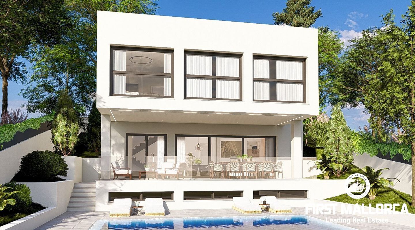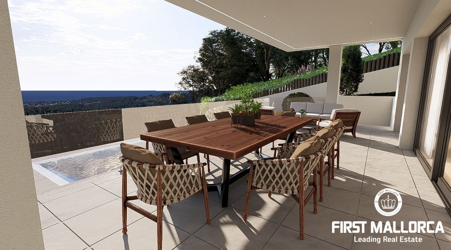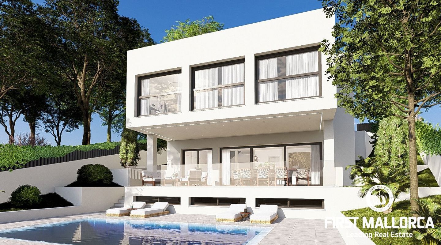 Denna moderna nya villa är för närvarande under uppbyggnad och förväntas stå färdig sommaren 2024. Den kommer att ha 4 sovrum på övervåningen, alla med eget badrum. Från denna nivå kommer du att ha en delvis havsutsikt. På bottenvåningen kommer det att finnas ett rymligt vardagsrum och matplats med öppen planlösning, som ansluter direkt till terrassen och poolområdet. Här kan du njuta av de många timmarna av Mallorcas solsken till fullo, med fastigheten som är omgiven av gamla träd och erbjuder en hög nivå av integritet. Det hela avrundas av en källare där t.ex. ett gym, en vinkällare eller en hemmabio kunde hitta sin plats.