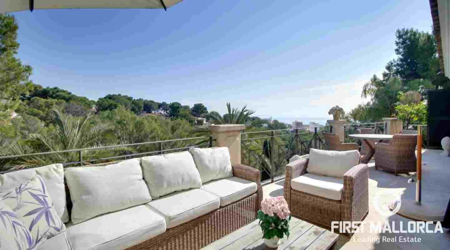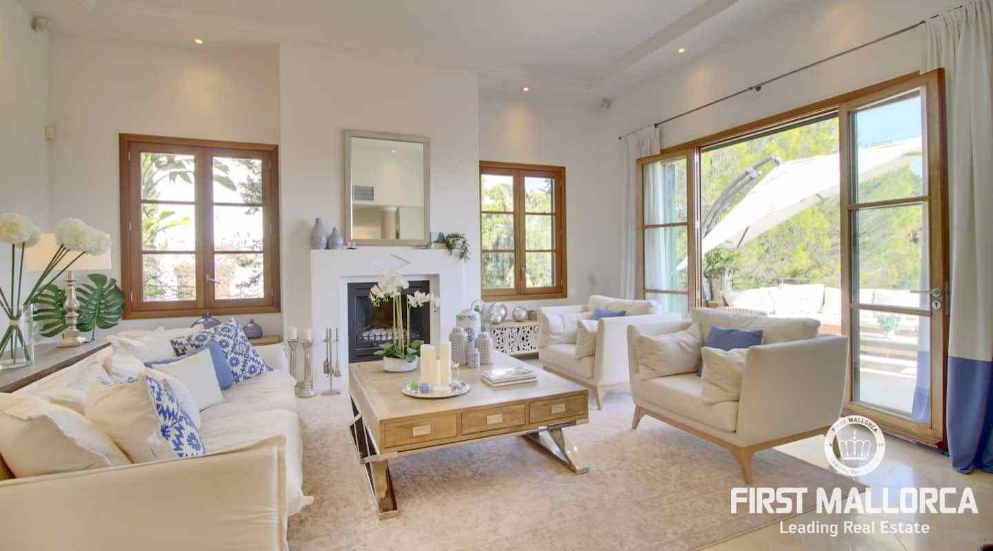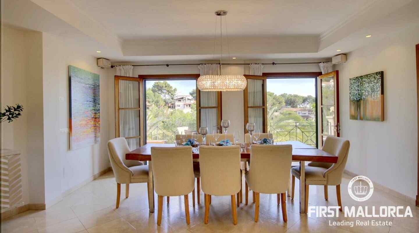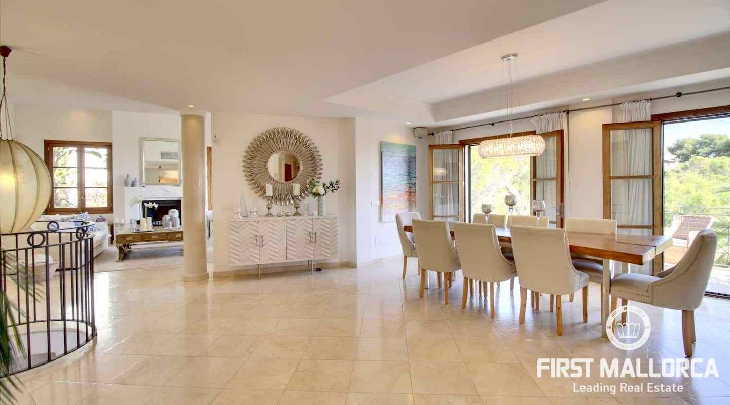 Magnifik villa till salu i Costa D'en Blanes, med panoramautsikt över dalen. Fastigheten är fördelad på två våningar. Ingången på övervåningen leder till ett rymligt vardagsrum med matsal med utsikt, som är anslutet till ett annat vardagsrum med öppen spis, båda anslutna till en terrass med utsikt över poolen. Köket med ö är anslutet till vardagsrummet, en gästtoalett och tvättstugan. Fastigheten har ett garageutrymme för två bilar, som för närvarande används som ett spelrum.
