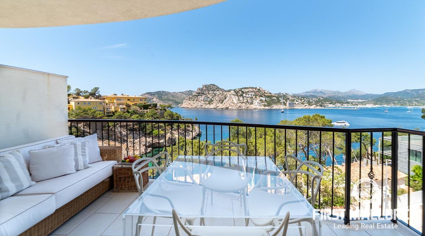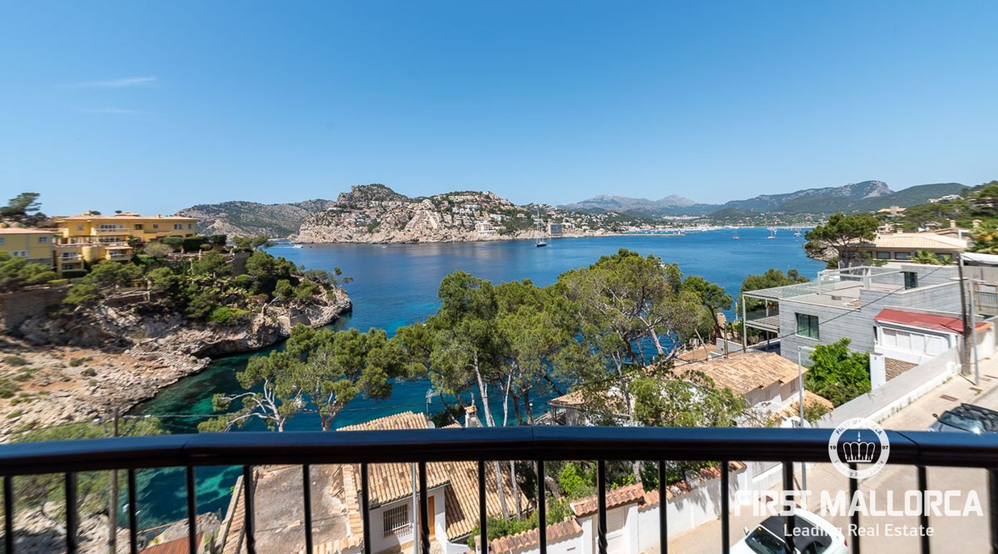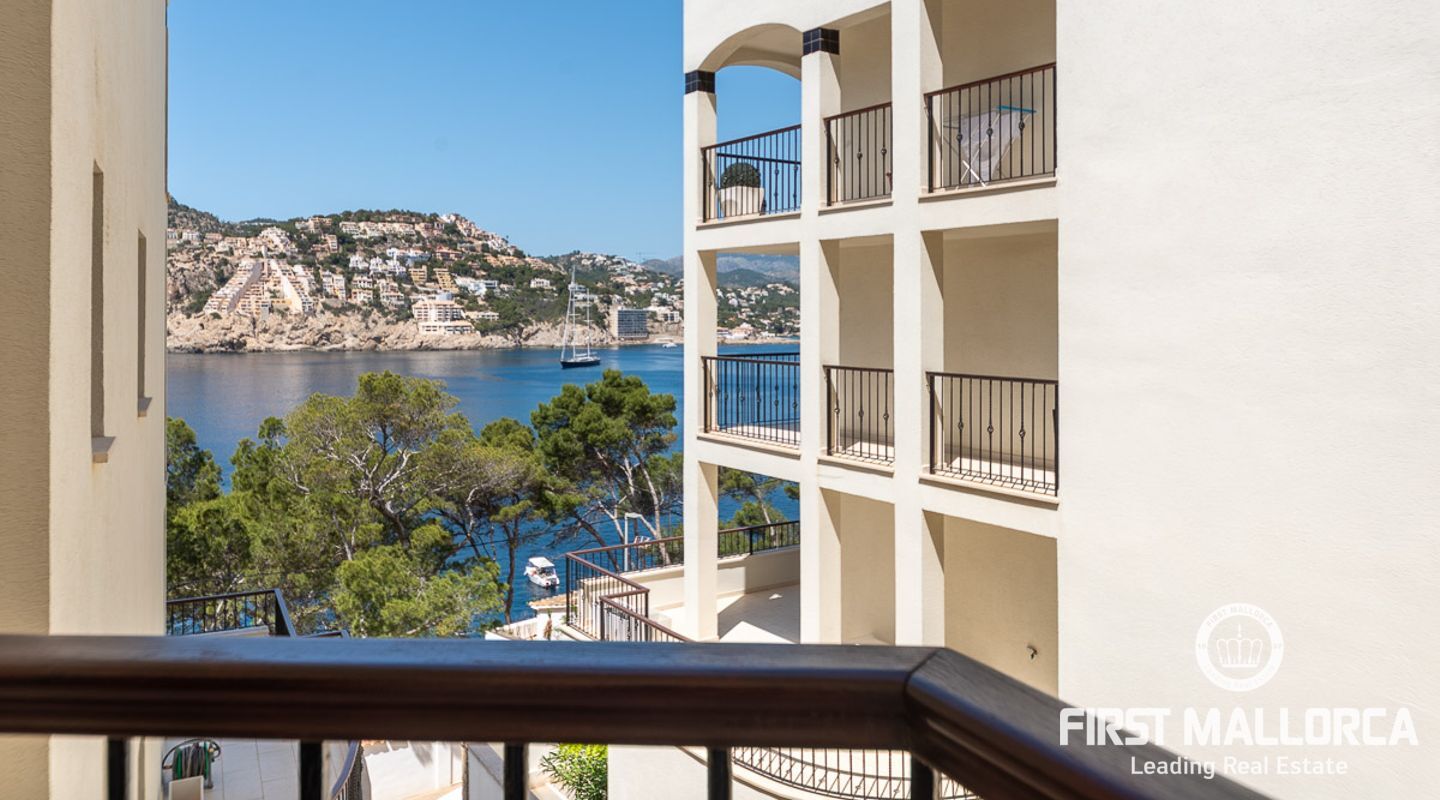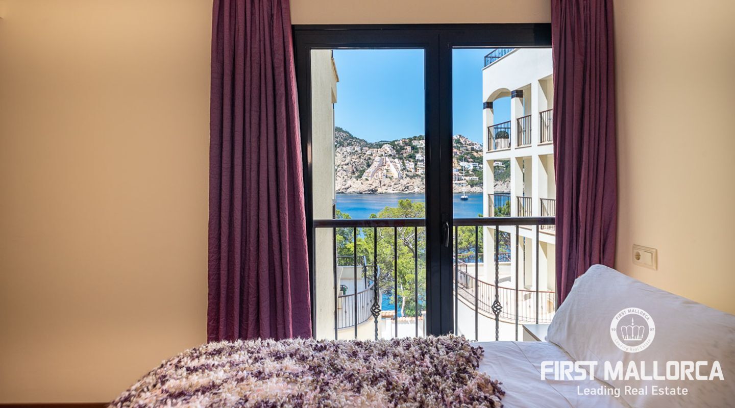 Schöne und gepflegte 2-Schlafzimmer-Wohnung mit 2 Bädern und wunderschönem, offenem Panoramablick auf das Meer, wo Sie die Boote beobachten können, die in und aus dem Hafen kommen. Die Wohnung verfügt über ein offenes Wohnzimmer, ein Esszimmer und eine Küche mit Kochinsel sowie eine separate Waschküche. Beide Schlafzimmer verfügen über Ankleideräume. Die Ausstattung ist ausgezeichnet in der ganzen Wohnung. Große Terrasse mit Meerblick, Gemeinschaftspool und direkter Zugang zum Meer. 1 private Garage und 1 Abstellraum sind im Verkaufspreis enthalten. Klimaanlage warm/kalt und Fußbodenheizung. Die perfekte Immobilie, um Puerto de Andratx zu genießen.