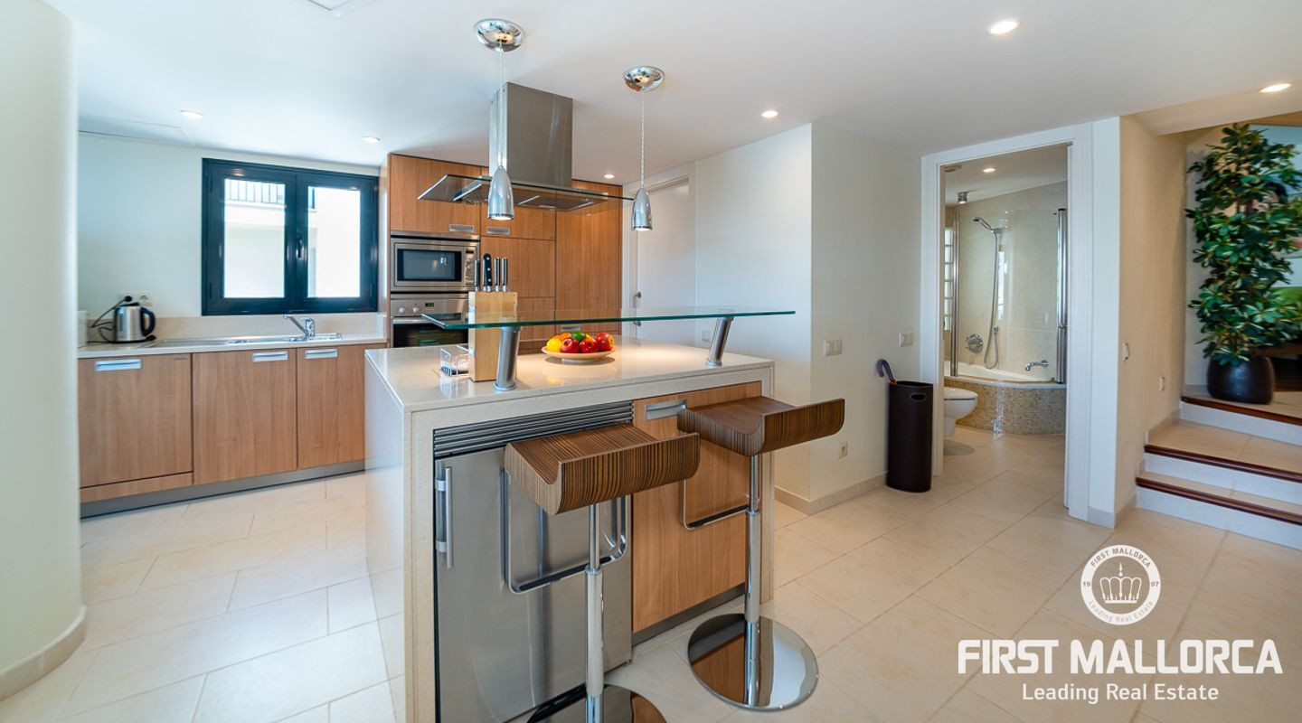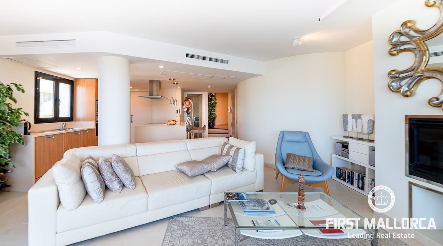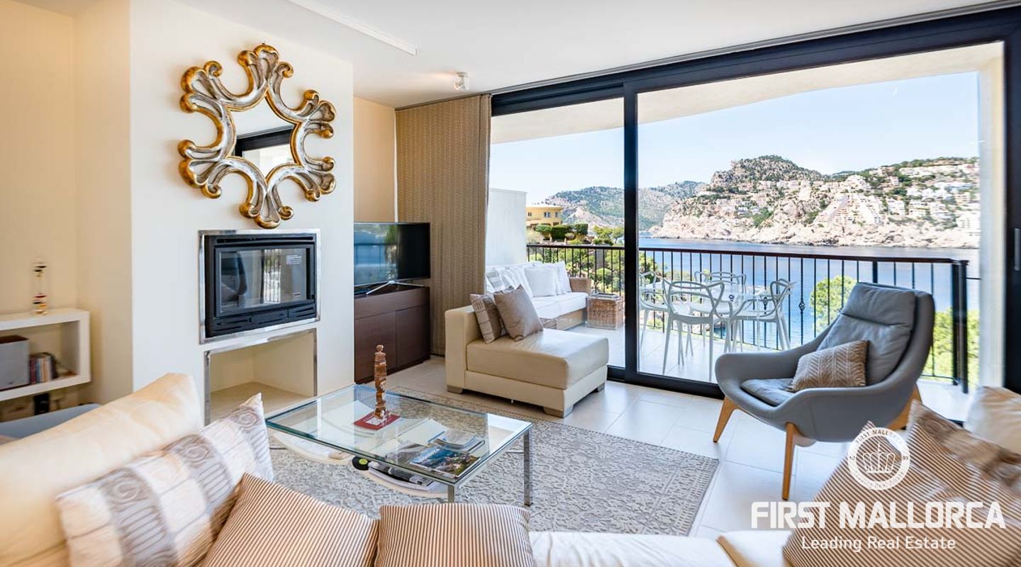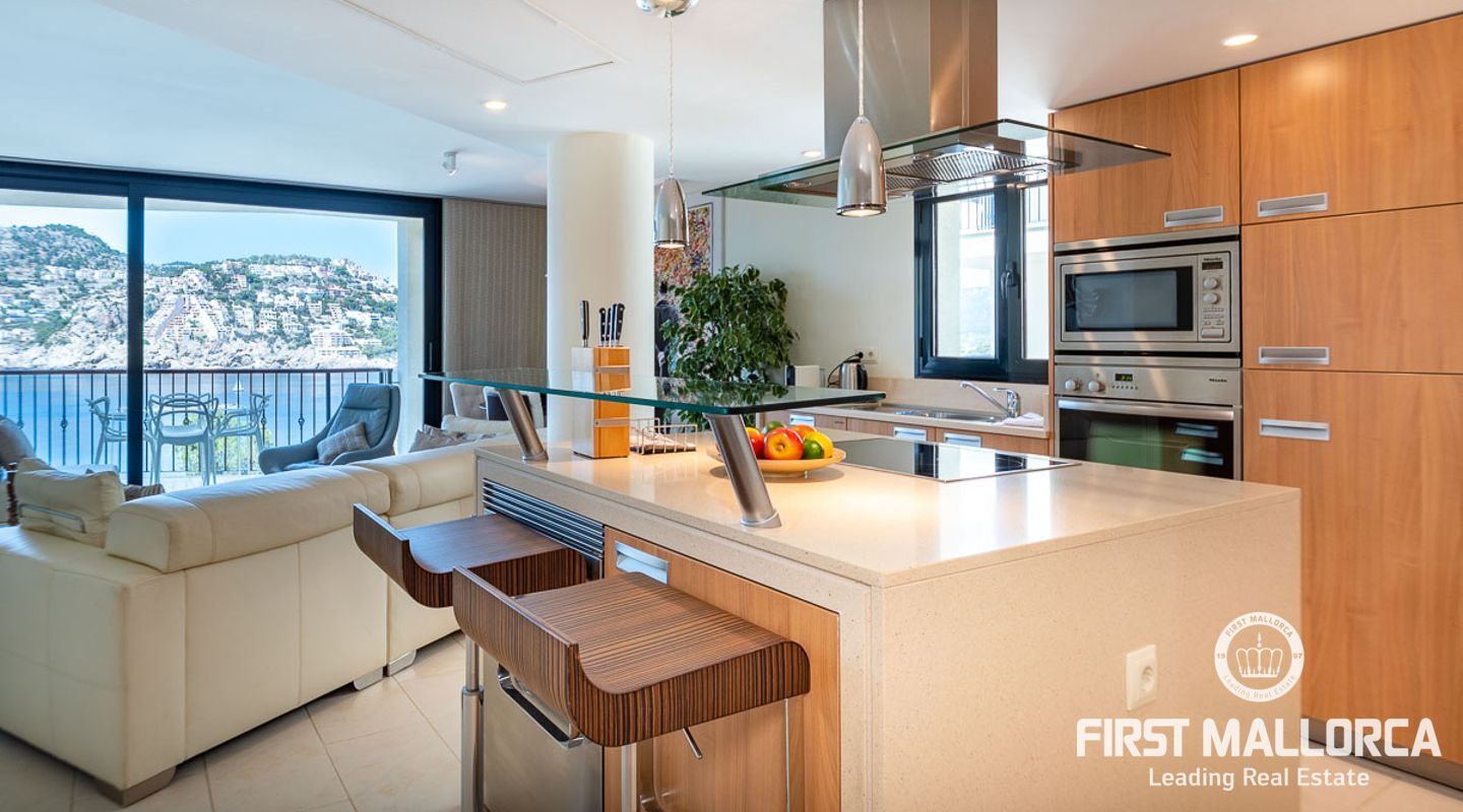 Schöne und gepflegte 2-Schlafzimmer-Wohnung mit 2 Bädern und wunderschönem, offenem Panoramablick auf das Meer, wo Sie die Boote beobachten können, die in und aus dem Hafen kommen. Die Wohnung verfügt über ein offenes Wohnzimmer, ein Esszimmer und eine Küche mit Kochinsel sowie eine separate Waschküche. Beide Schlafzimmer verfügen über Ankleideräume. Die Ausstattung ist ausgezeichnet in der ganzen Wohnung. Große Terrasse mit Meerblick, Gemeinschaftspool und direkter Zugang zum Meer. 1 private Garage und 1 Abstellraum sind im Verkaufspreis enthalten. Klimaanlage warm/kalt und Fußbodenheizung. Die perfekte Immobilie, um Puerto de Andratx zu genießen.