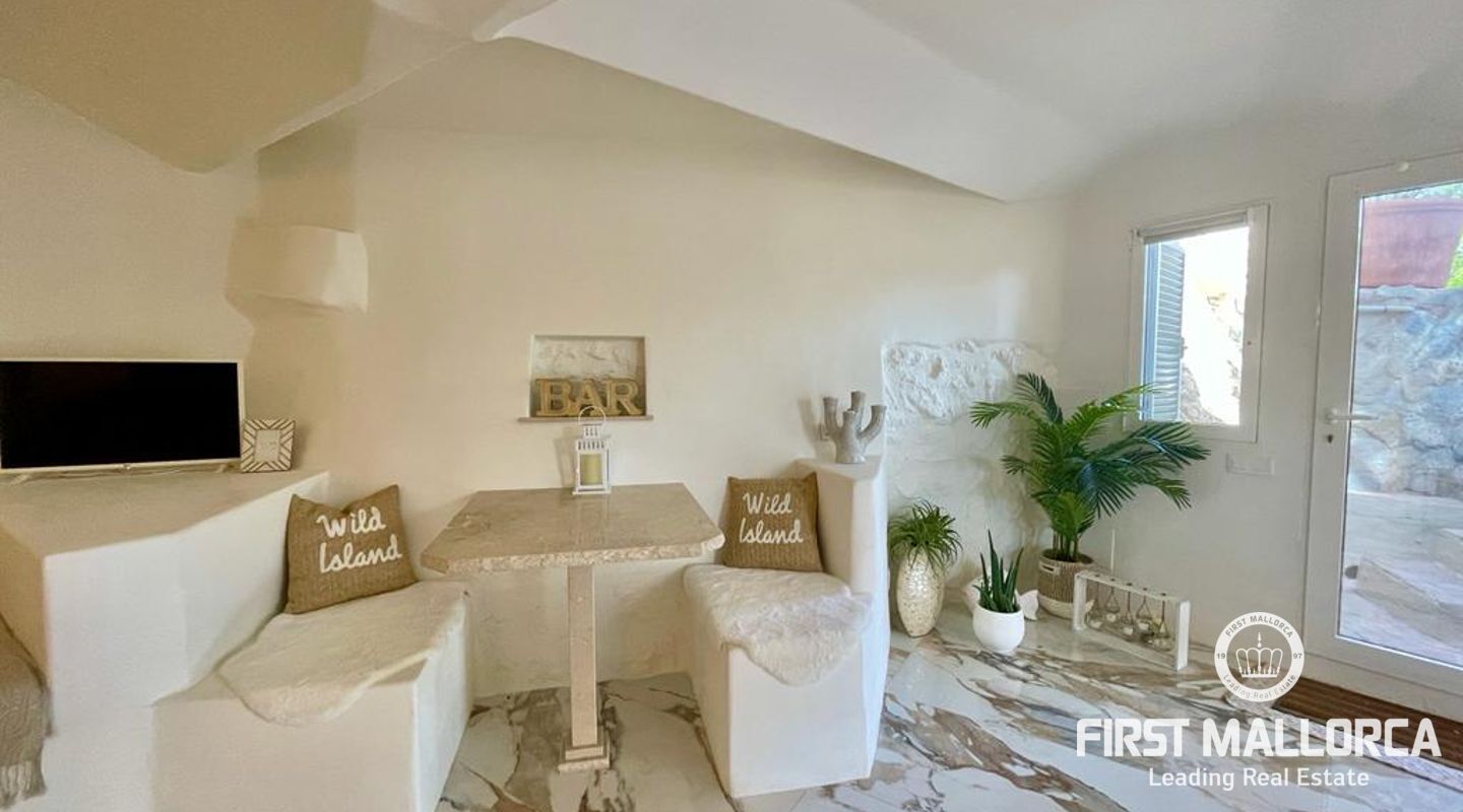 Des Weiteren gibt es ein Bett und eine Essecke. Das Badezimmer ist mit Regen- und Flutdusche ausgestattet und bietet des Weiteren einen Abstellplatz für Waschmaschine usw. Die Terrasse offeriert Platz für Stühle und einen Tisch, um den Meerblick zu genießen.